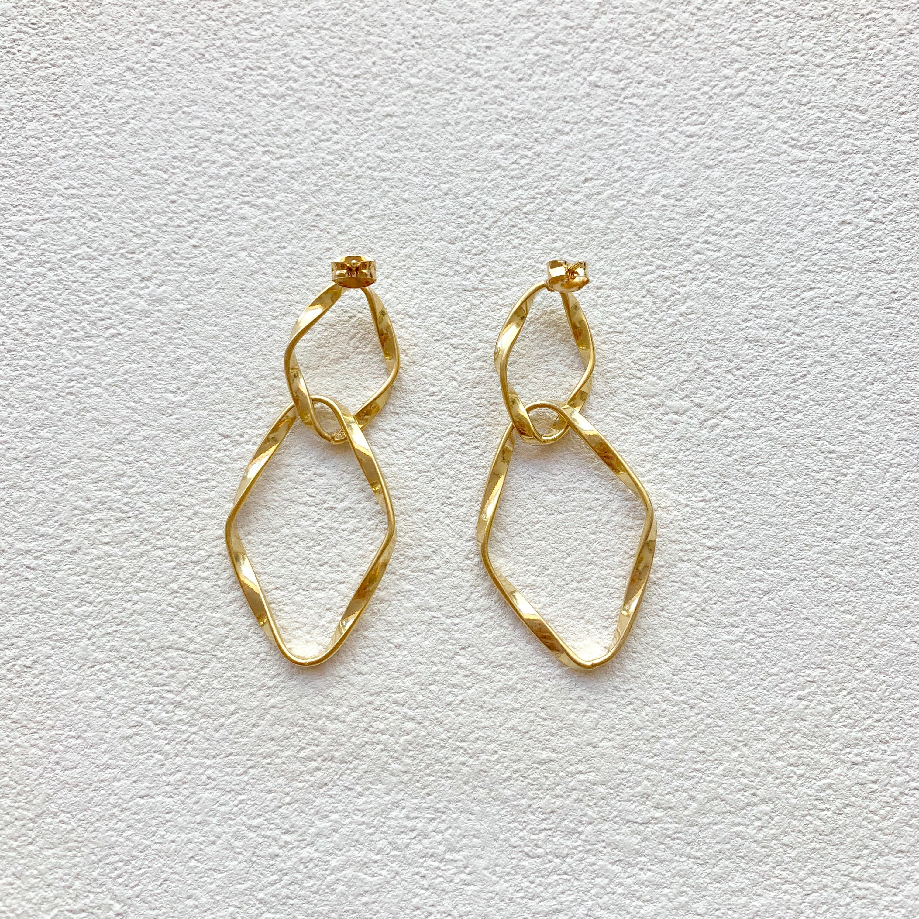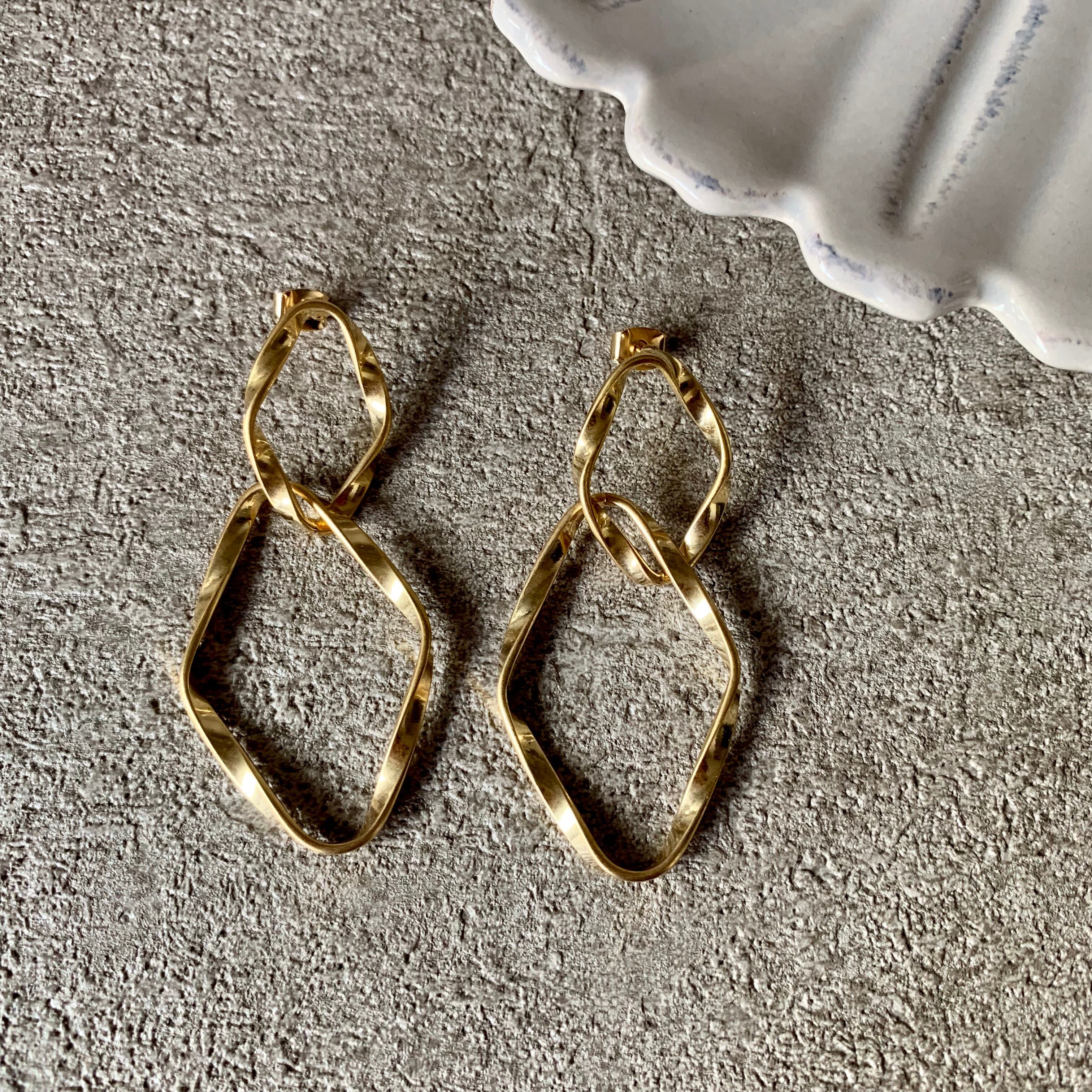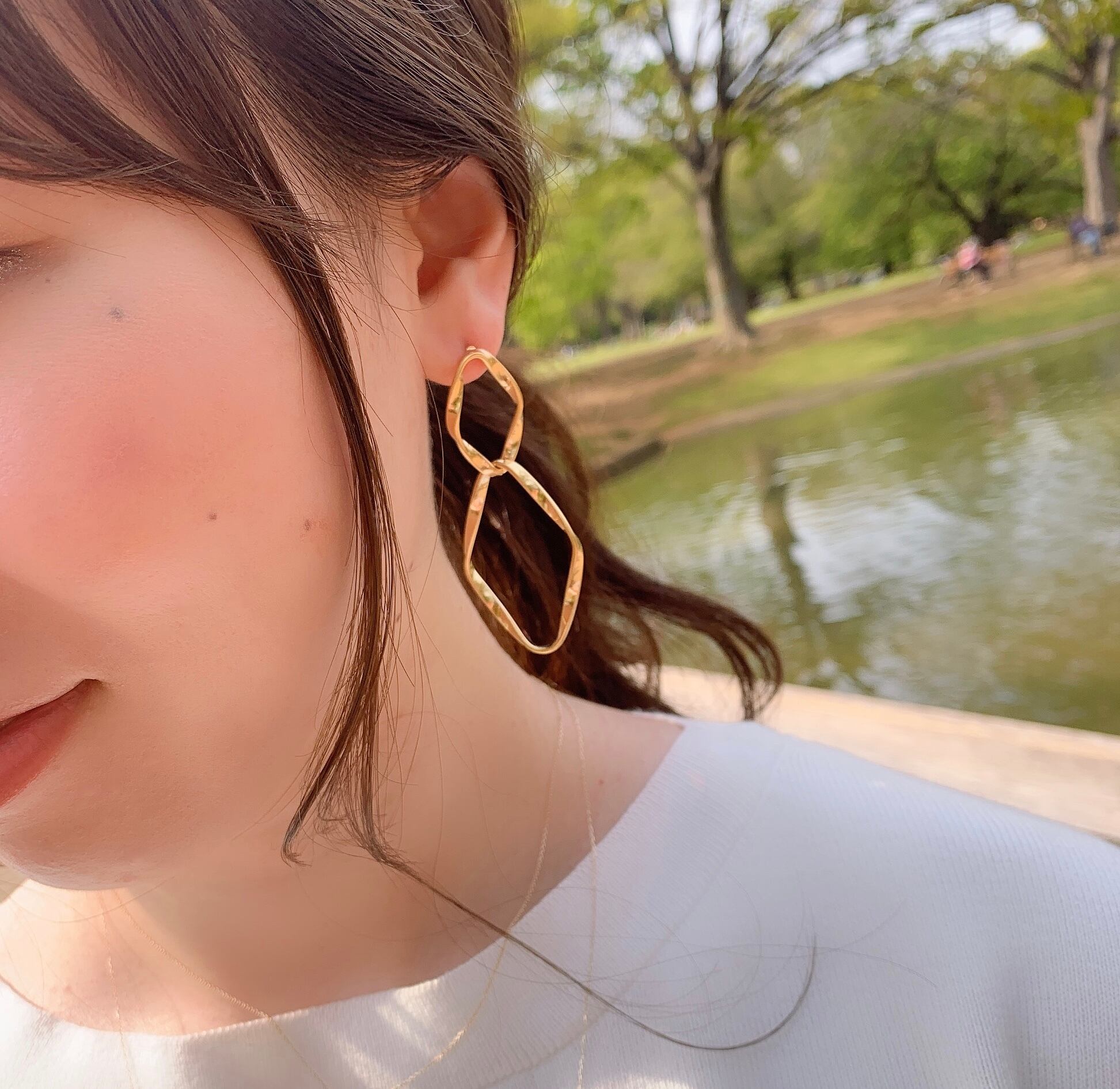 ダブル変形フープピアスは、耳元のアクセントはもちろん、動きに合わせて揺れるデザインなので、女性らしさをより一層引き立ててくれます。