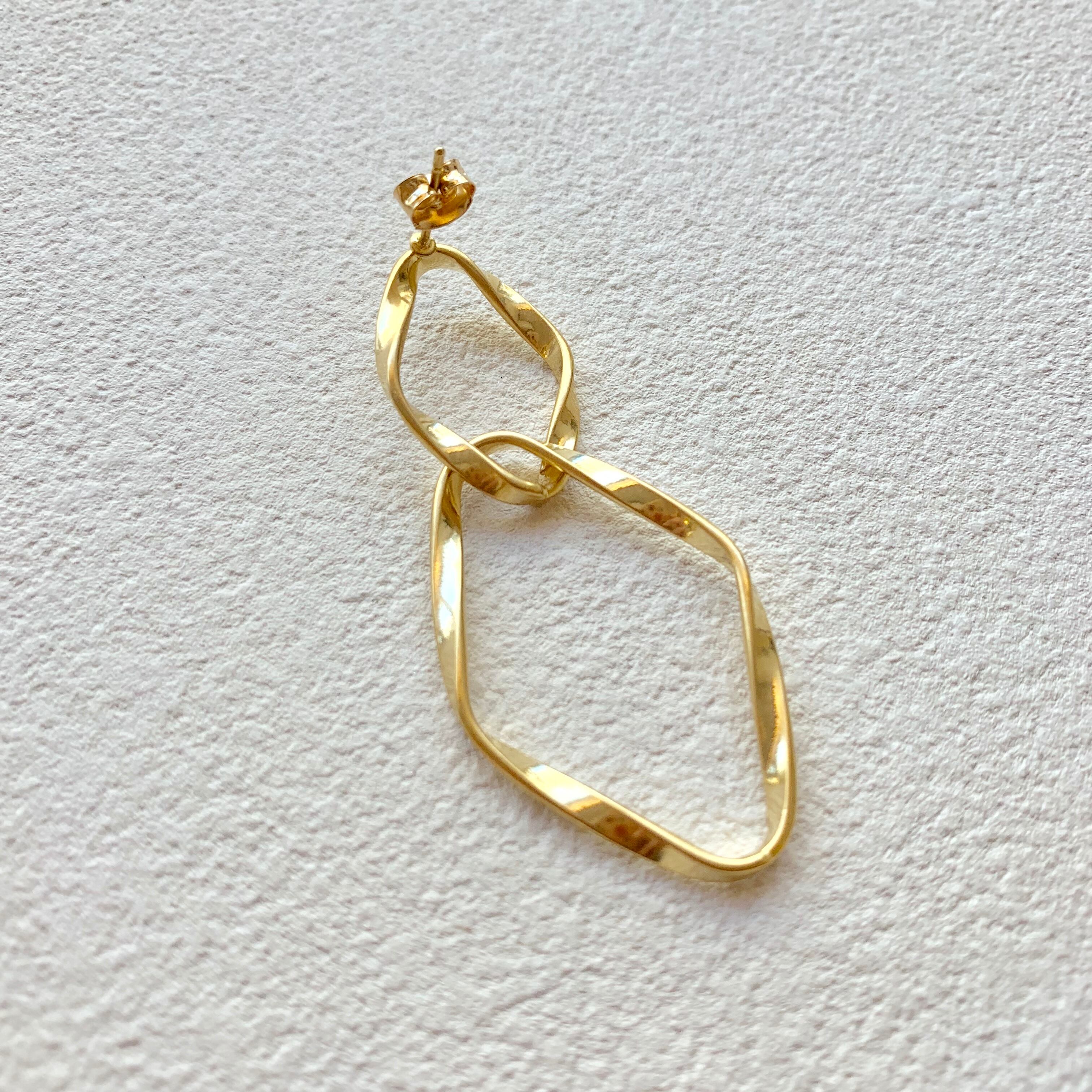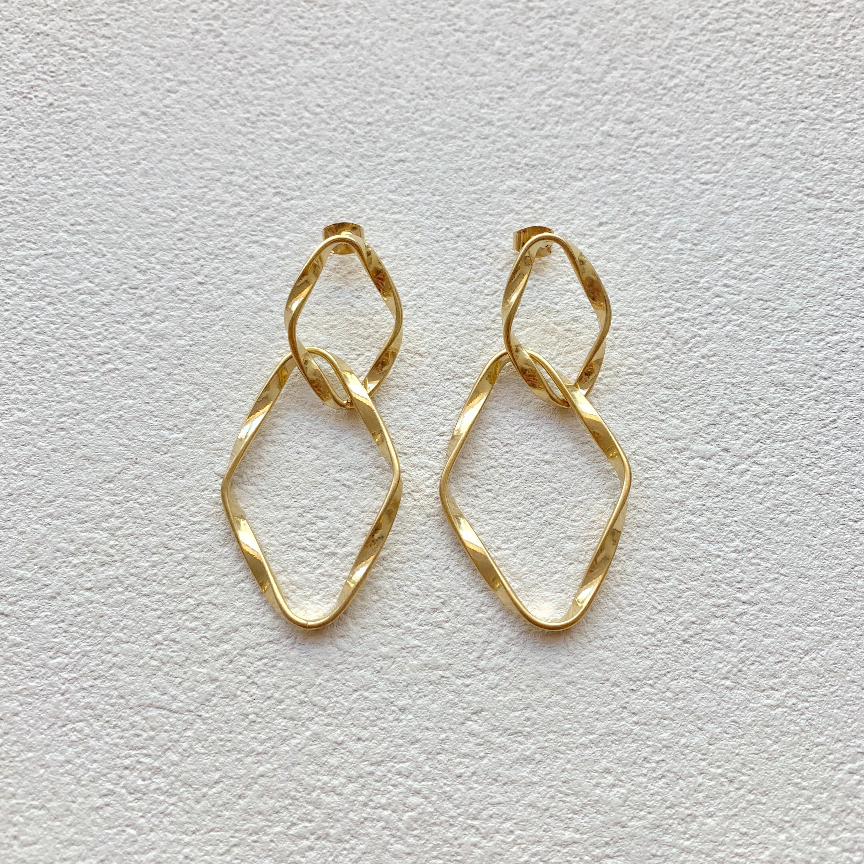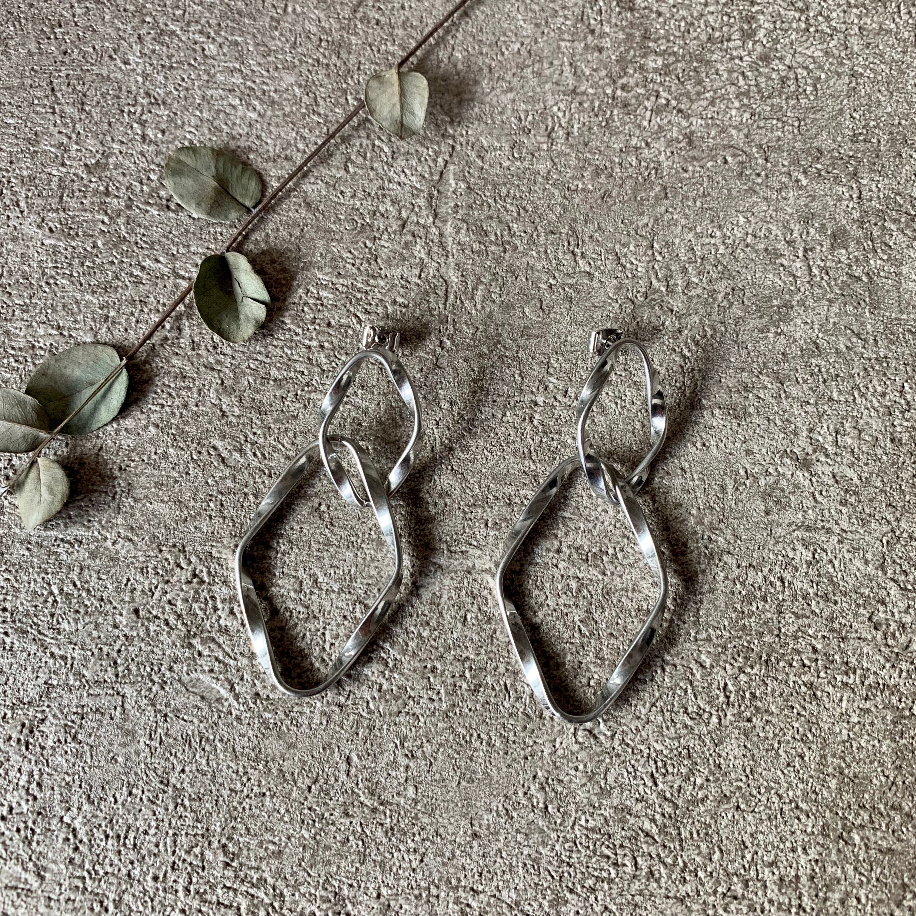 ダブル変形フープピアスは、耳元のアクセントはもちろん、動きに合わせて揺れるデザインなので、女性らしさをより一層引き立ててくれます。