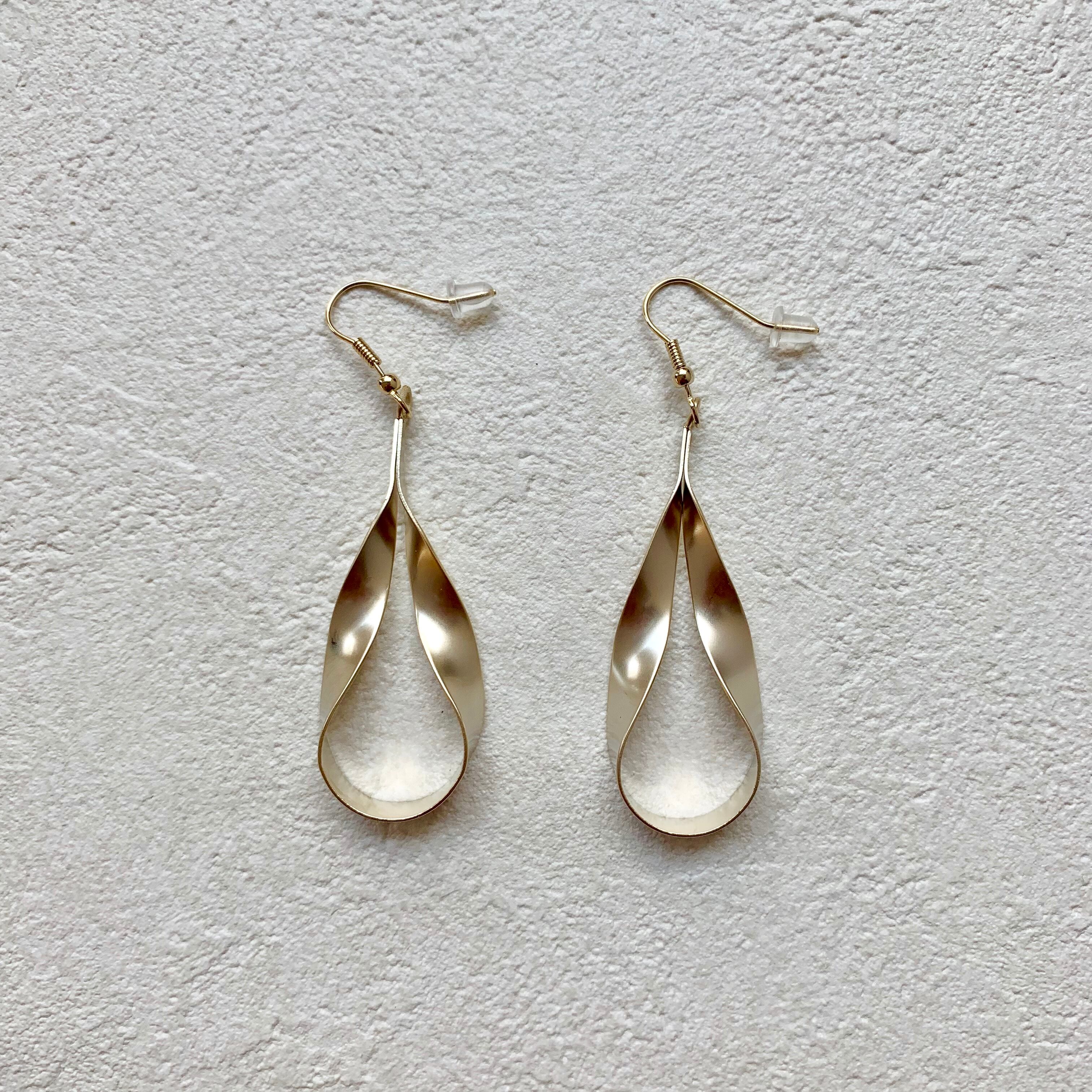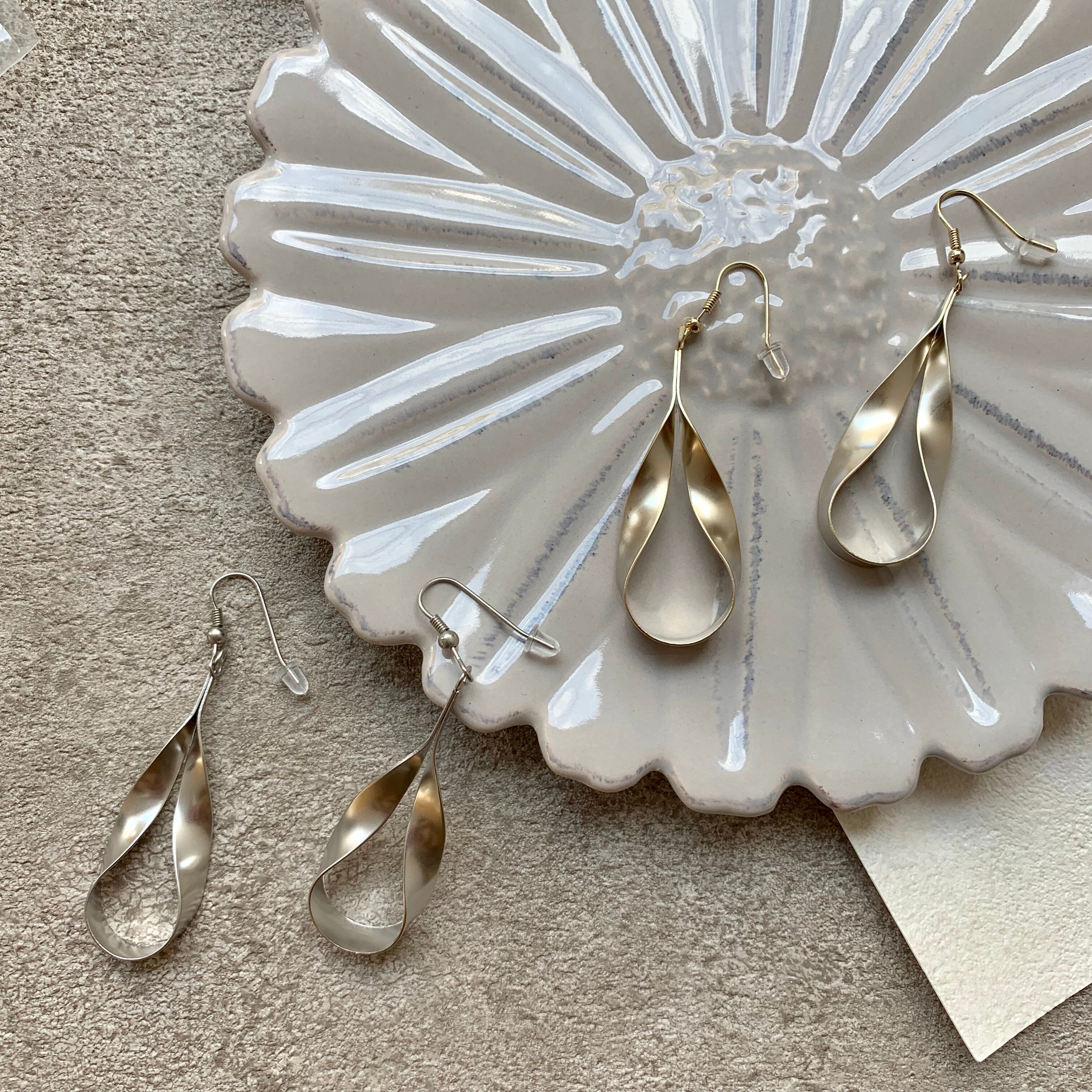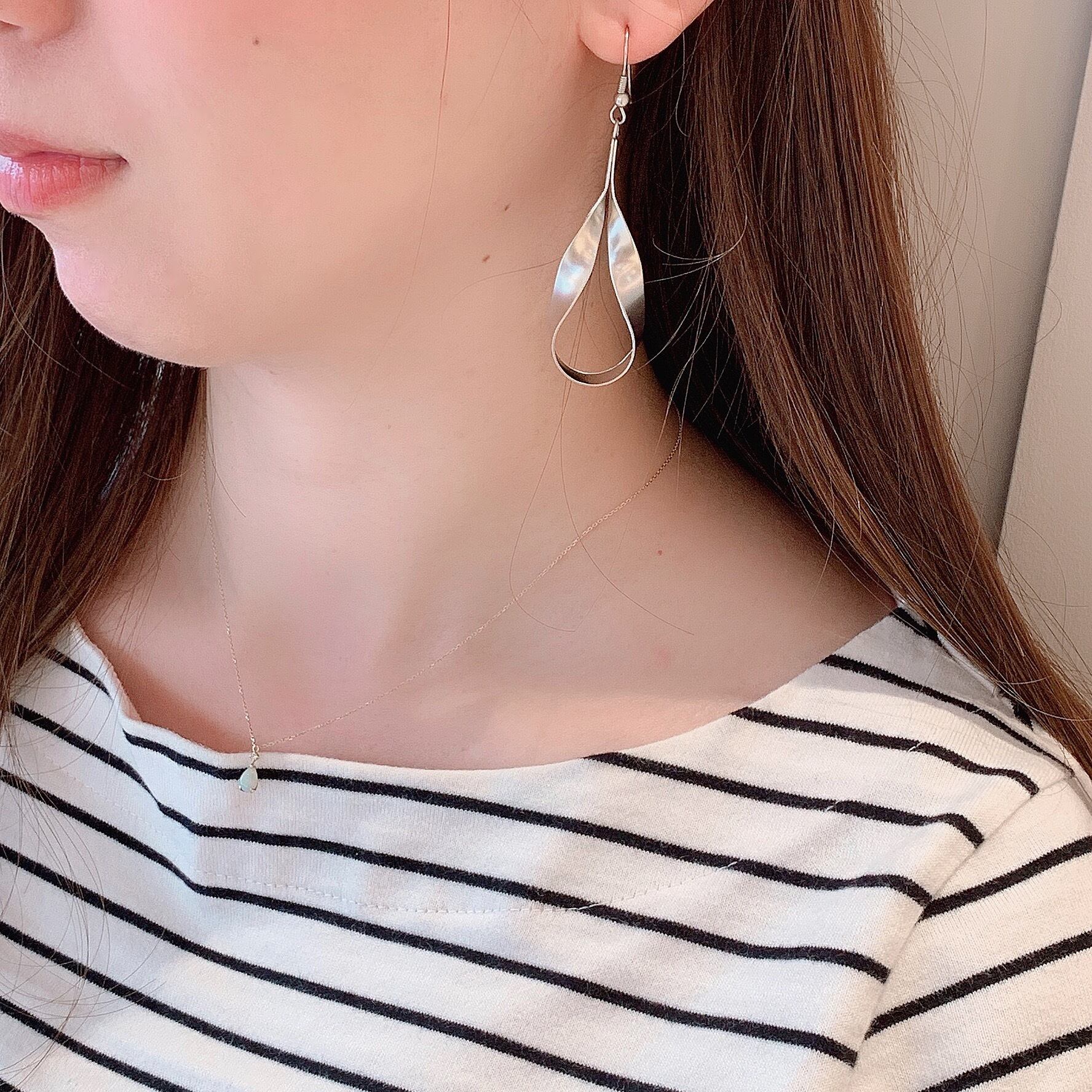 ひねりを加えたしずく型揺れピアスは、女性らしい柔らかなニュアンスで耳元を華やかに彩ります。