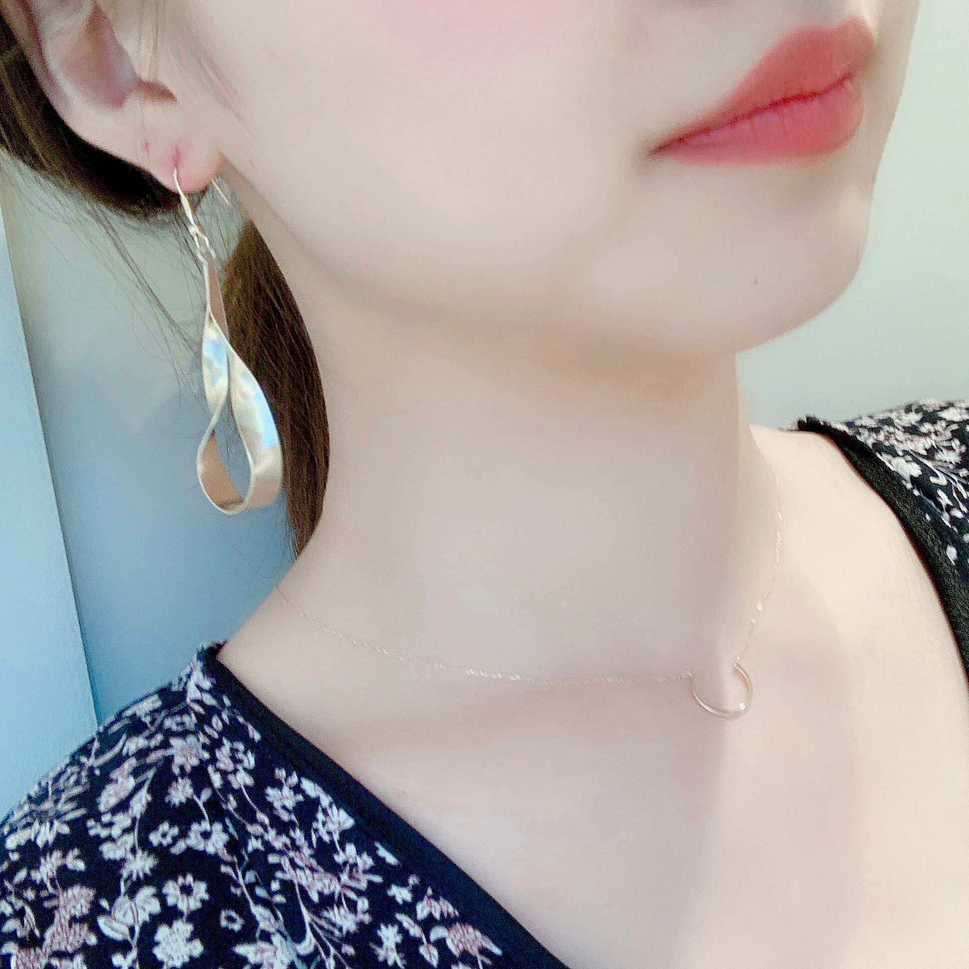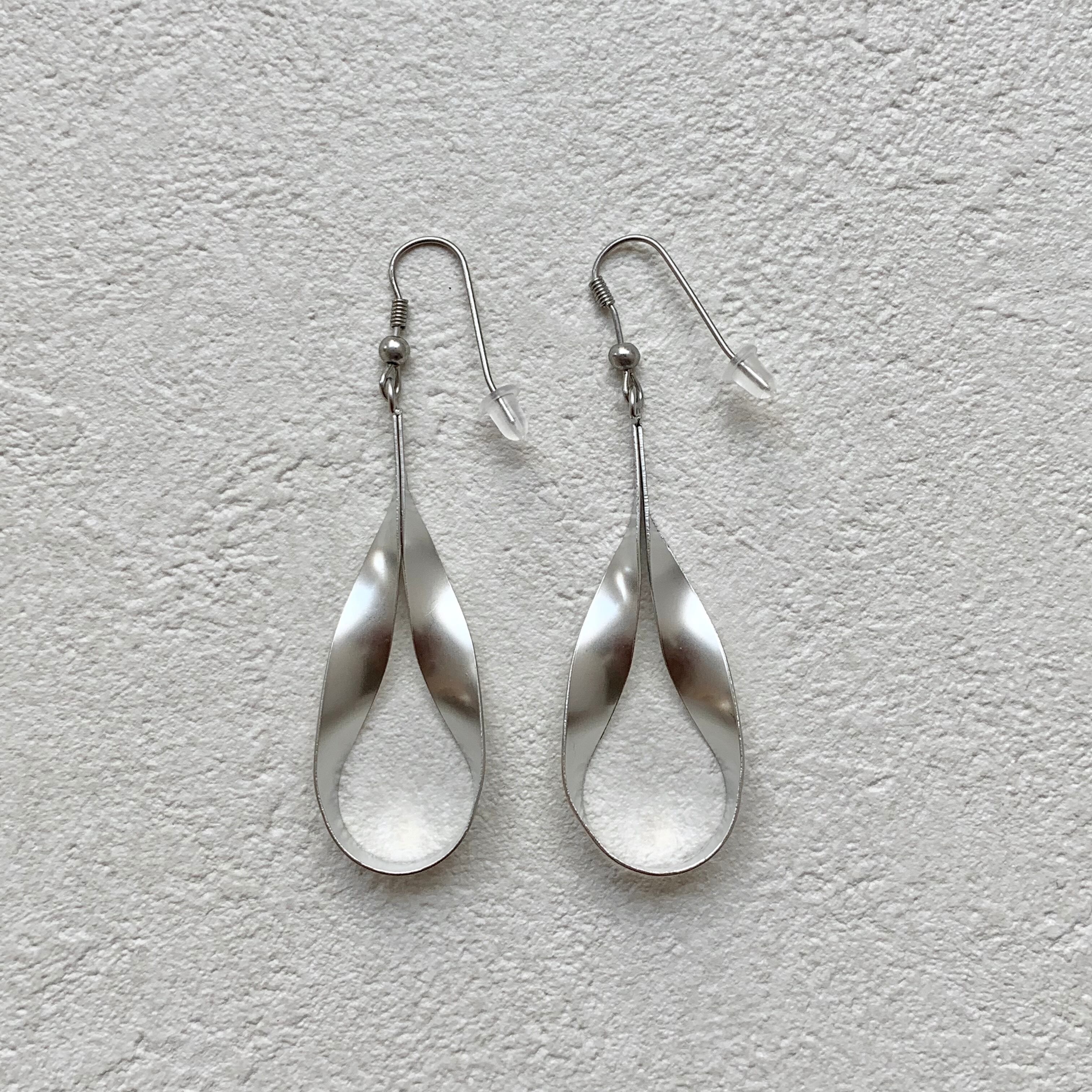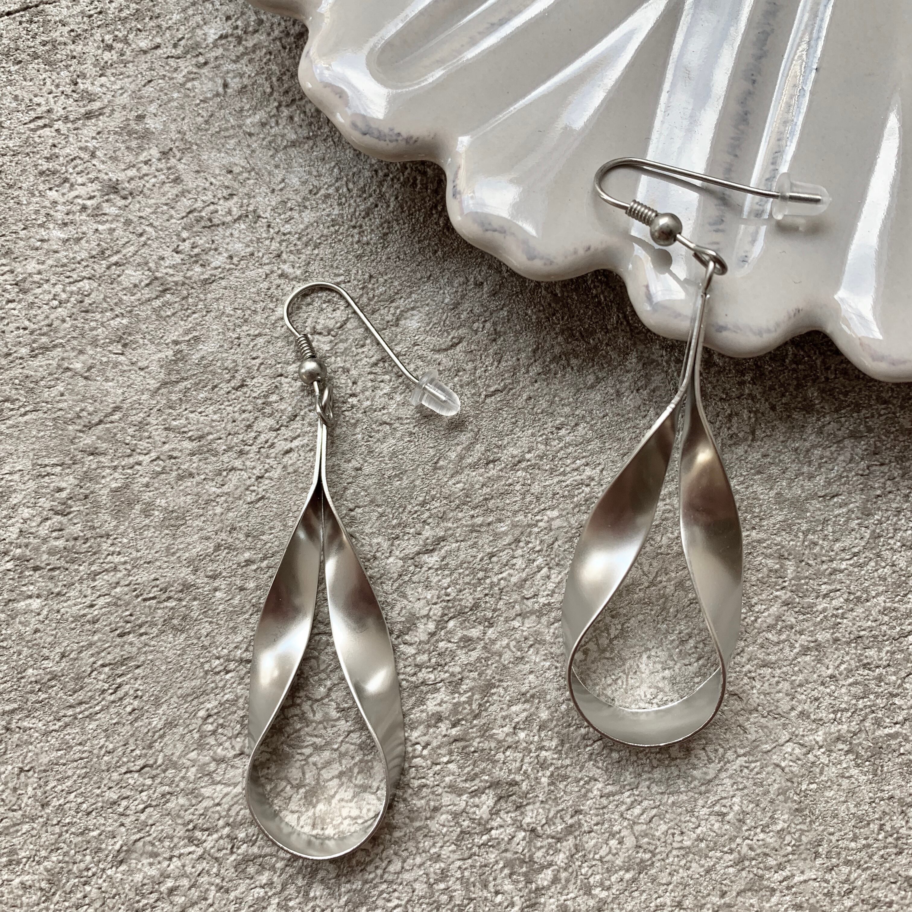 ひねりを加えたしずく型揺れピアスは、女性らしい柔らかなニュアンスで耳元を華やかに彩ります。