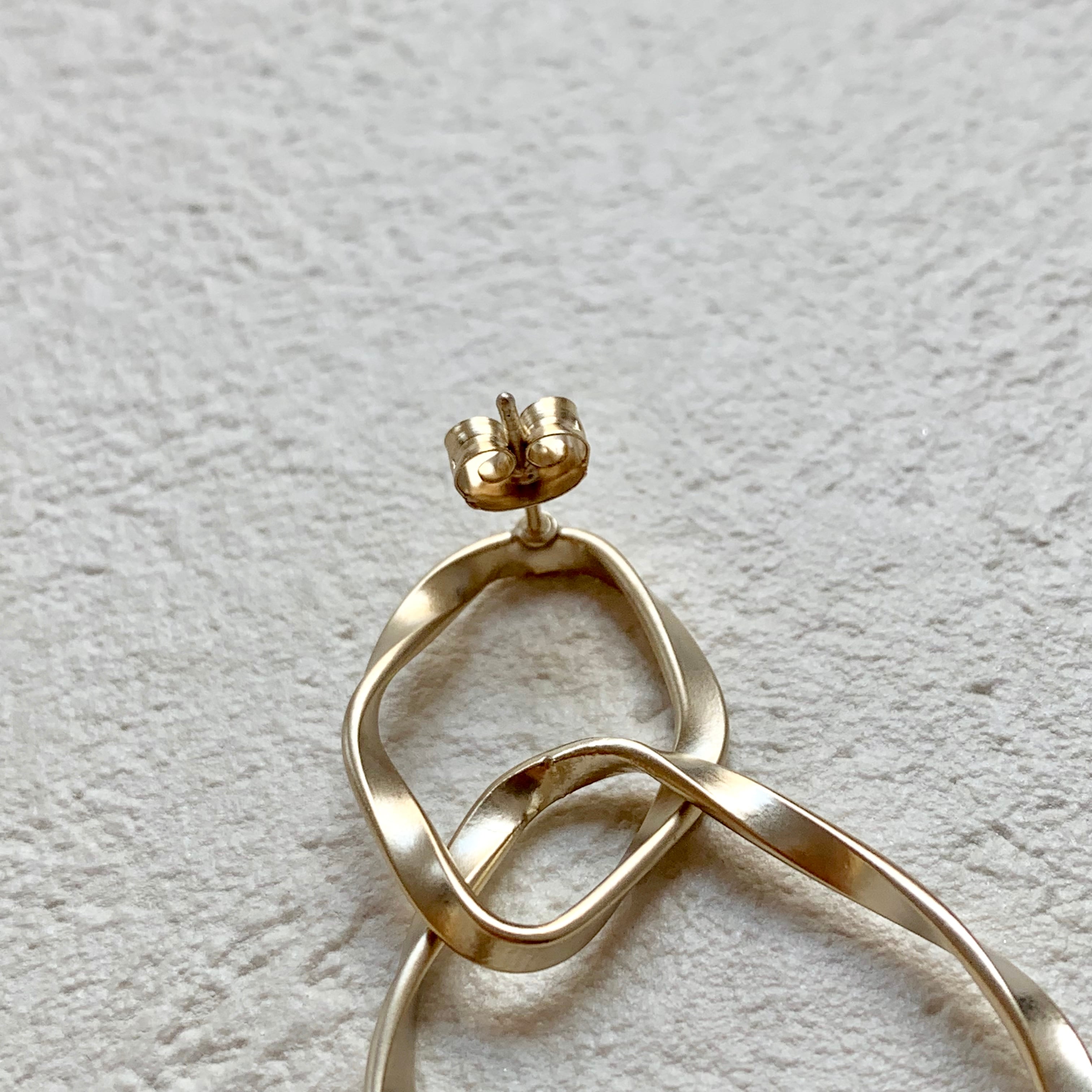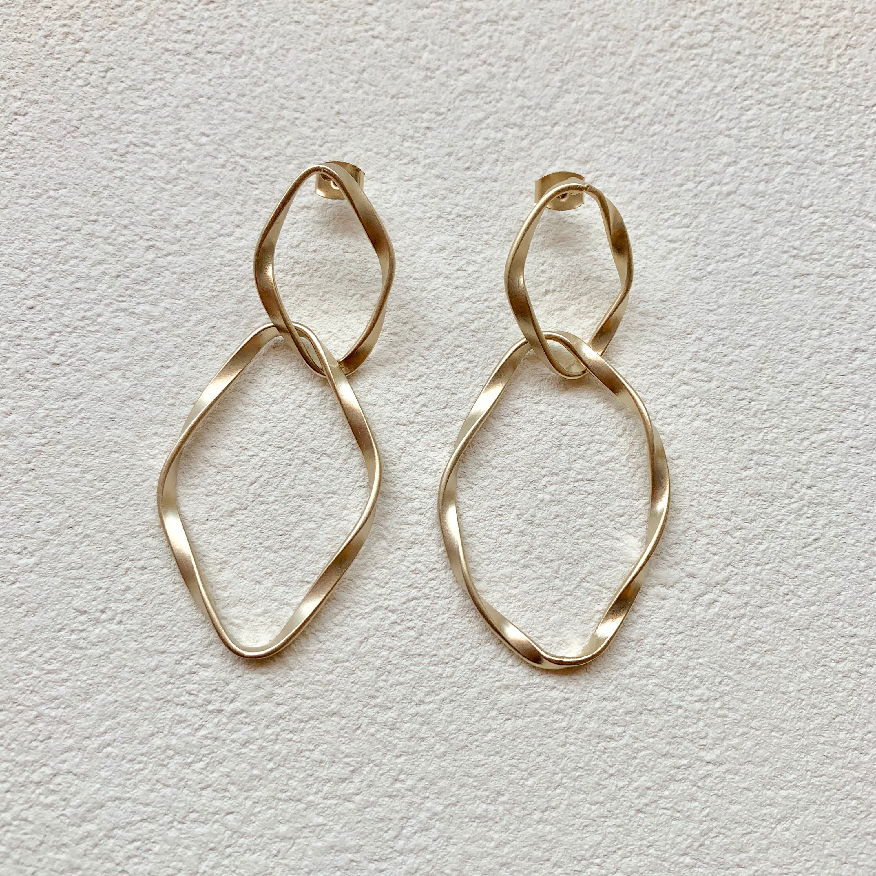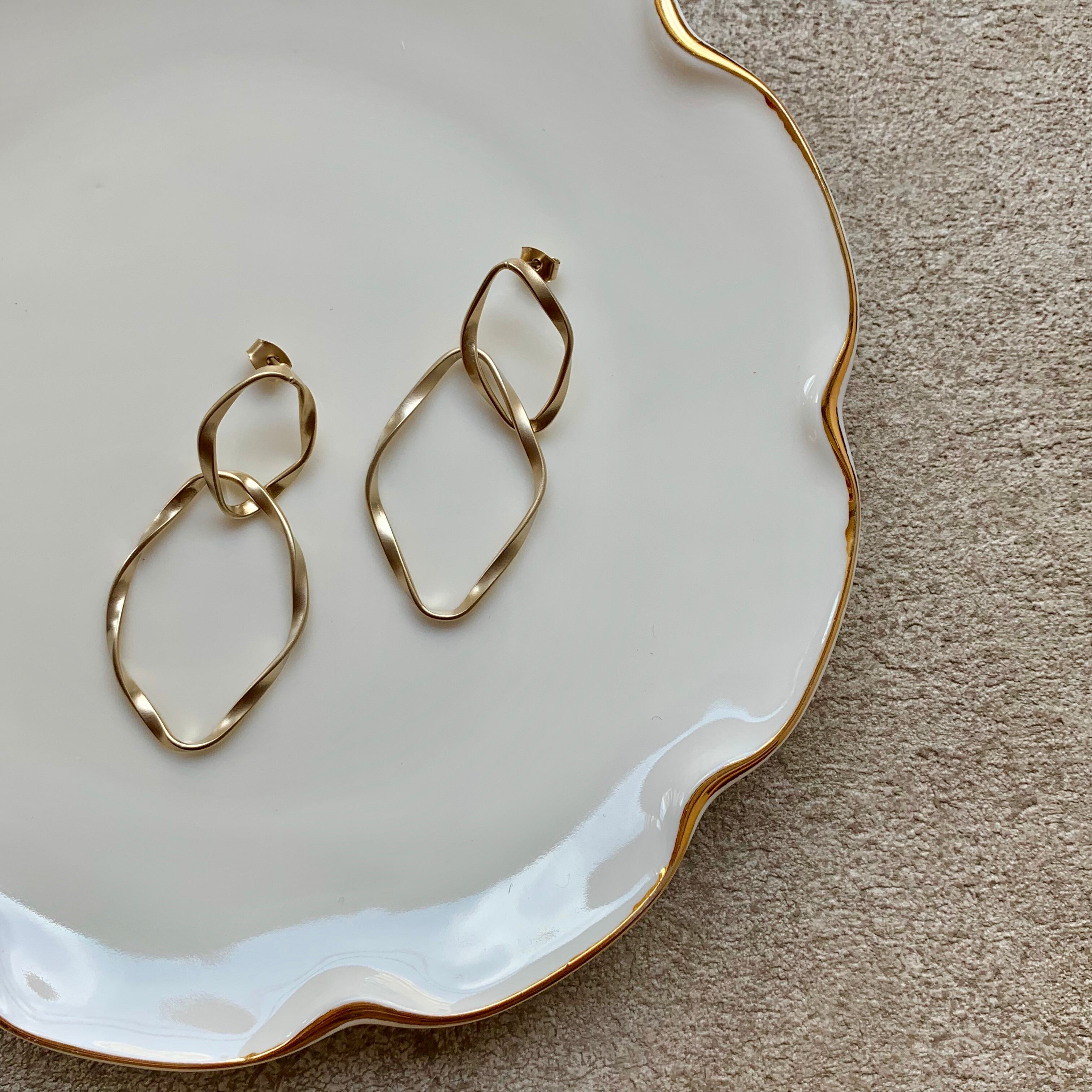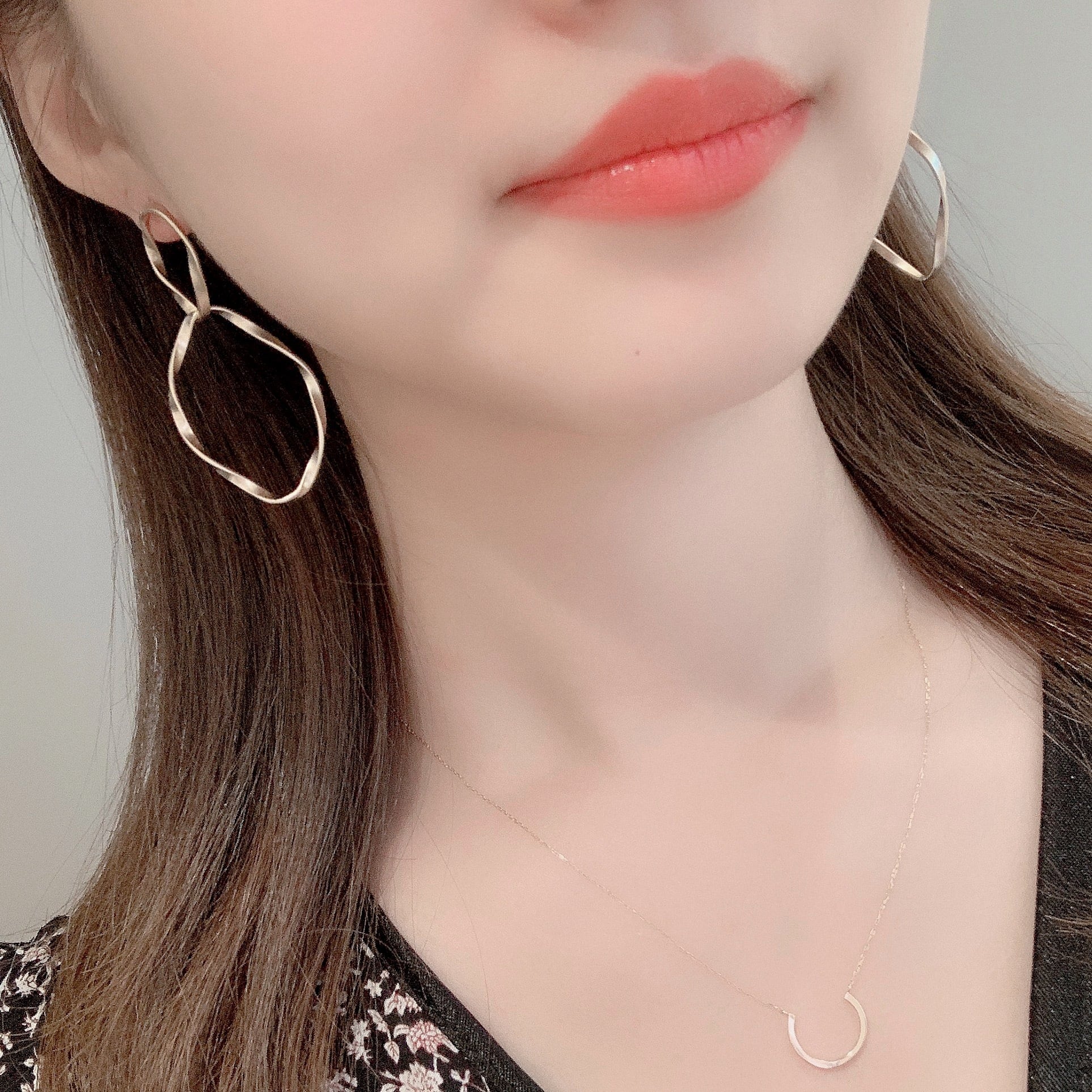ダブル変形フープピアスは、耳元のアクセントはもちろん、動きに合わせて揺れるデザインなので、女性らしさをより一層引き立ててくれます。