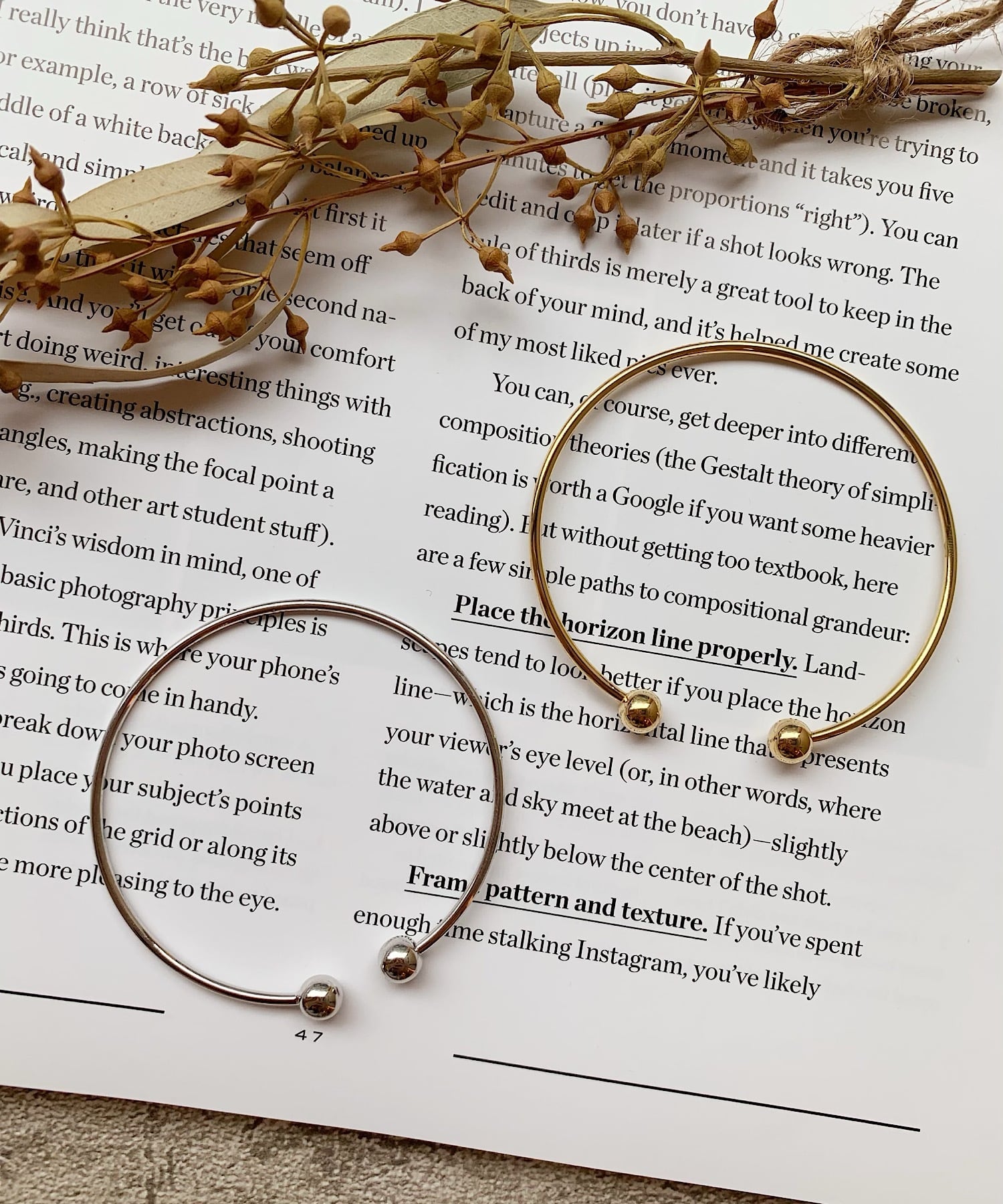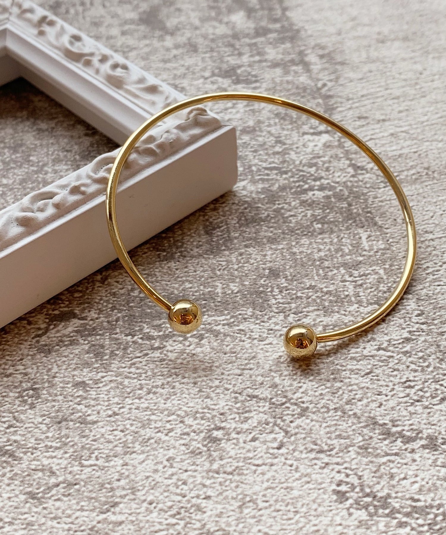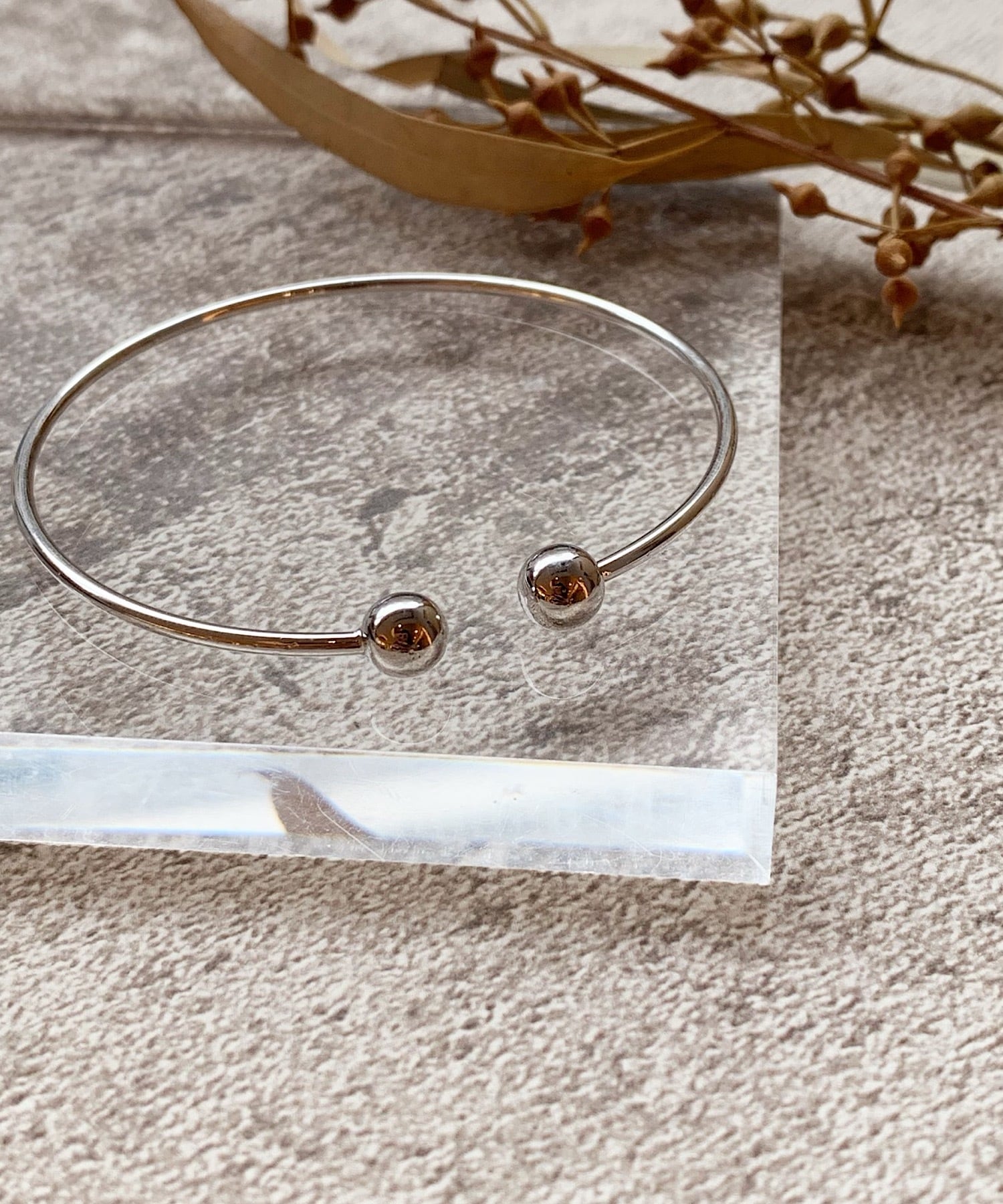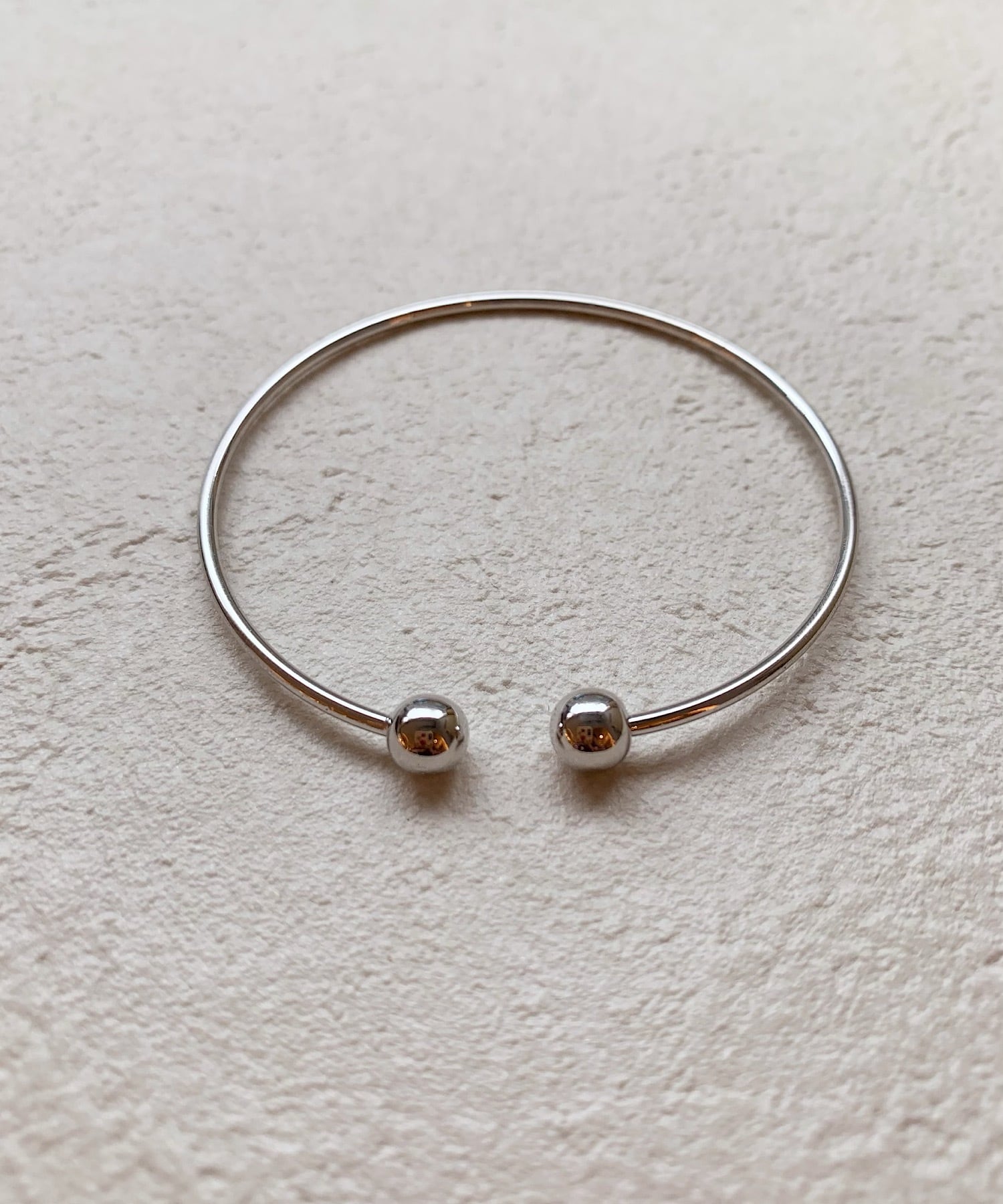 両端にボールデザインを施し、アクセントをプラスしたシンプルなバングル。