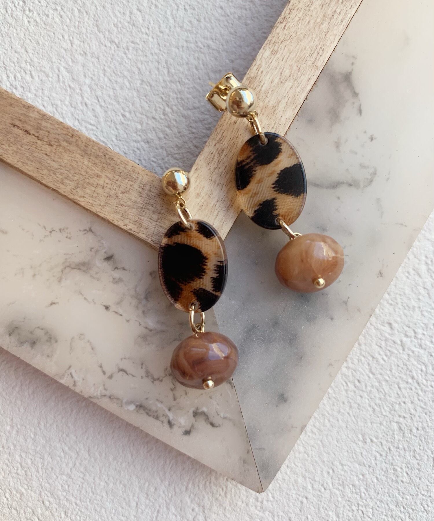 レオパードデザインのパーツとボールパーツを組み合わせたピアス。