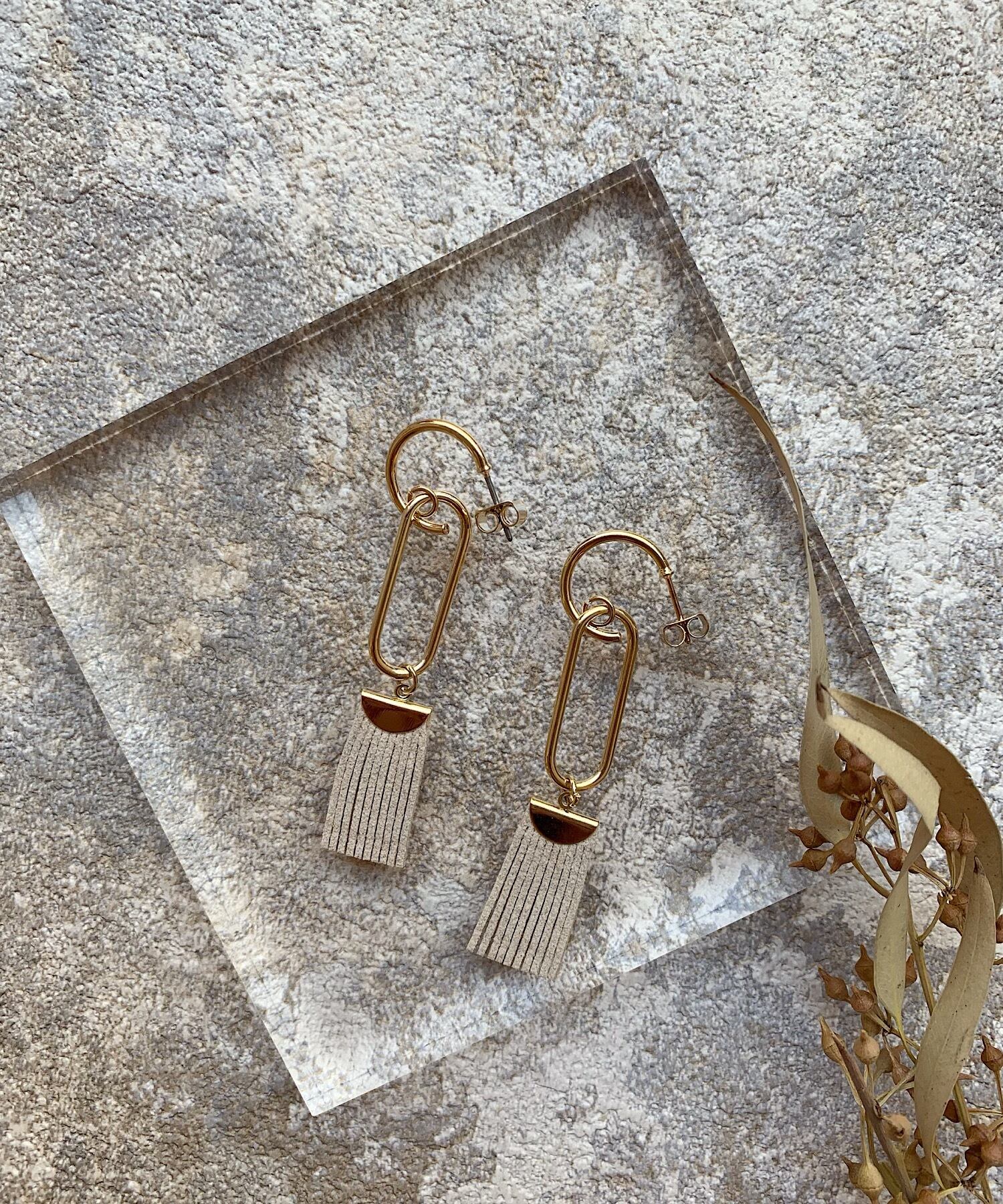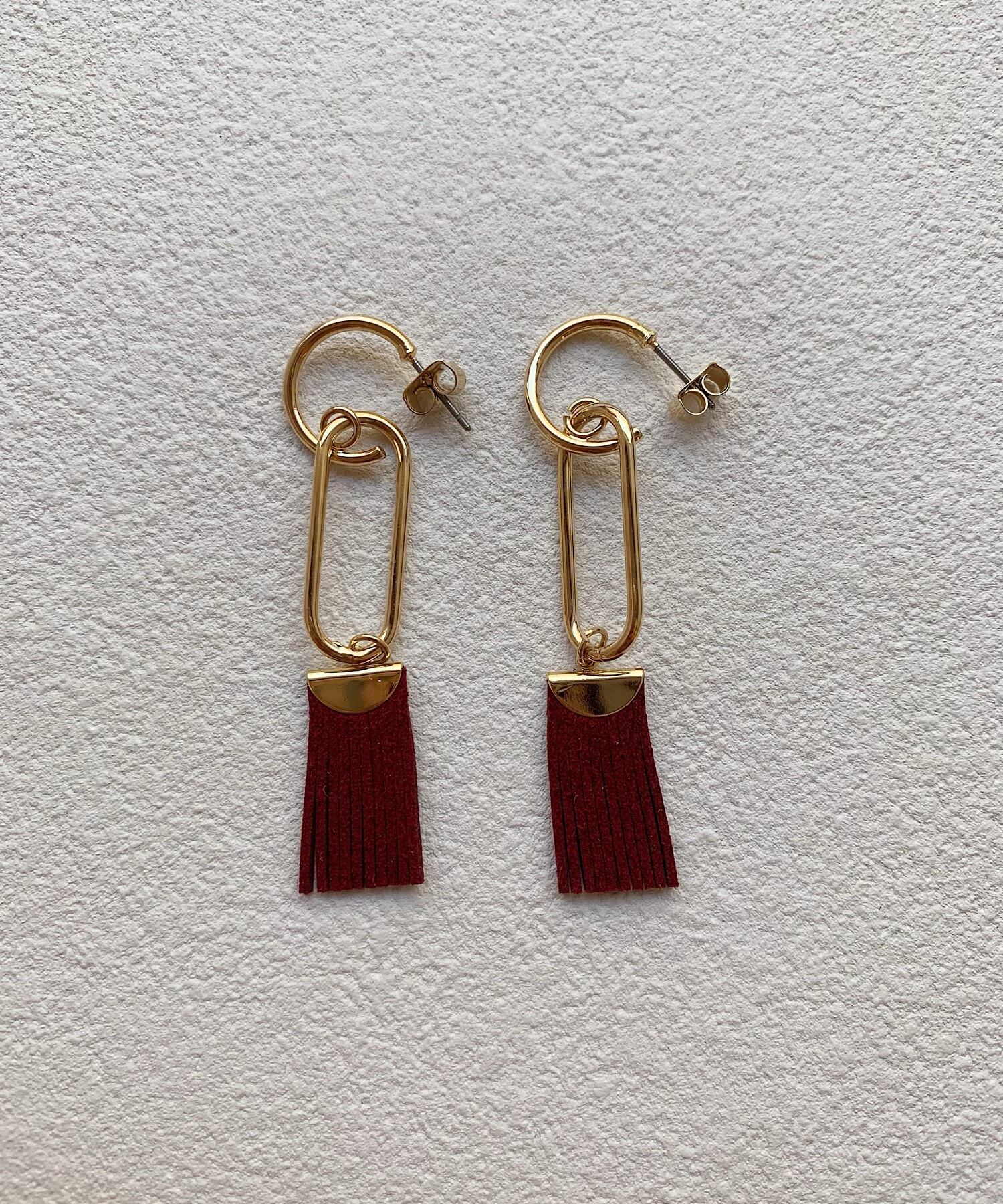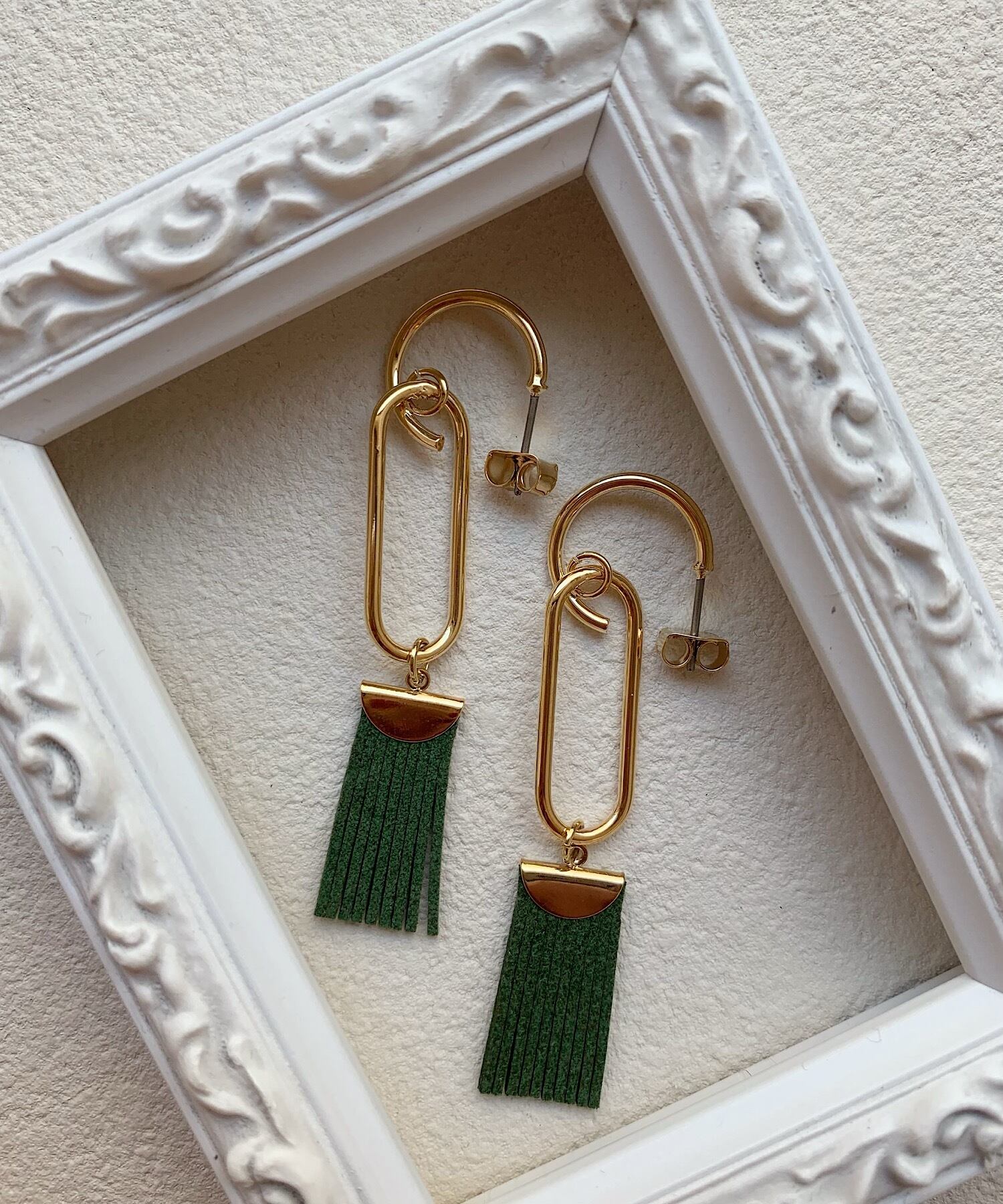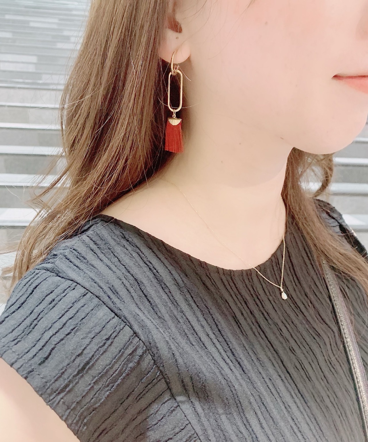 メタルの縦長フープとフリンジを組み合わせたピアス。