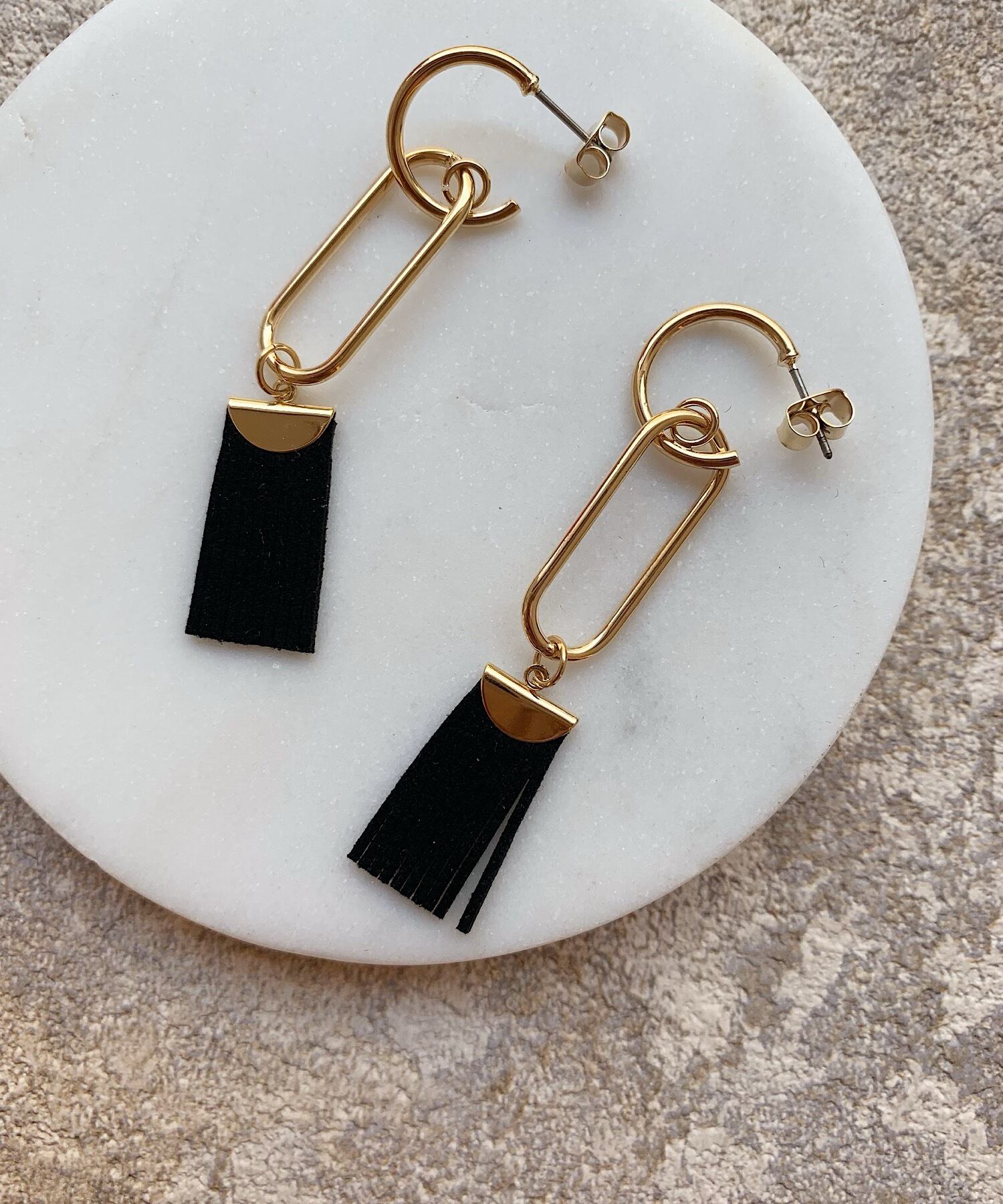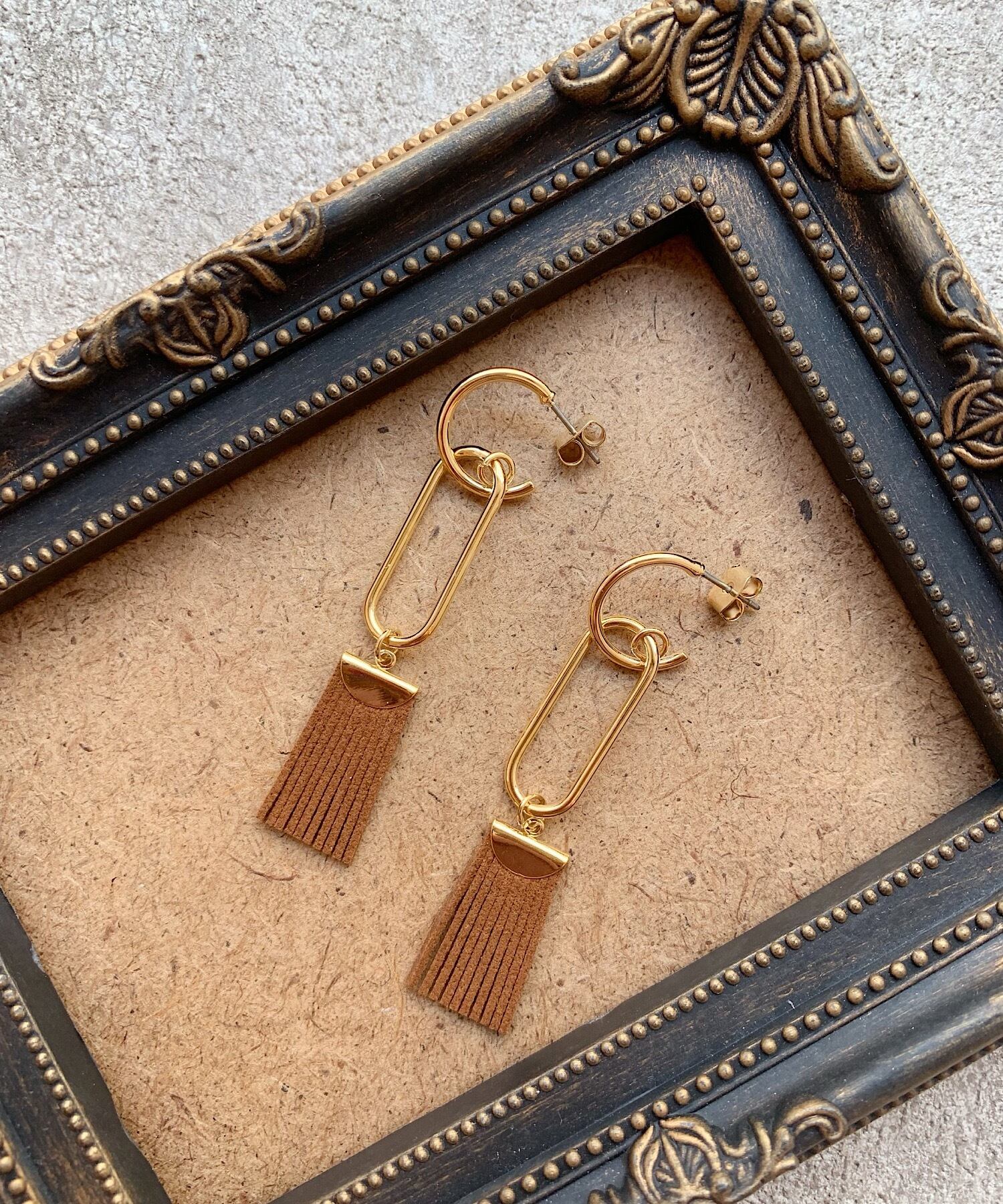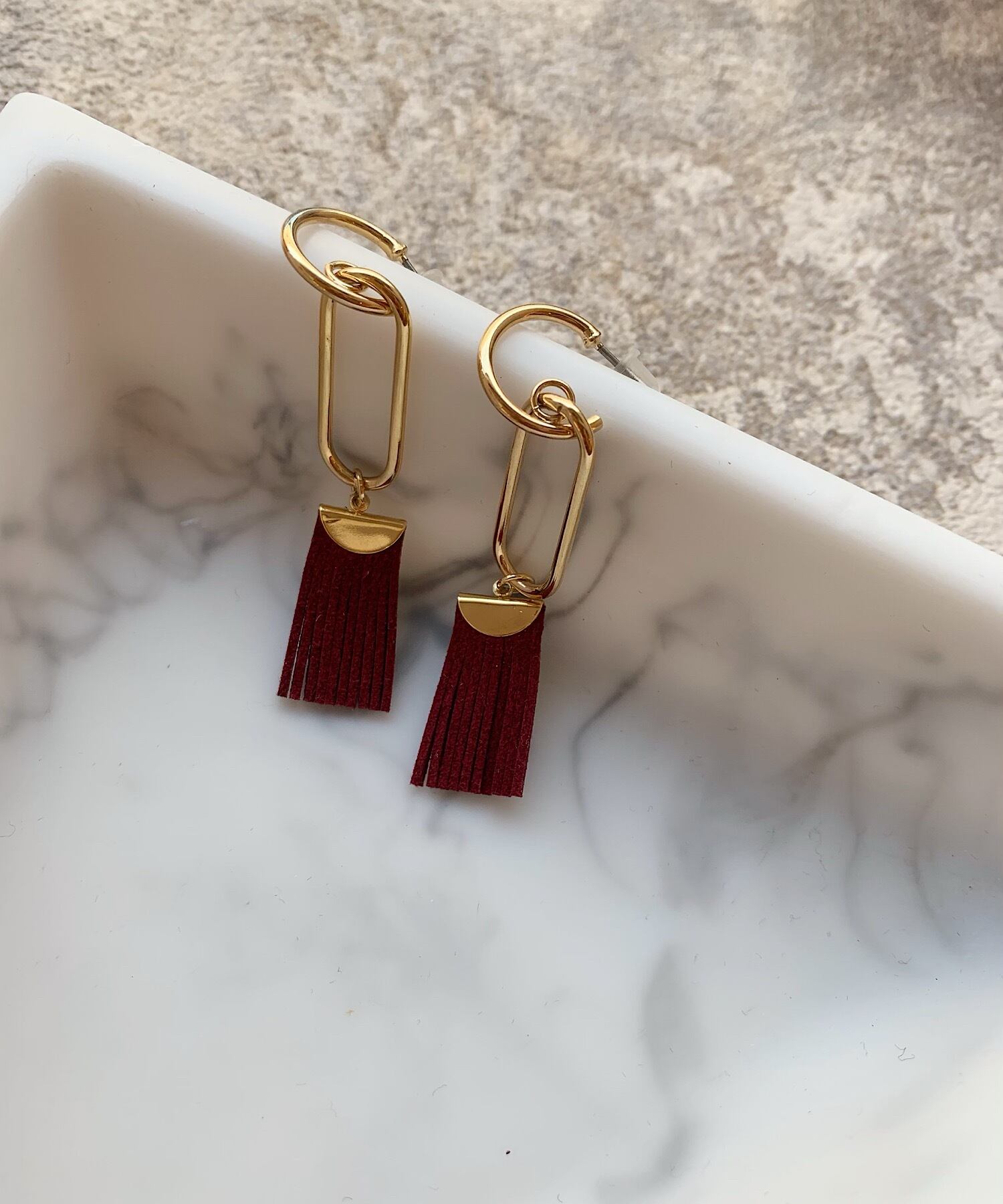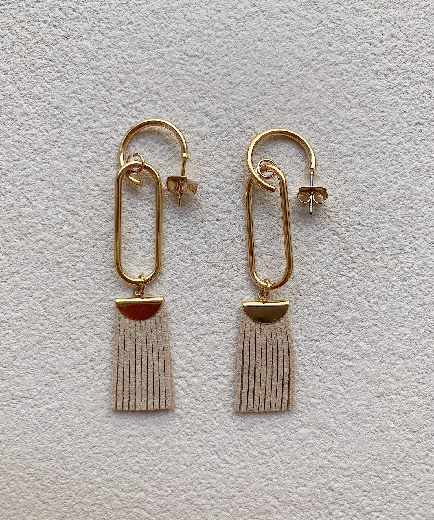 メタルの縦長フープとフリンジを組み合わせたピアス。