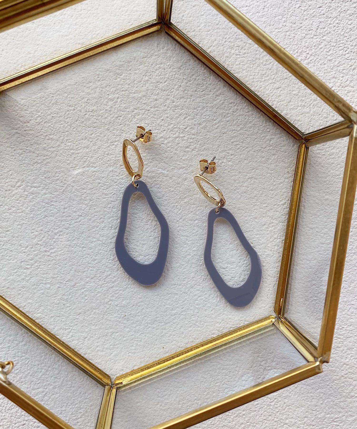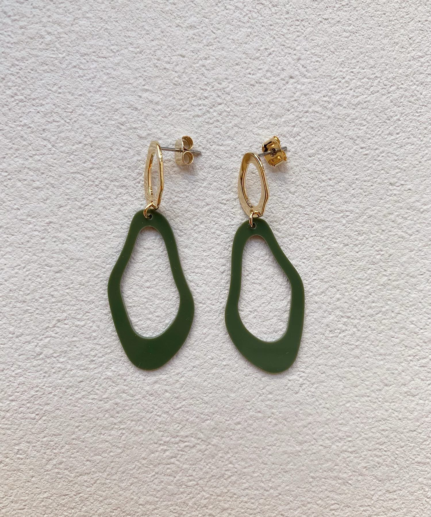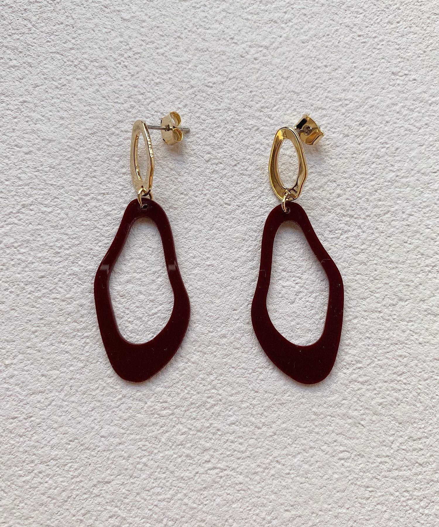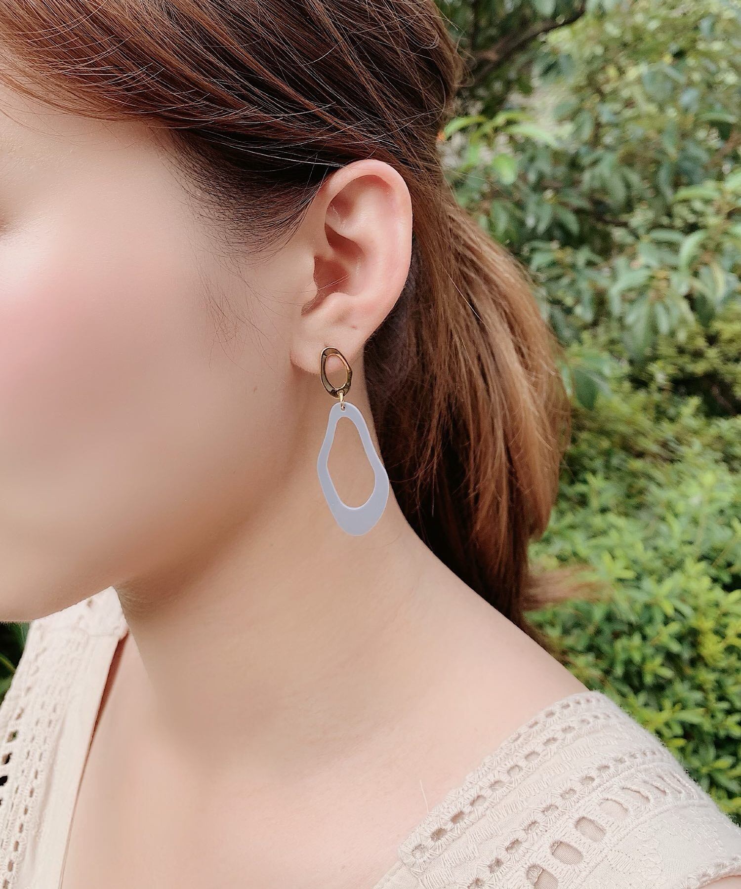 どんなスタイルにも合わせやすいニュアンスカラーとメタルの変形フープを組み合わせた、ぬけ感のあるデザインです。