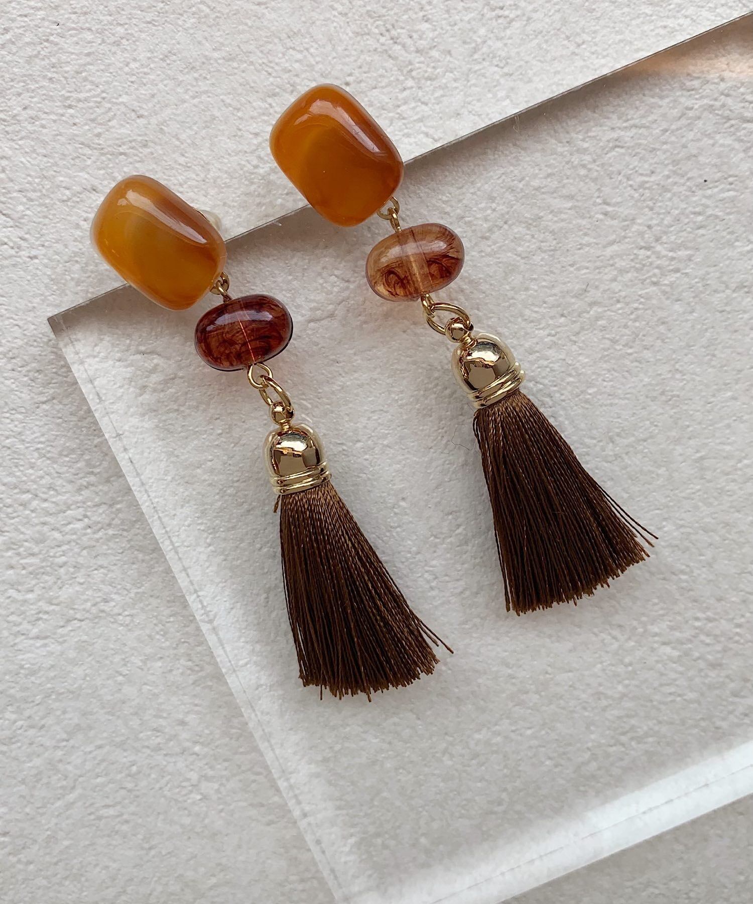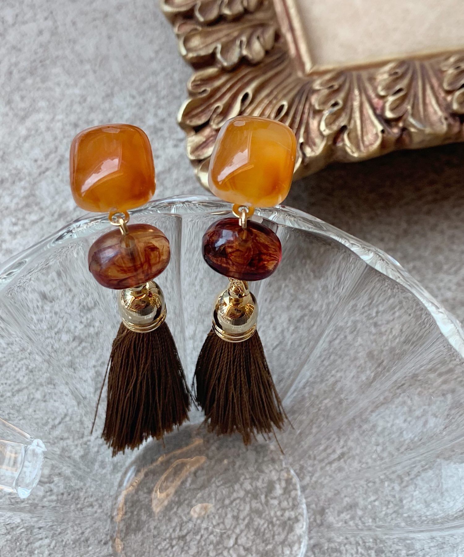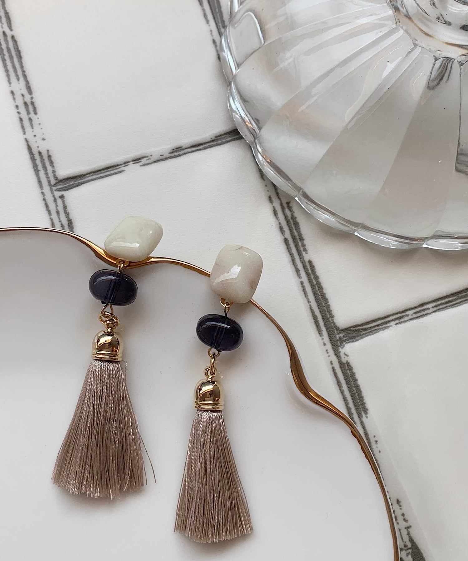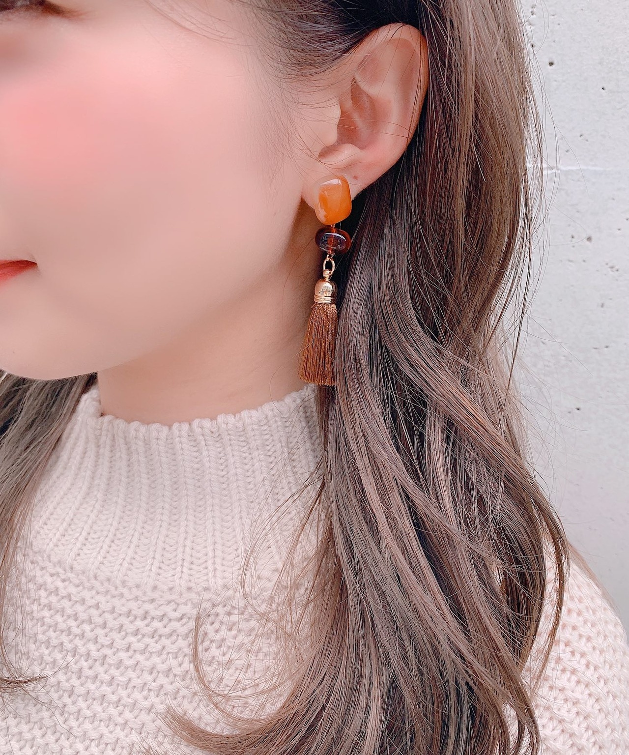 上品なカラーが目を惹くストーンから、ボリューム感のあるフリンジが揺れる個性的でレトロなデザインに仕上げました。