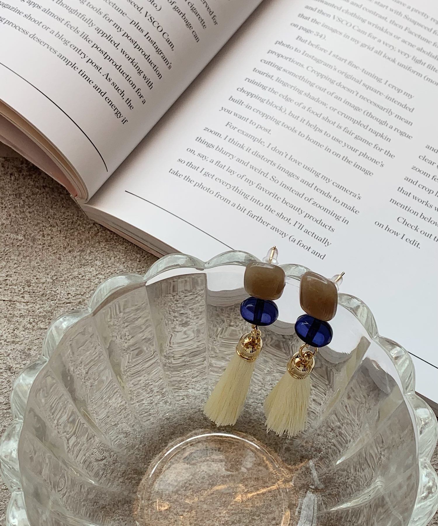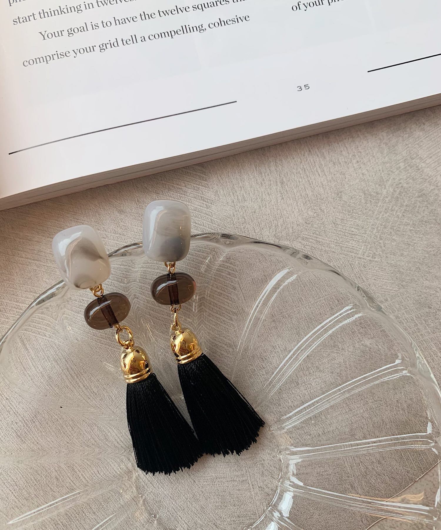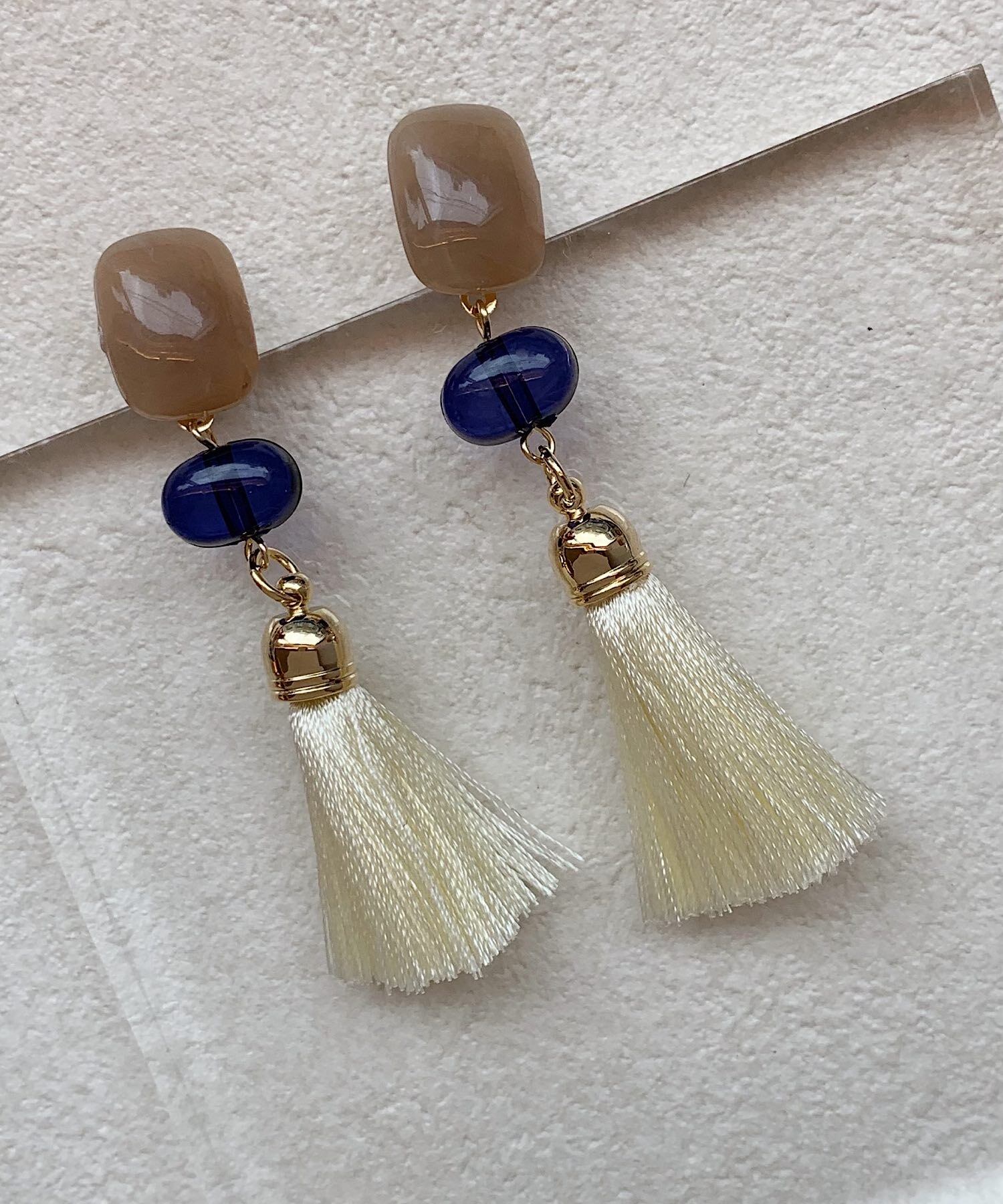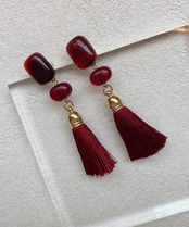 上品なカラーが目を惹くストーンから、ボリューム感のあるフリンジが揺れる個性的でレトロなデザインに仕上げました。