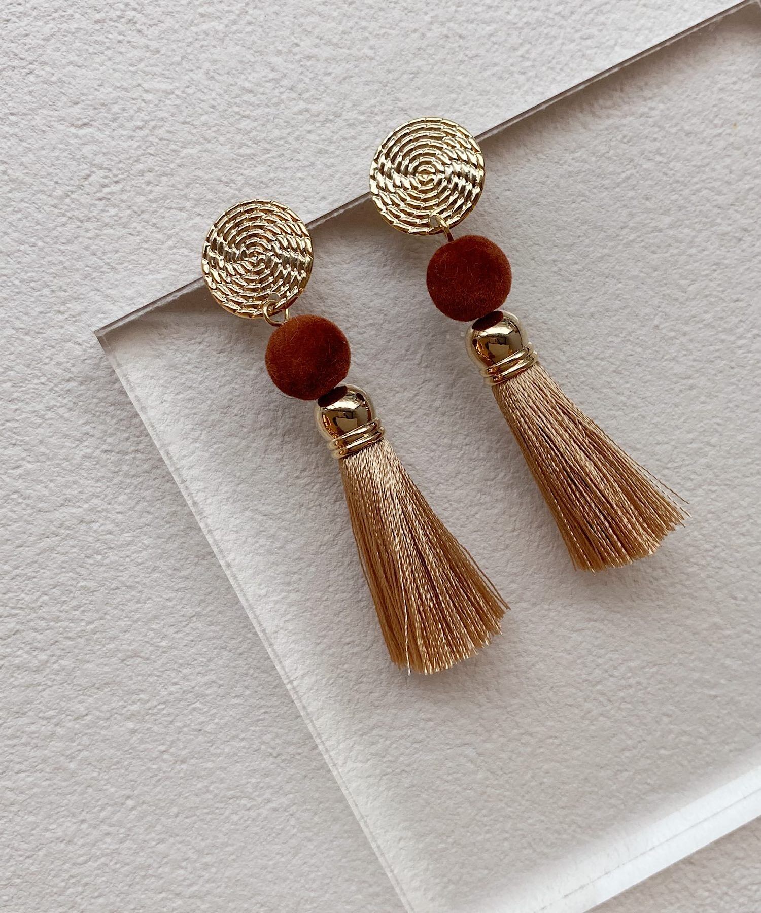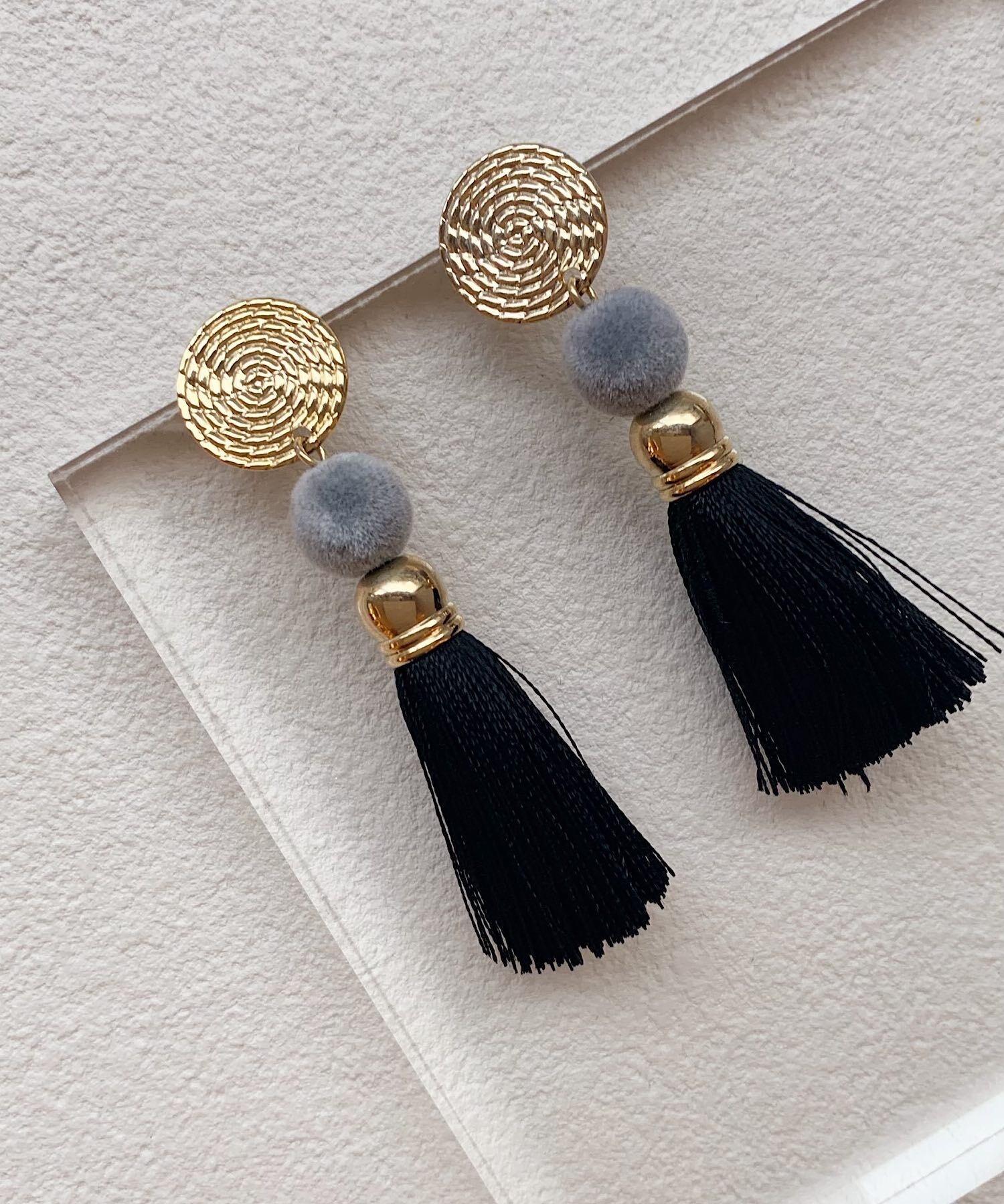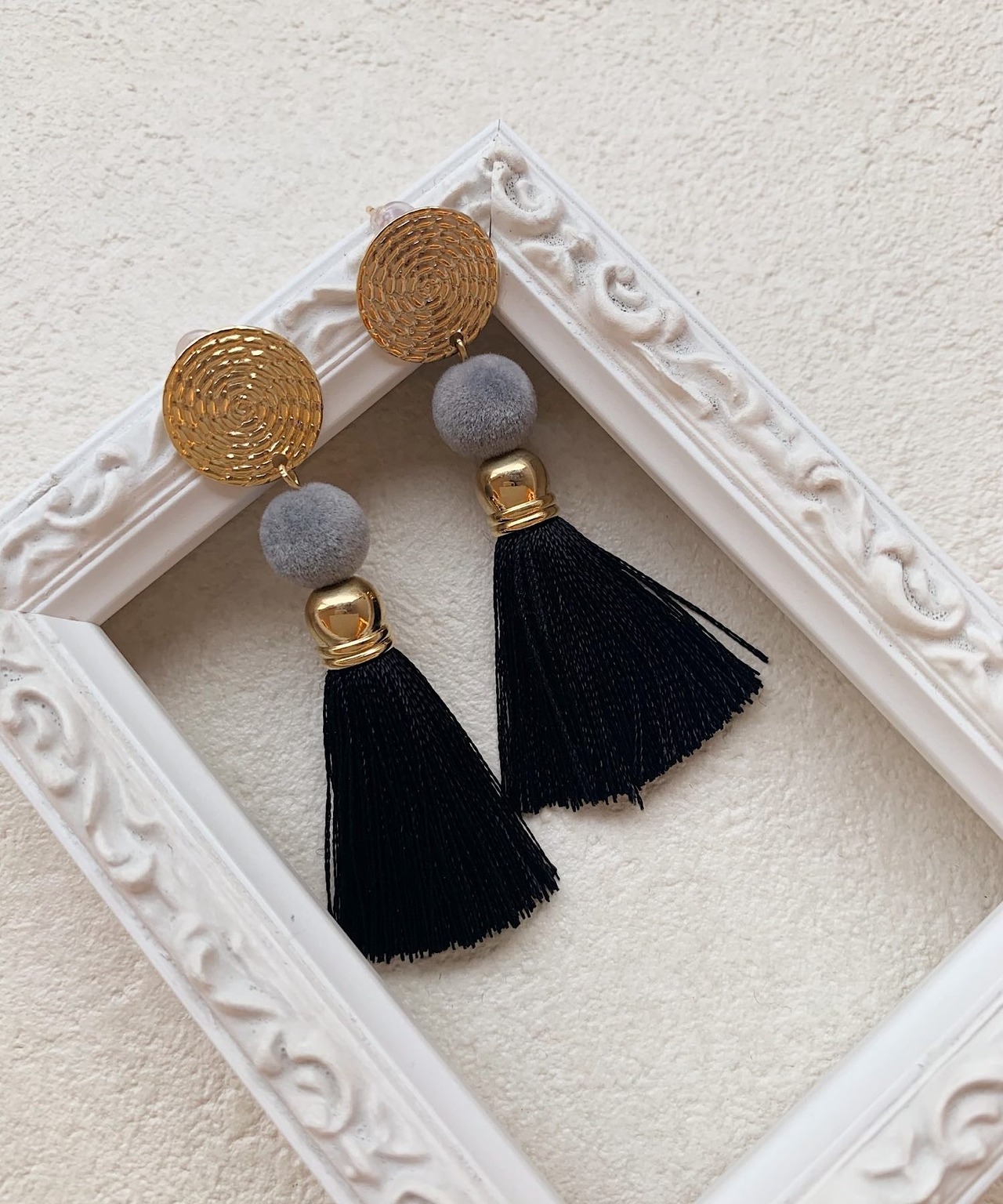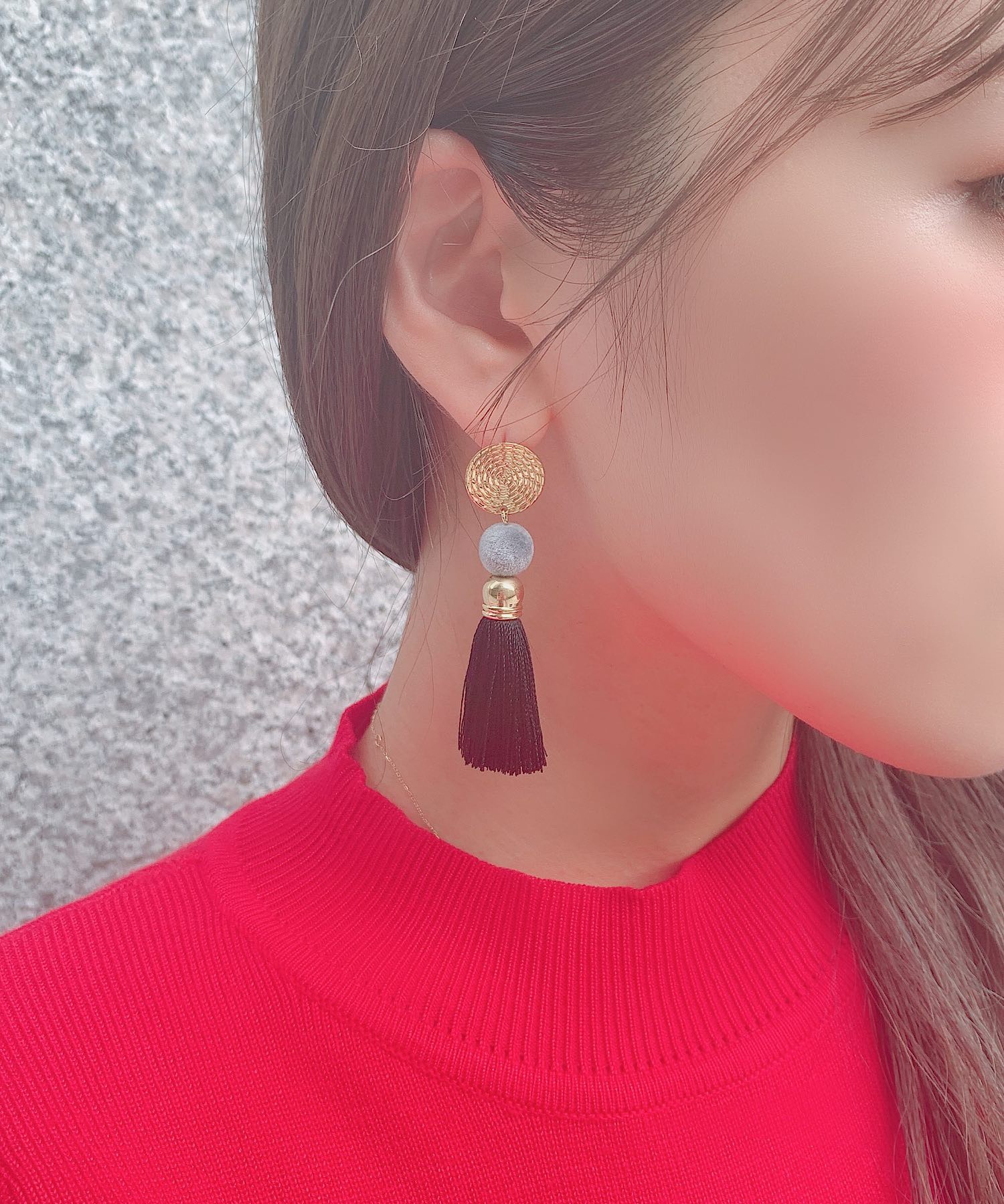 メタルとベロアのボールパーツから、上品ながらも存在感のあるフリンジが揺れるデザインです。