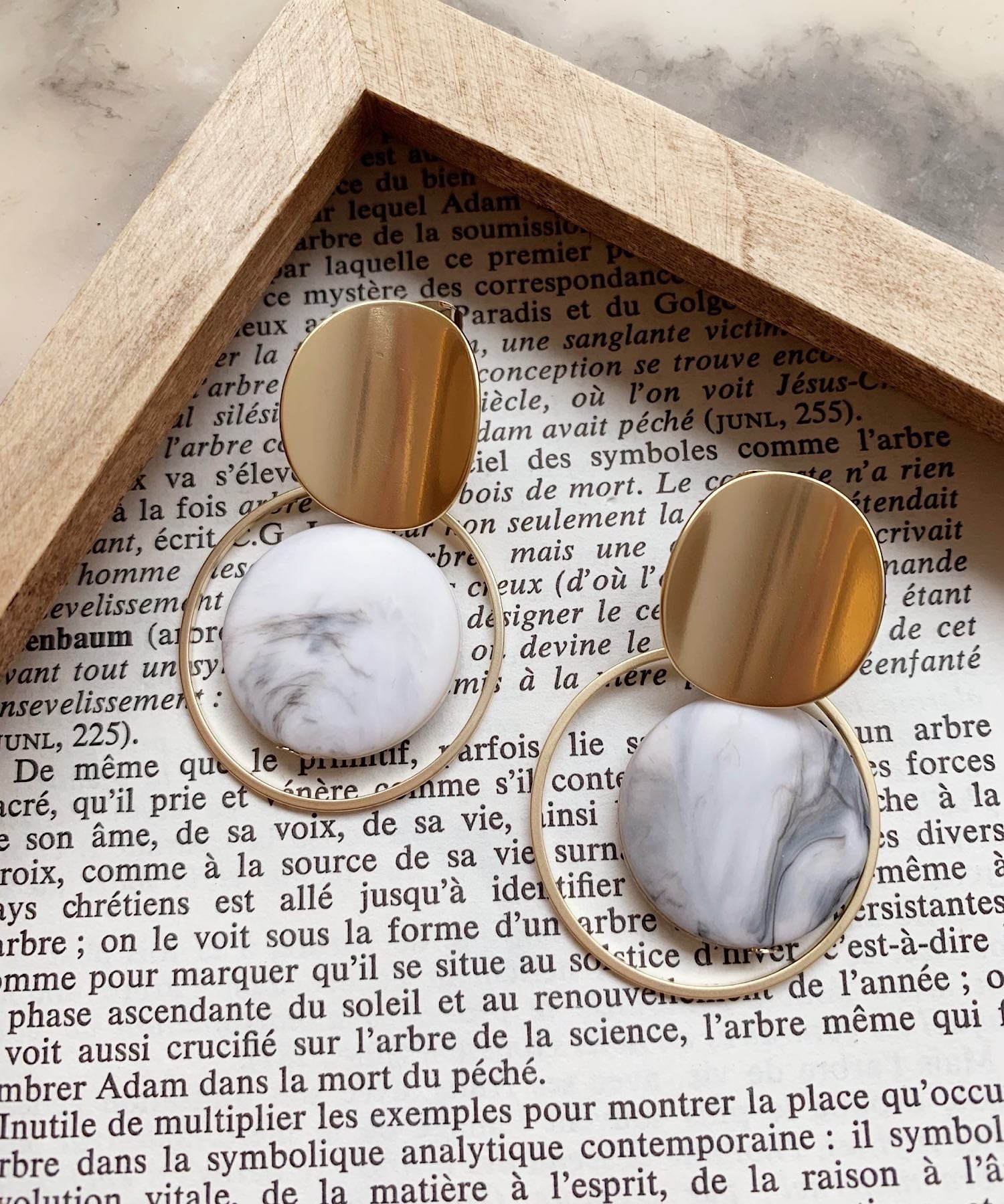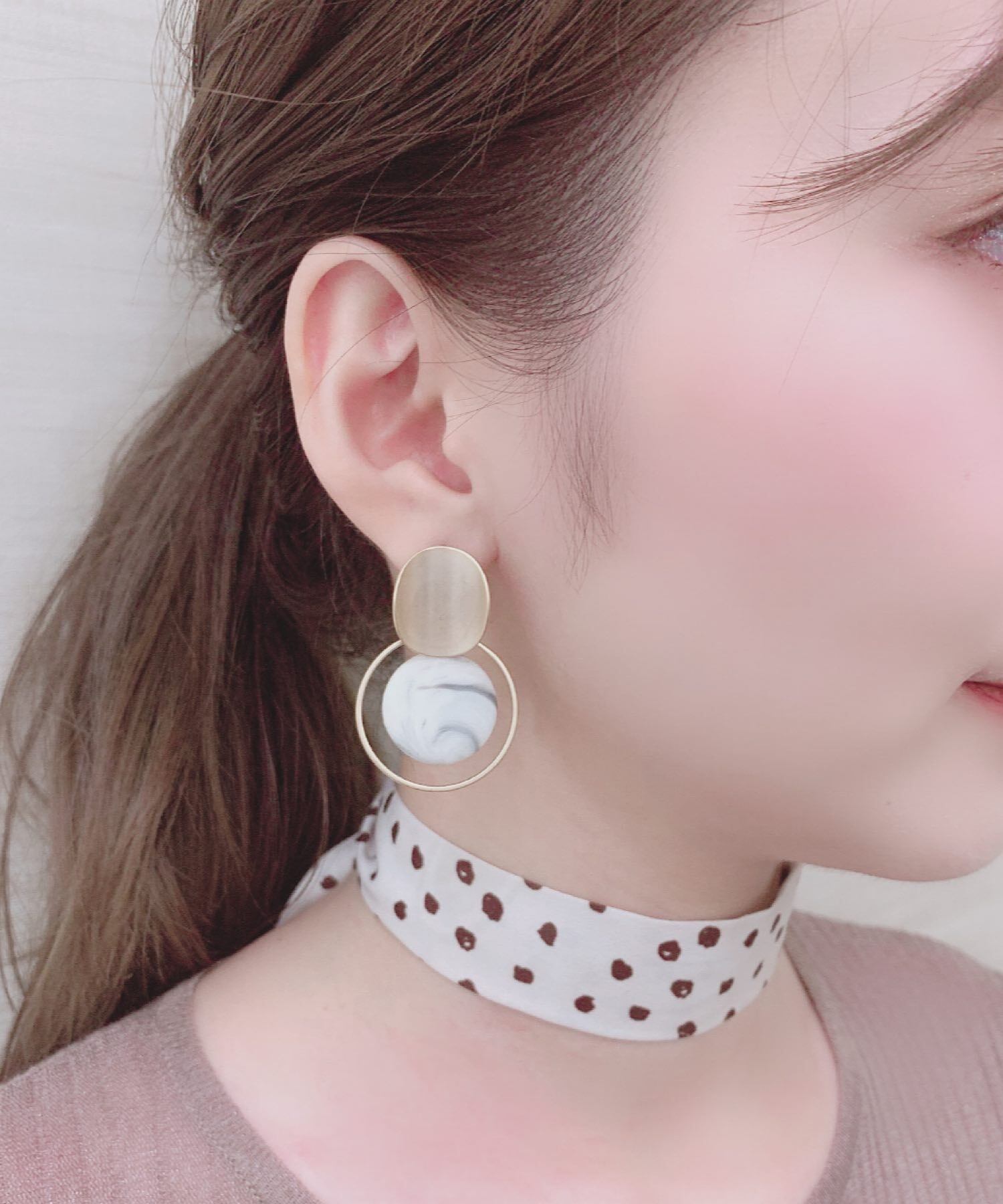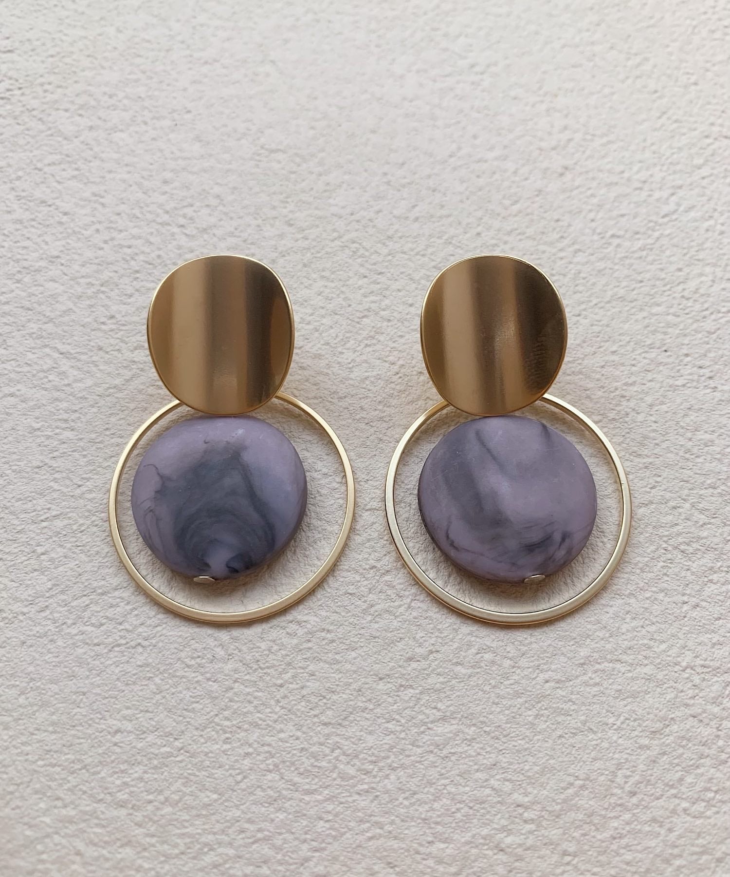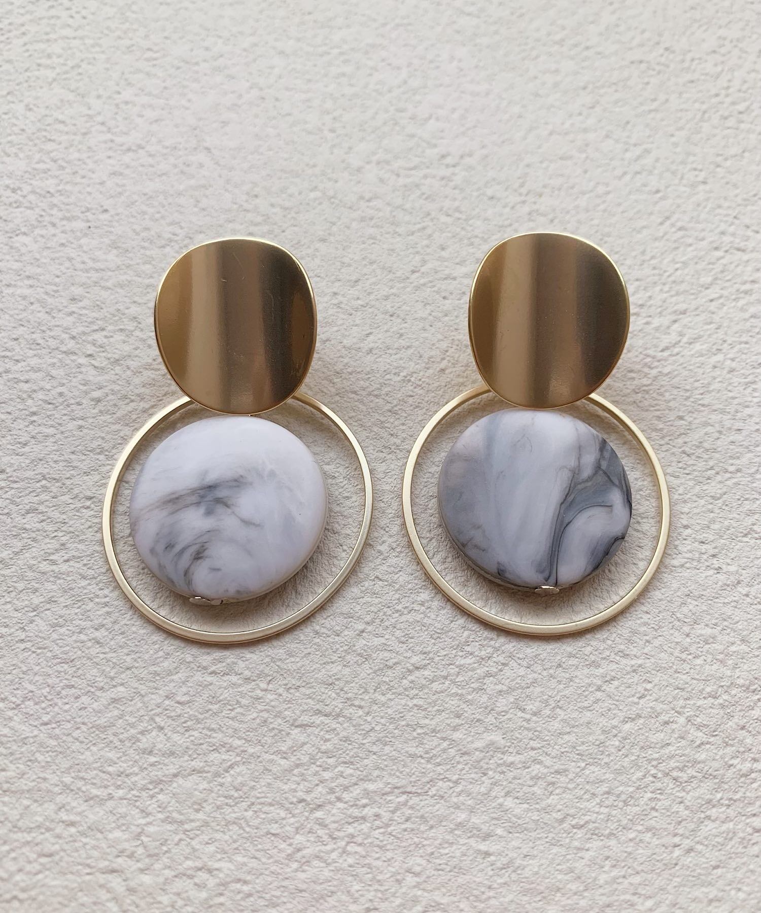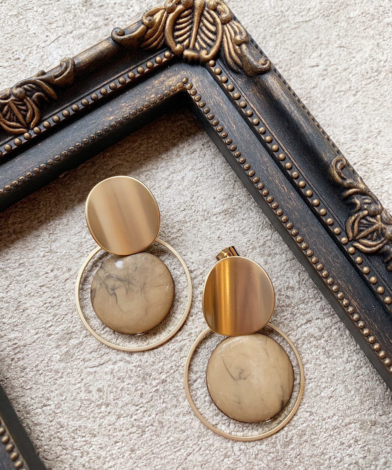 マーブルデザインのパーツをメタルの繊細なサークルが囲むユニークなデザインのピアス。