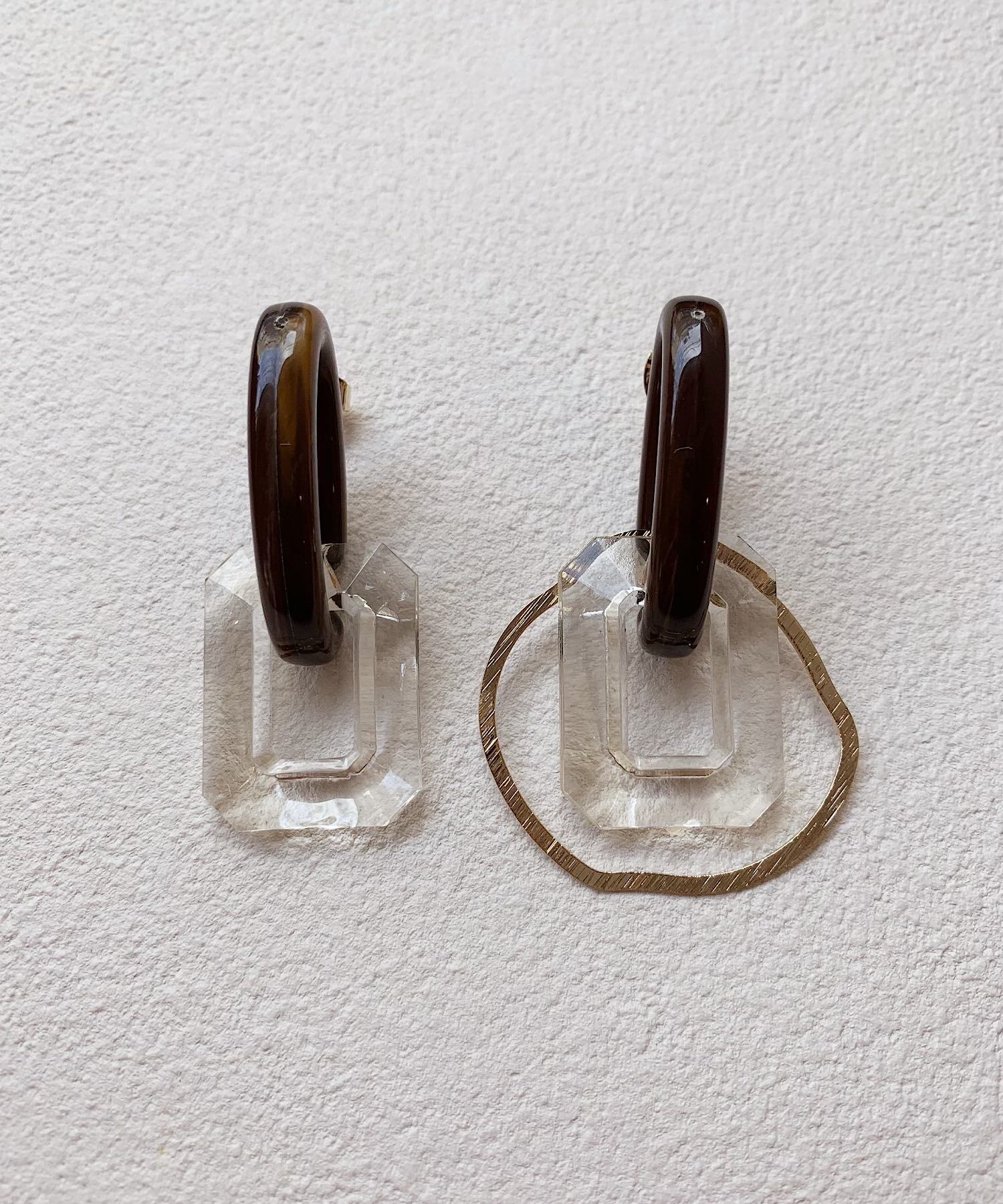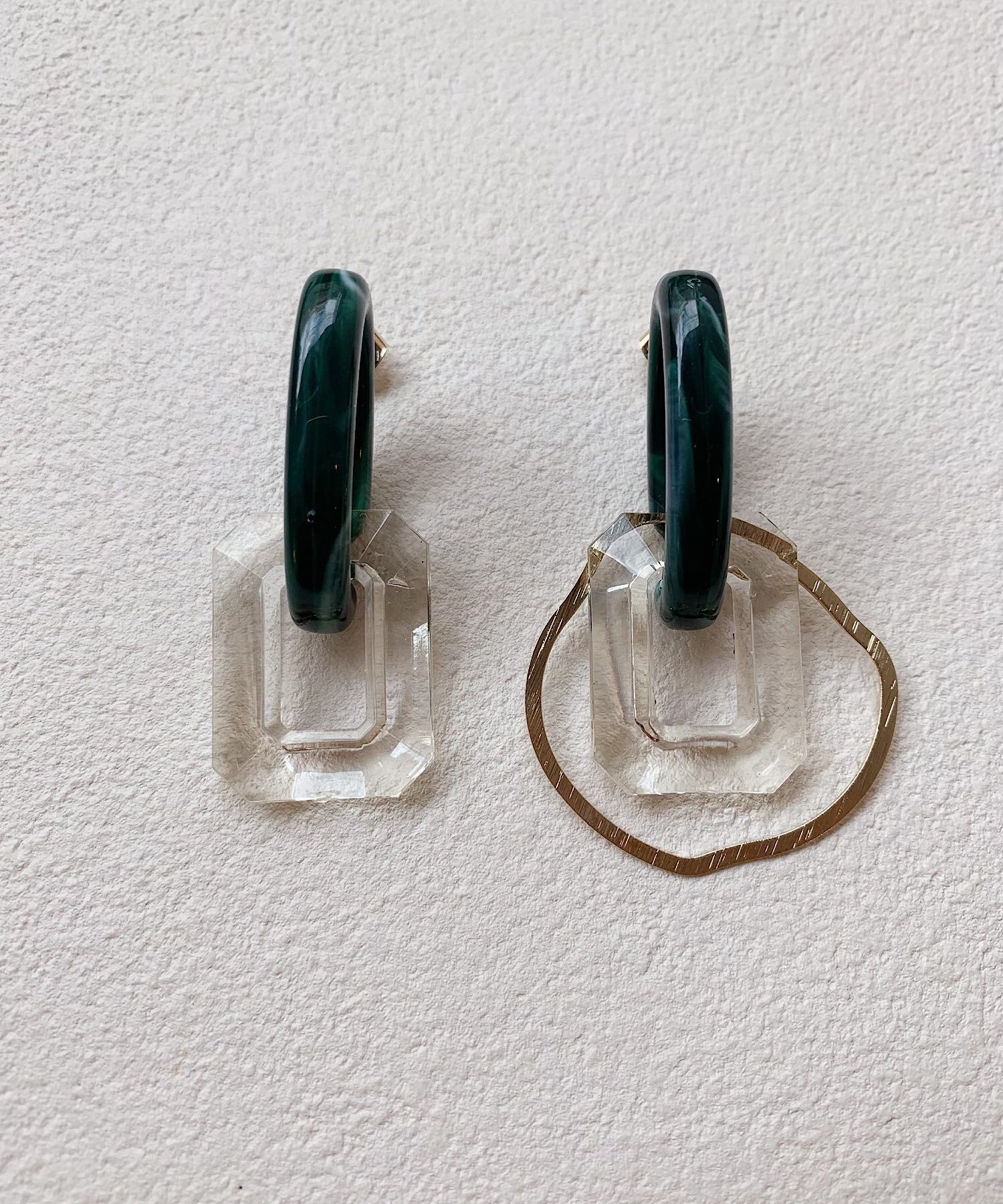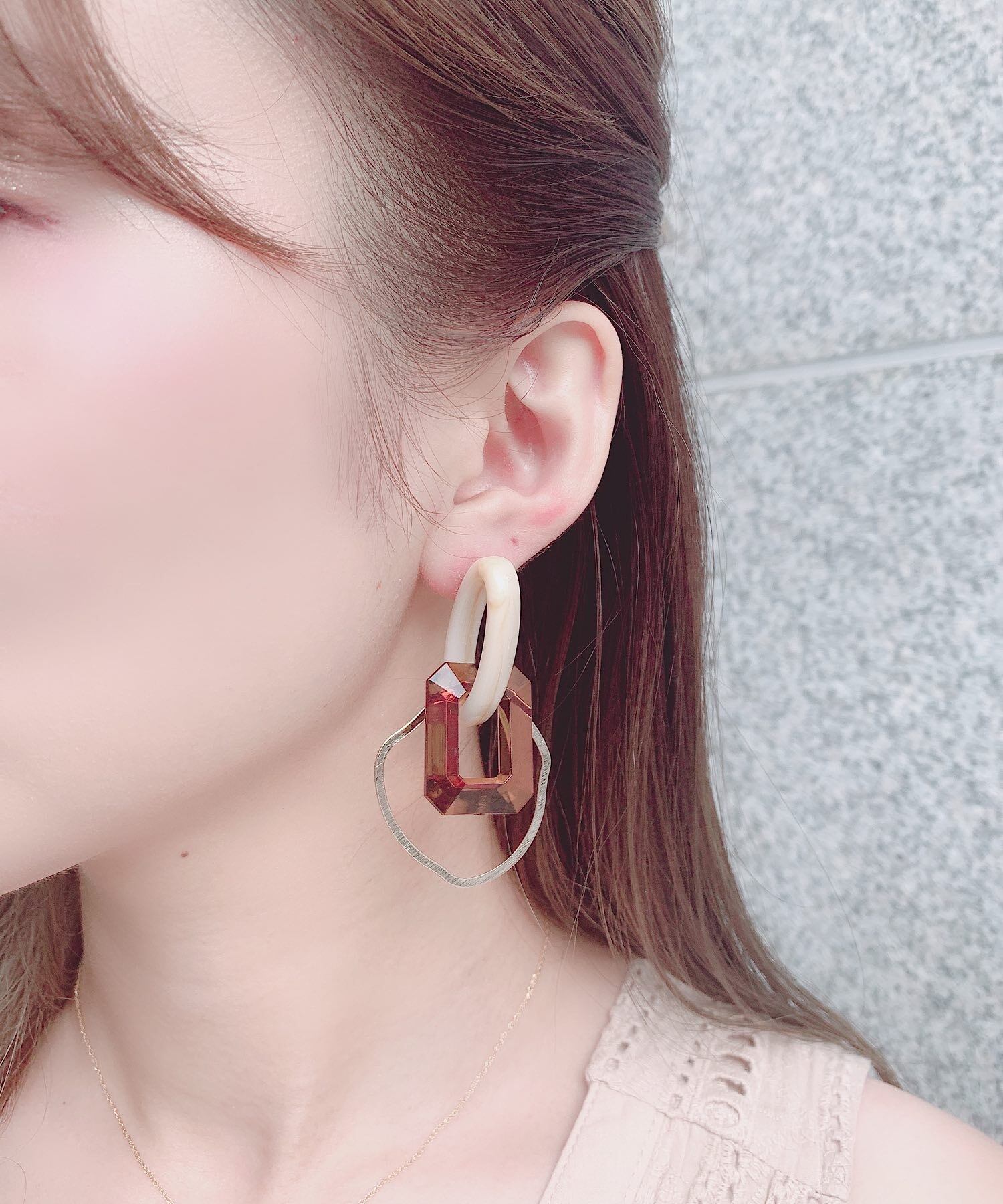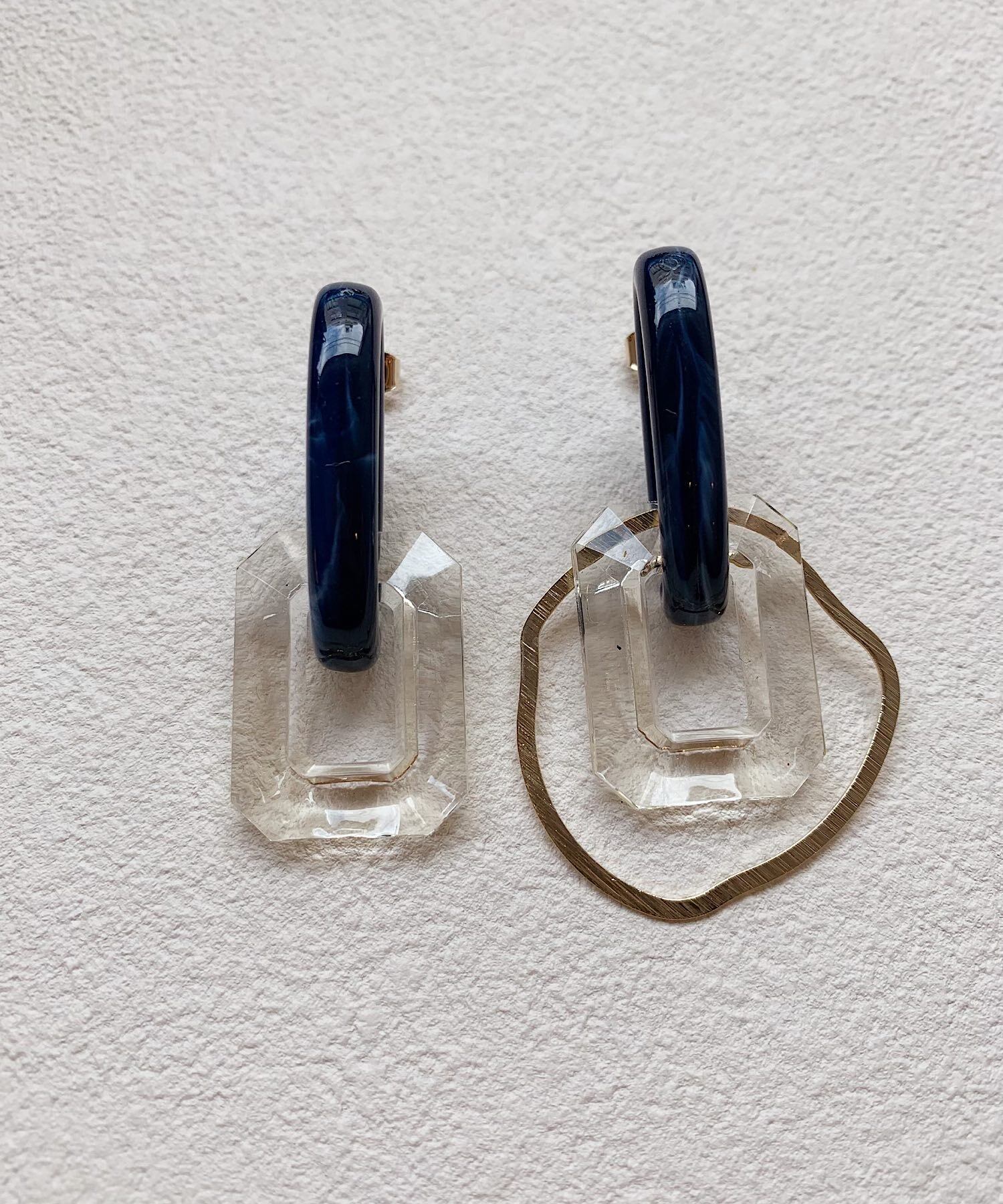 異なる素材、色みのパーツを組み合わせたアシンメトリーピアス。