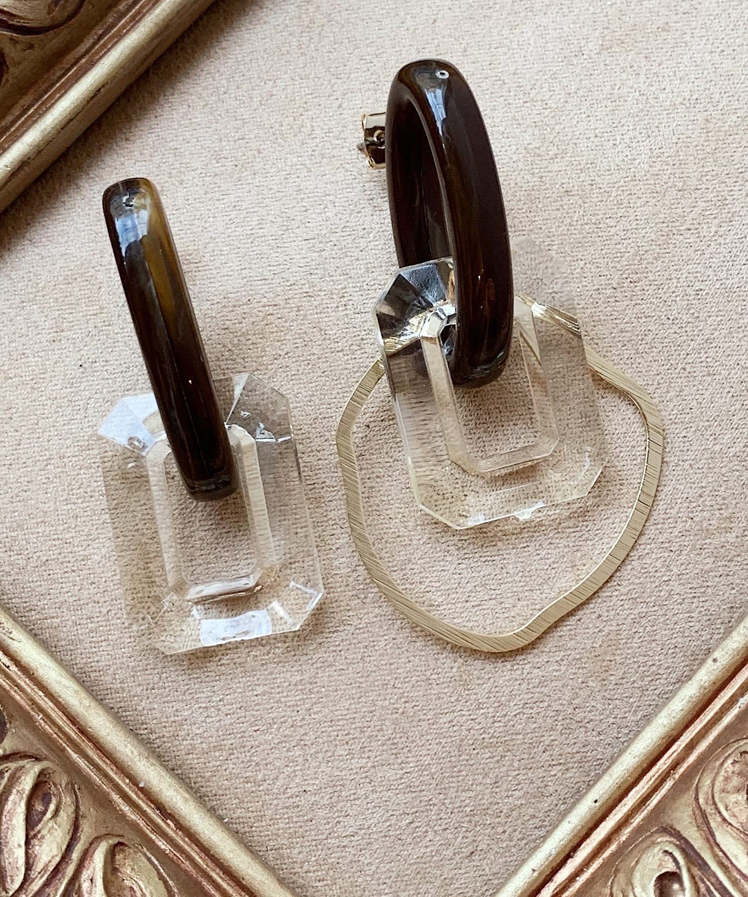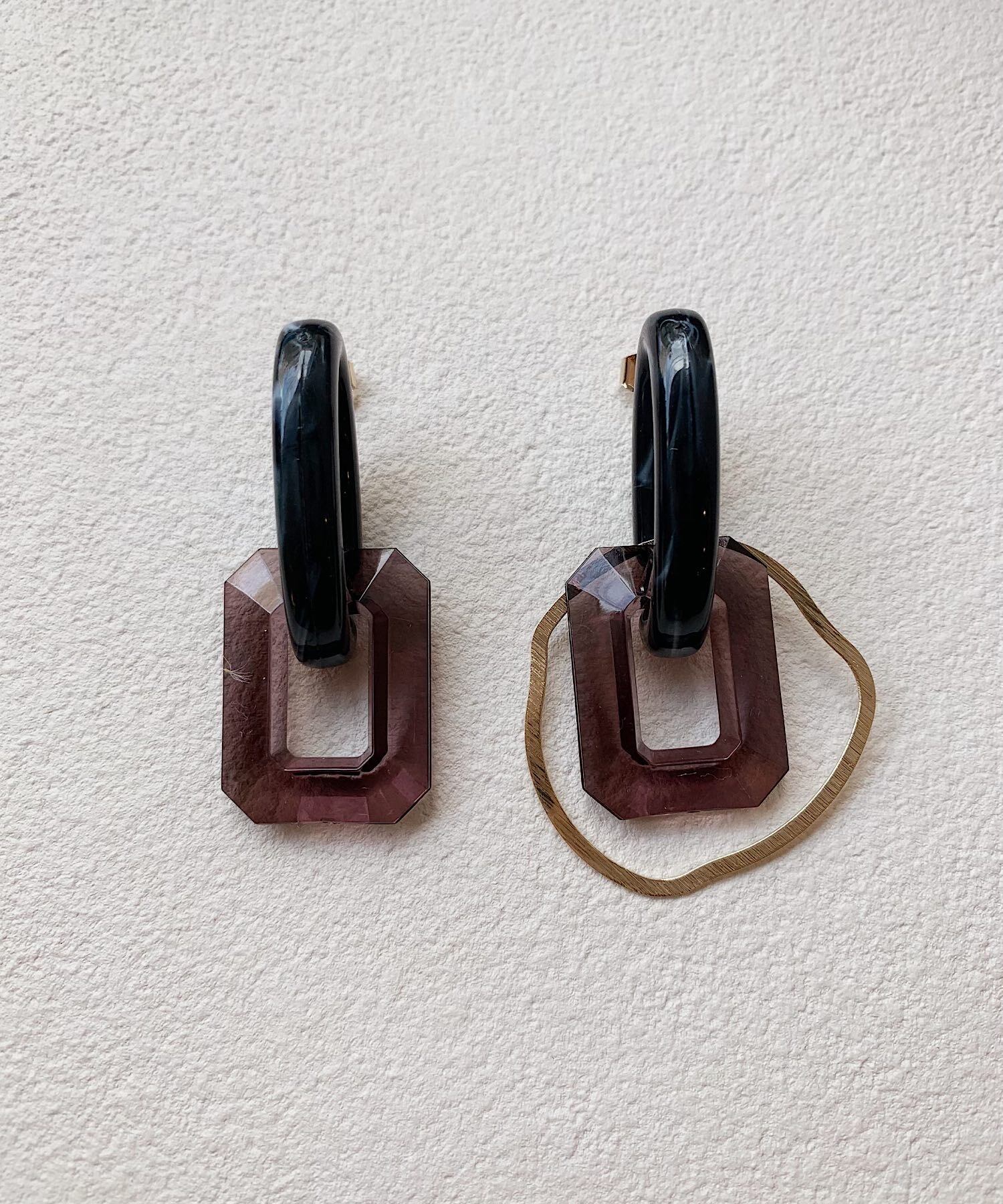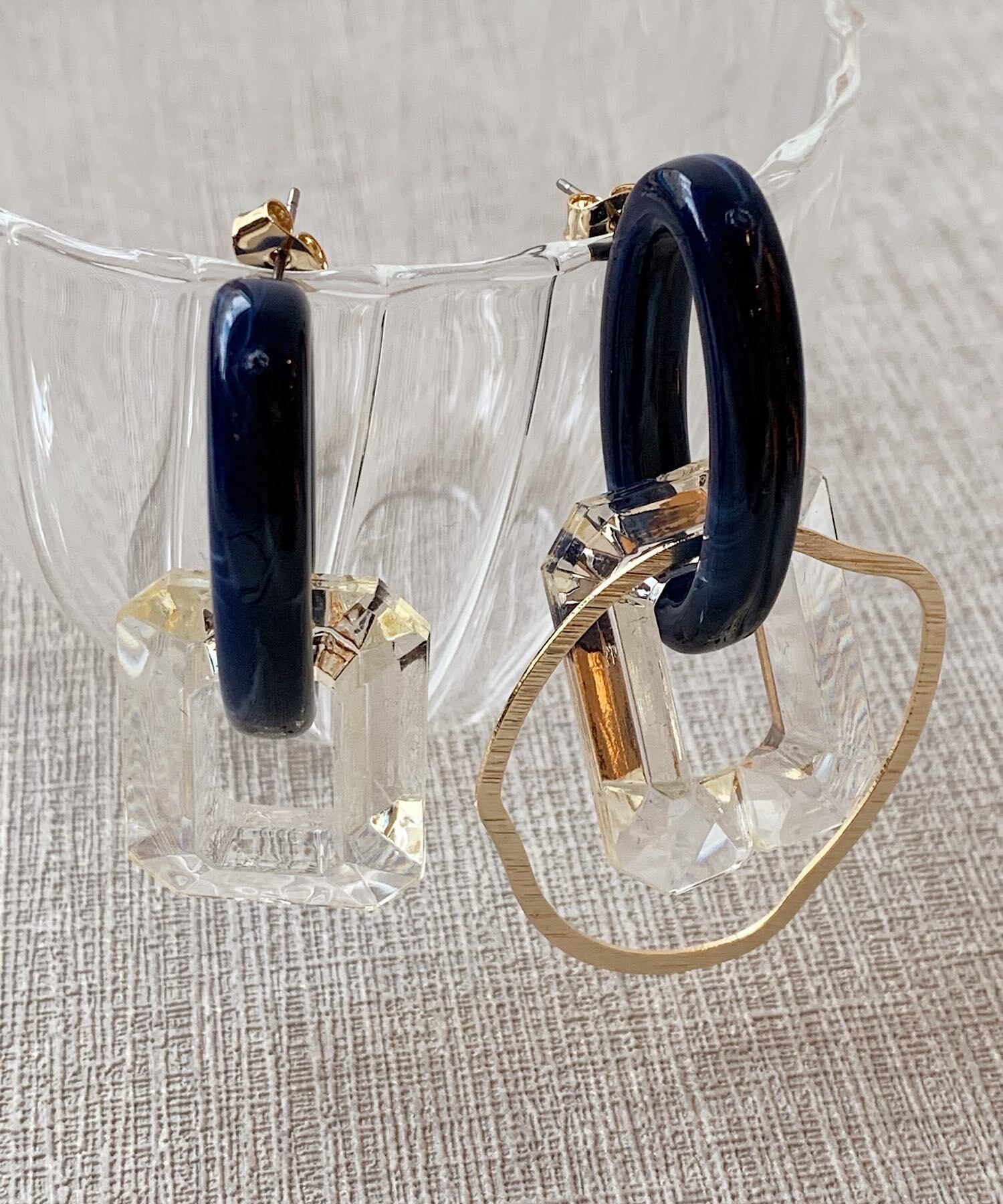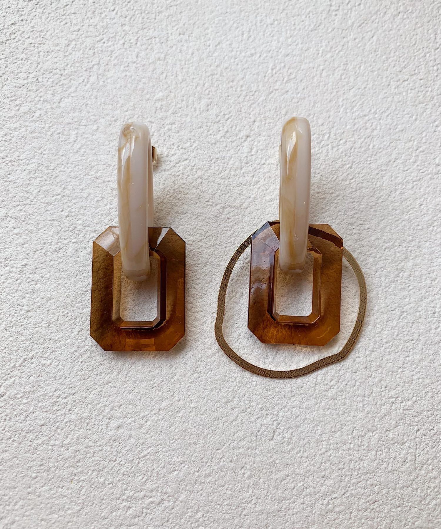 異なる素材、色みのパーツを組み合わせたアシンメトリーピアス。