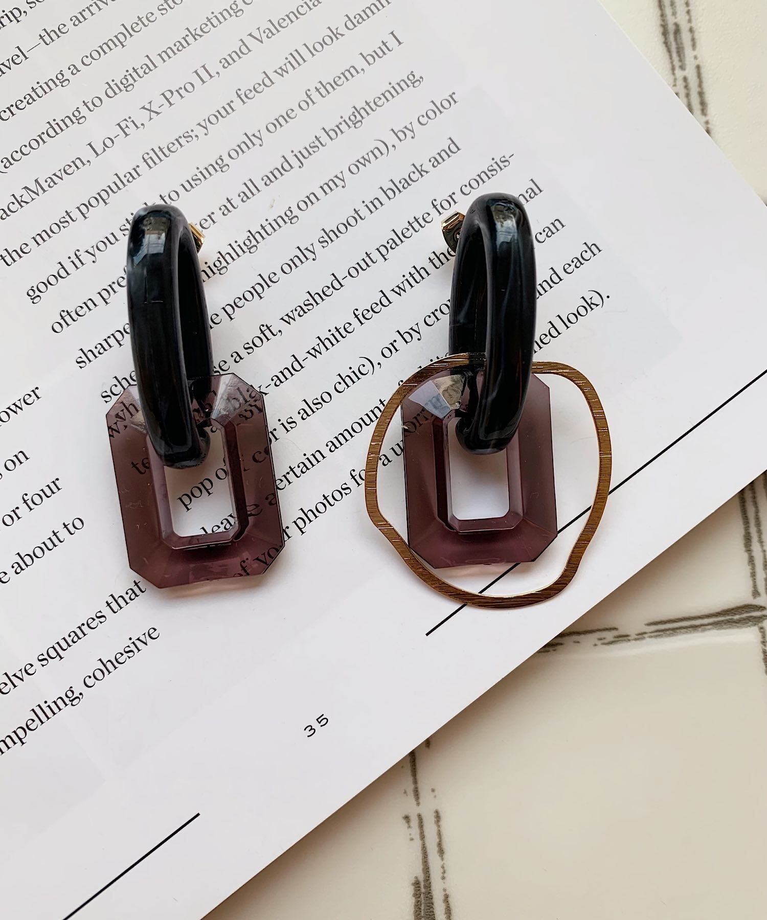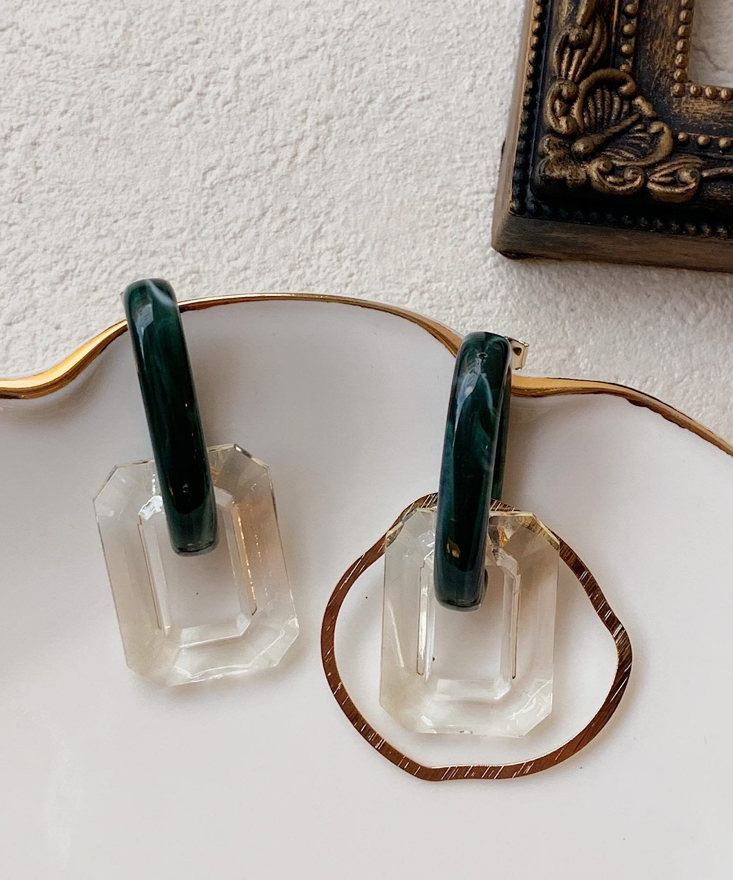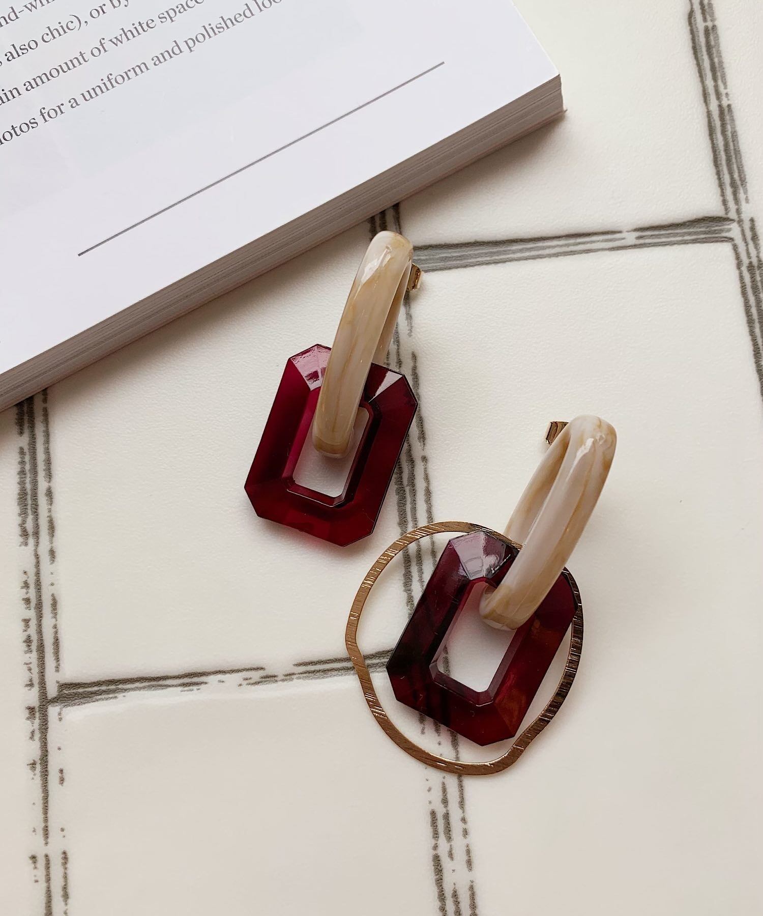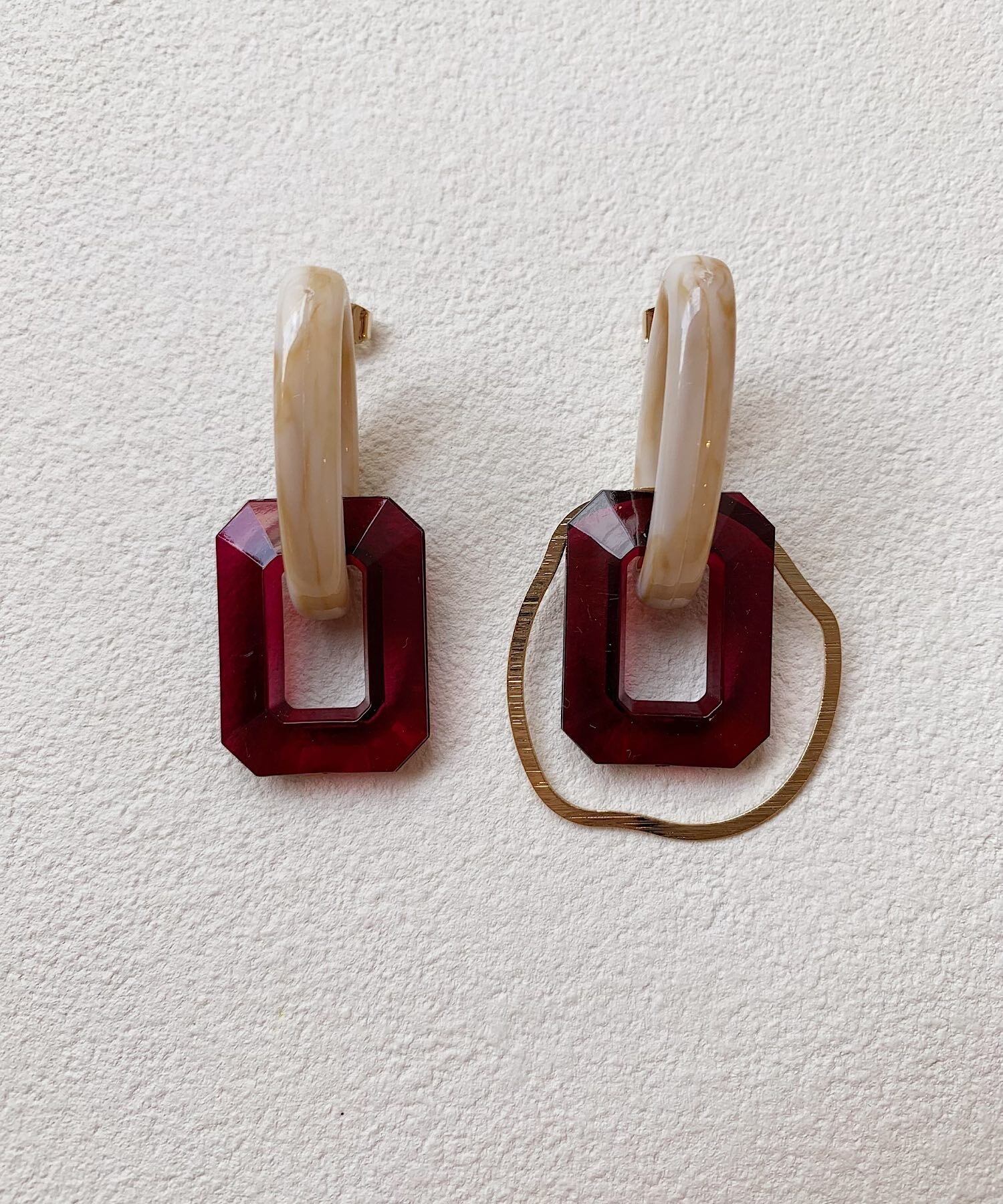 異なる素材、色みのパーツを組み合わせたアシンメトリーピアス。