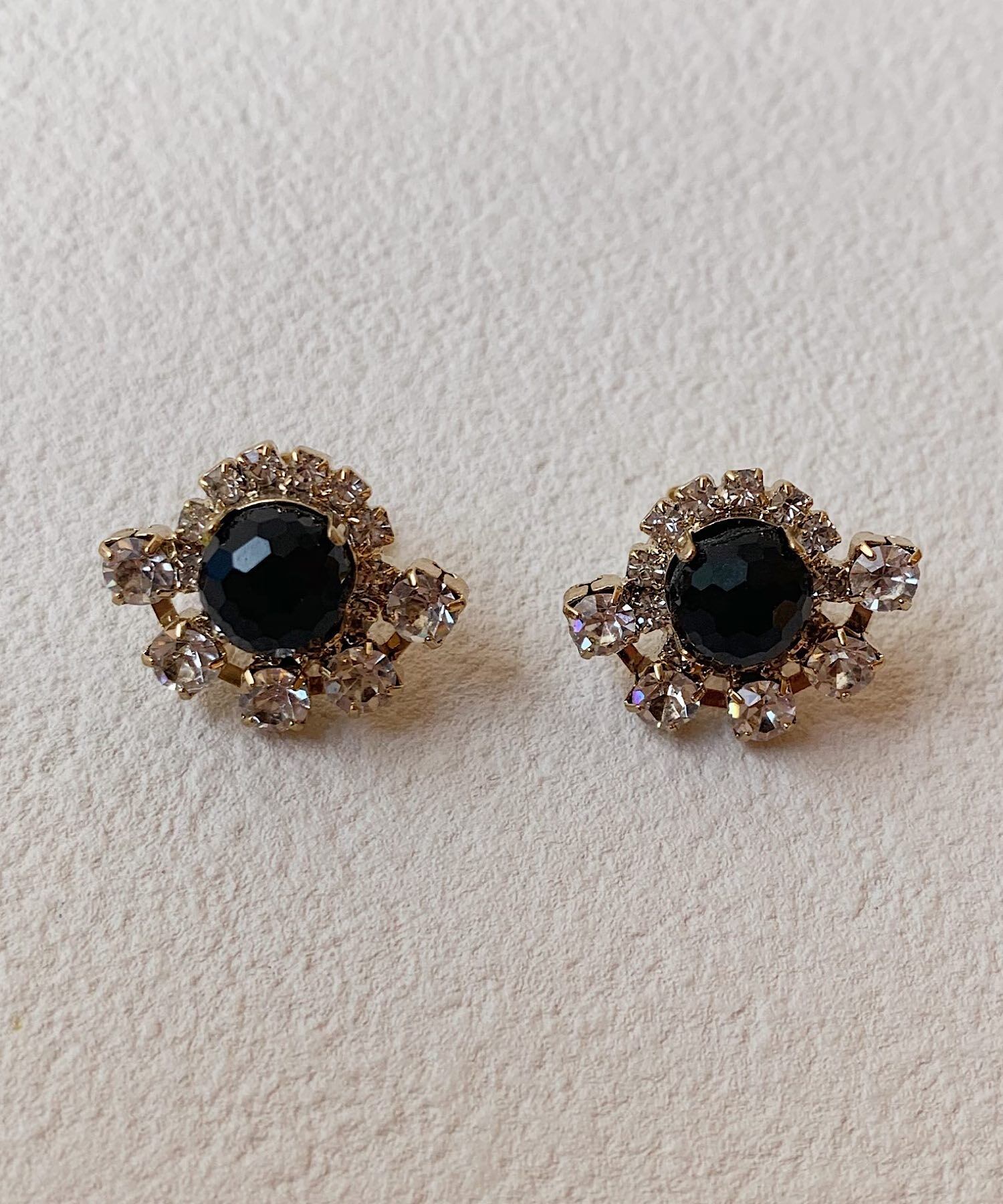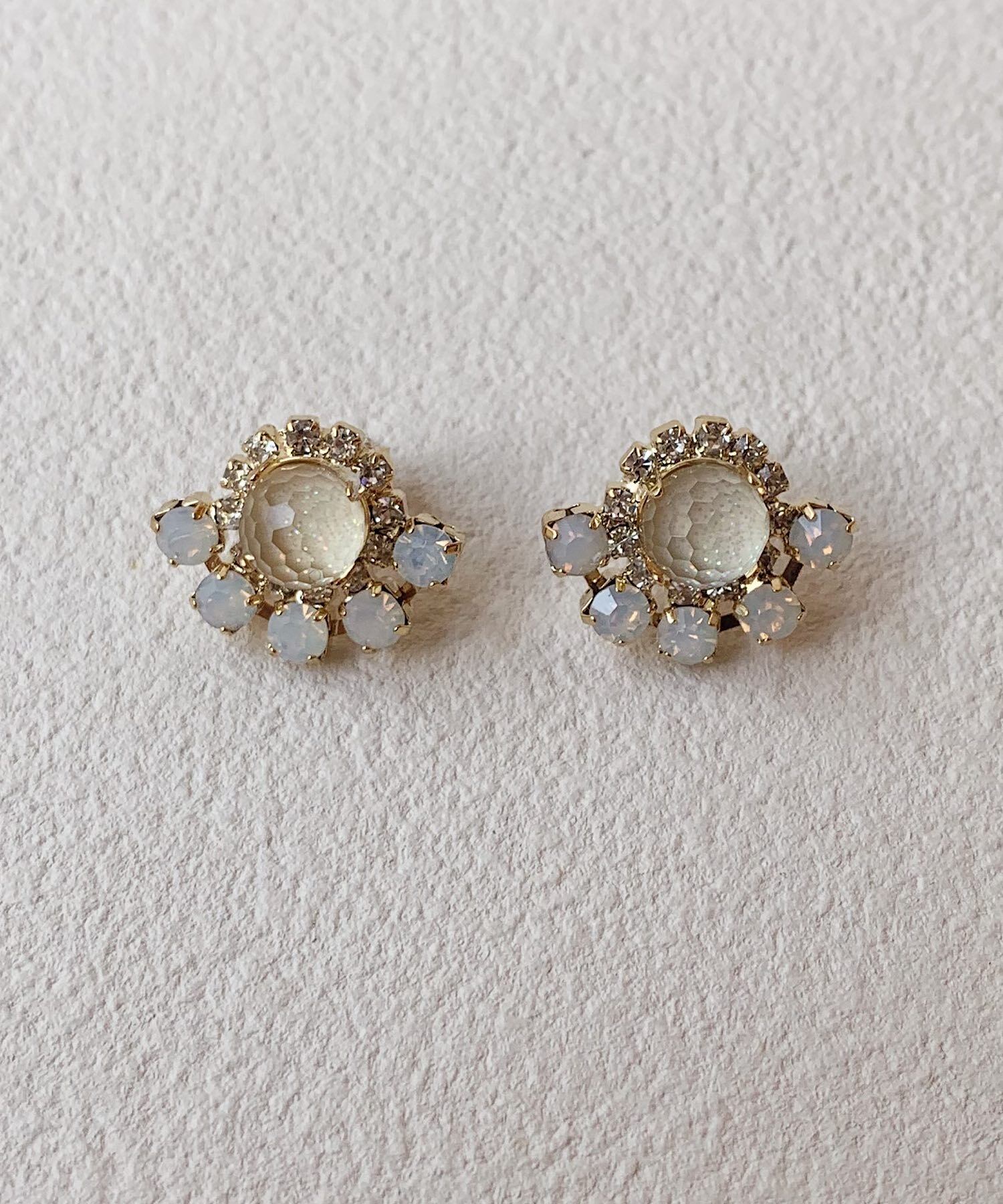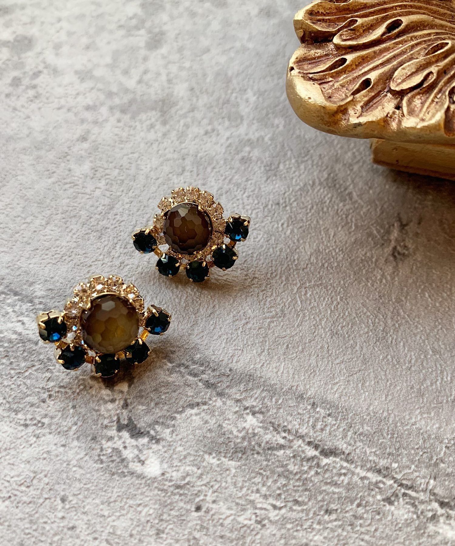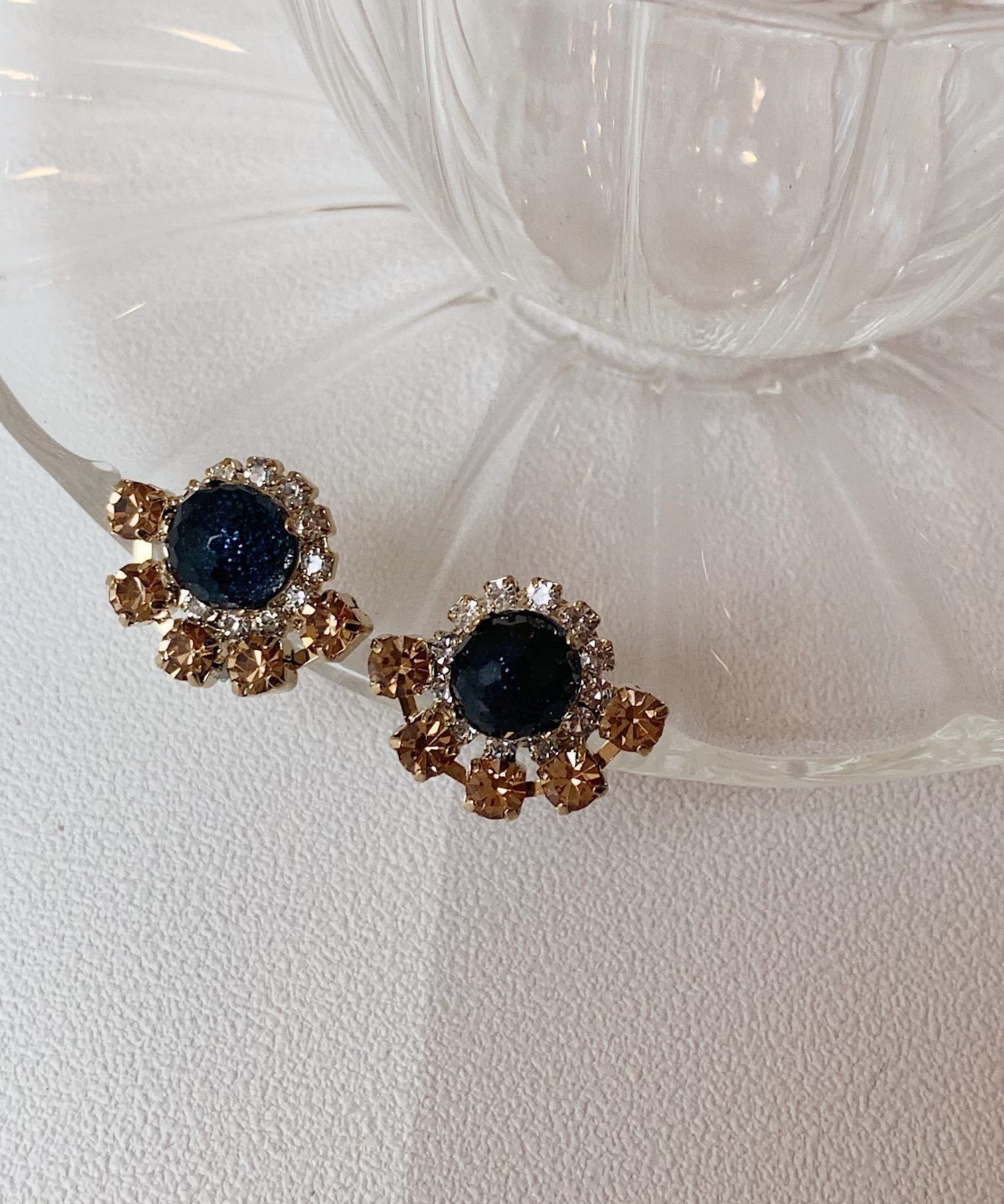 大きなビジューを取り囲むように小さいビジューをちりばめた華やかなピアス。