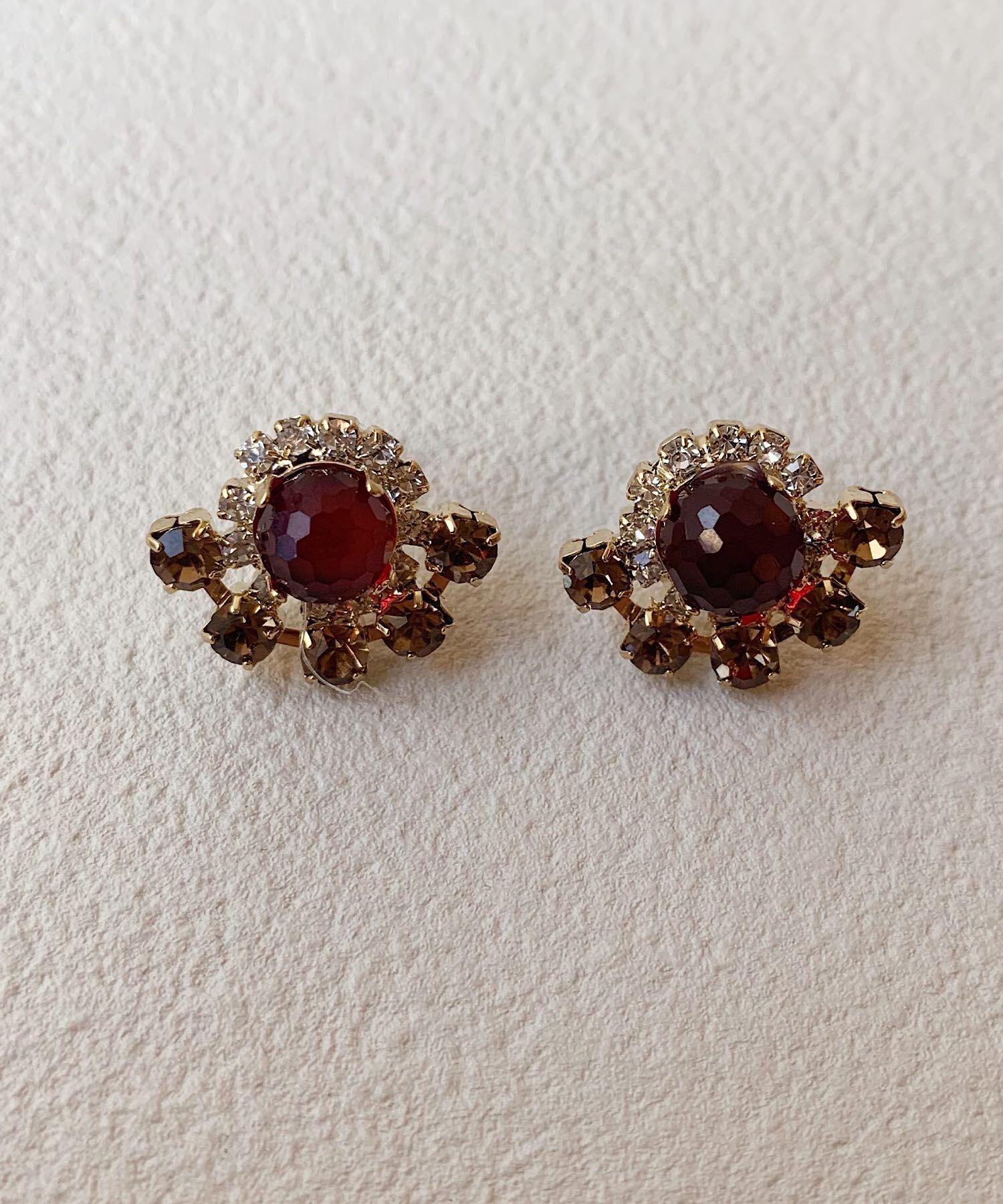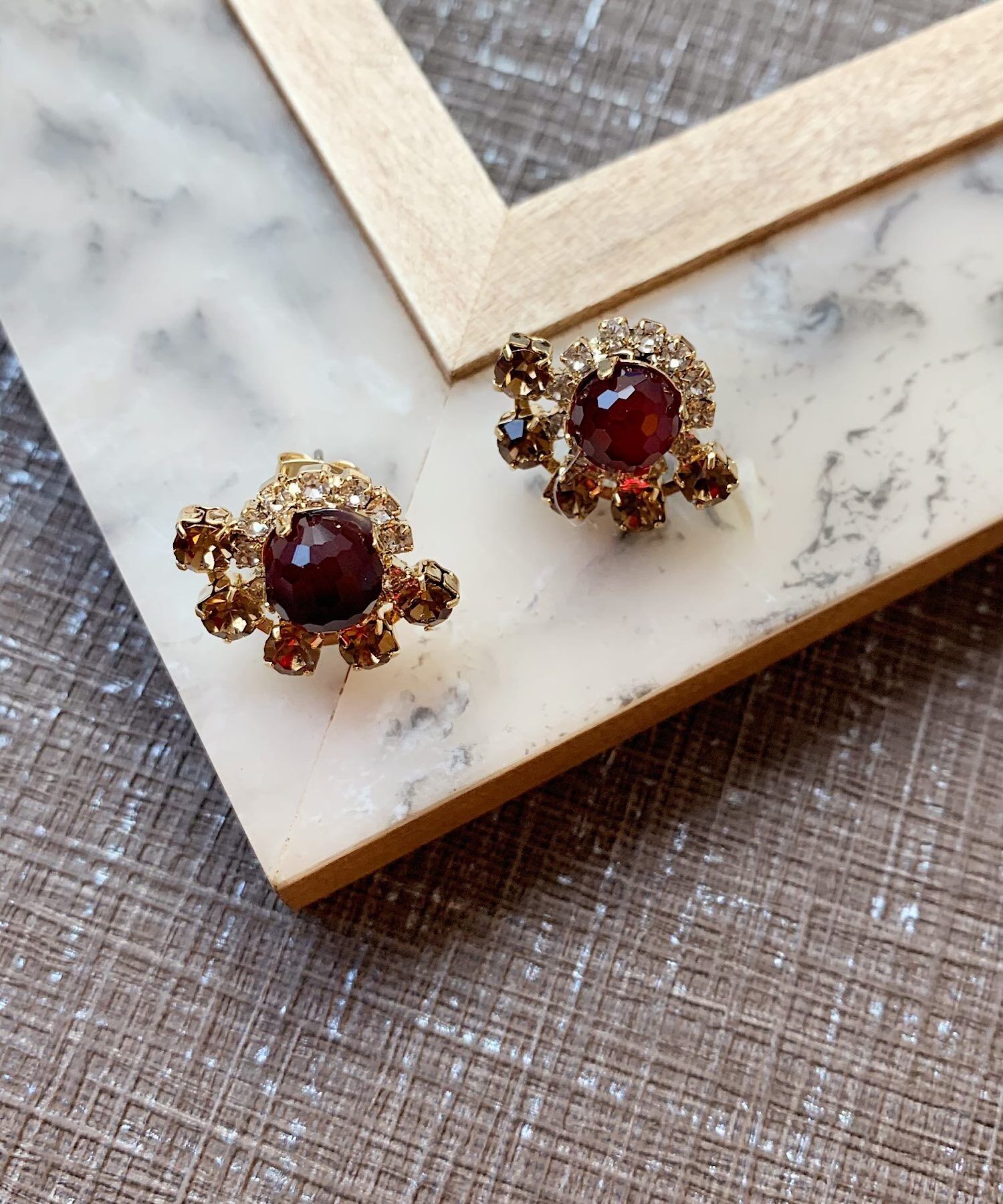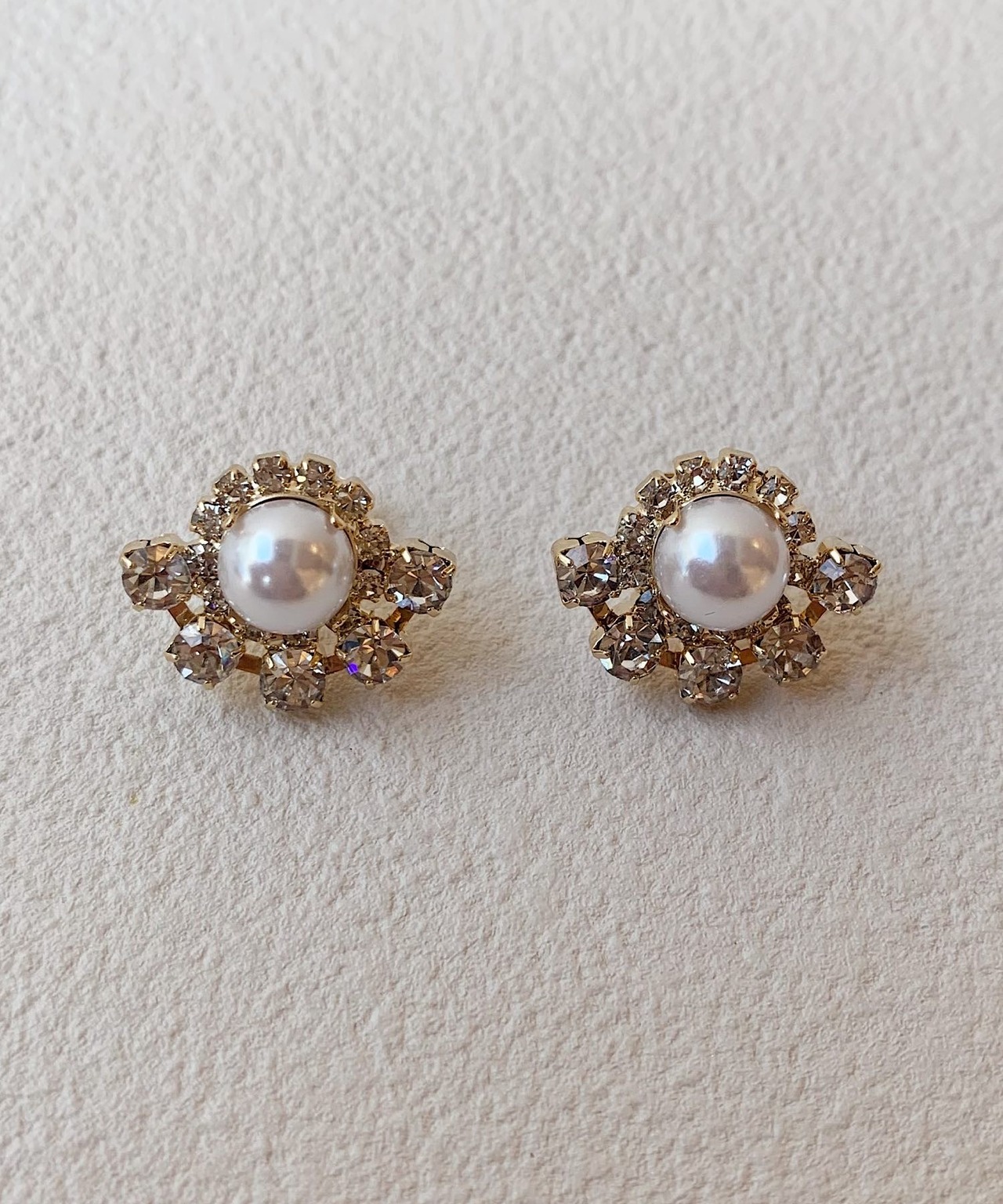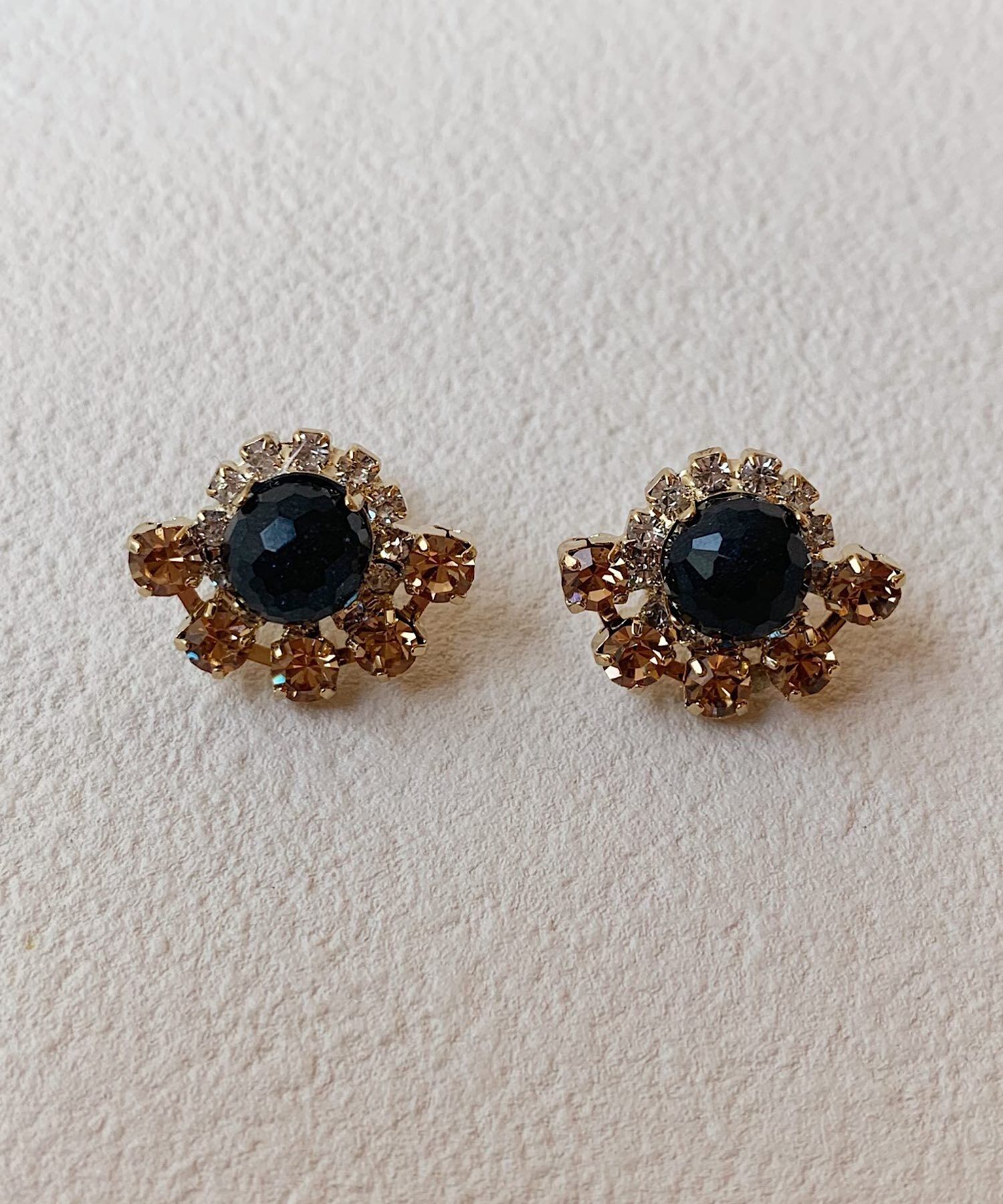 大きなビジューを取り囲むように小さいビジューをちりばめた華やかなピアス。