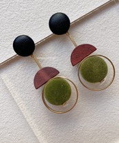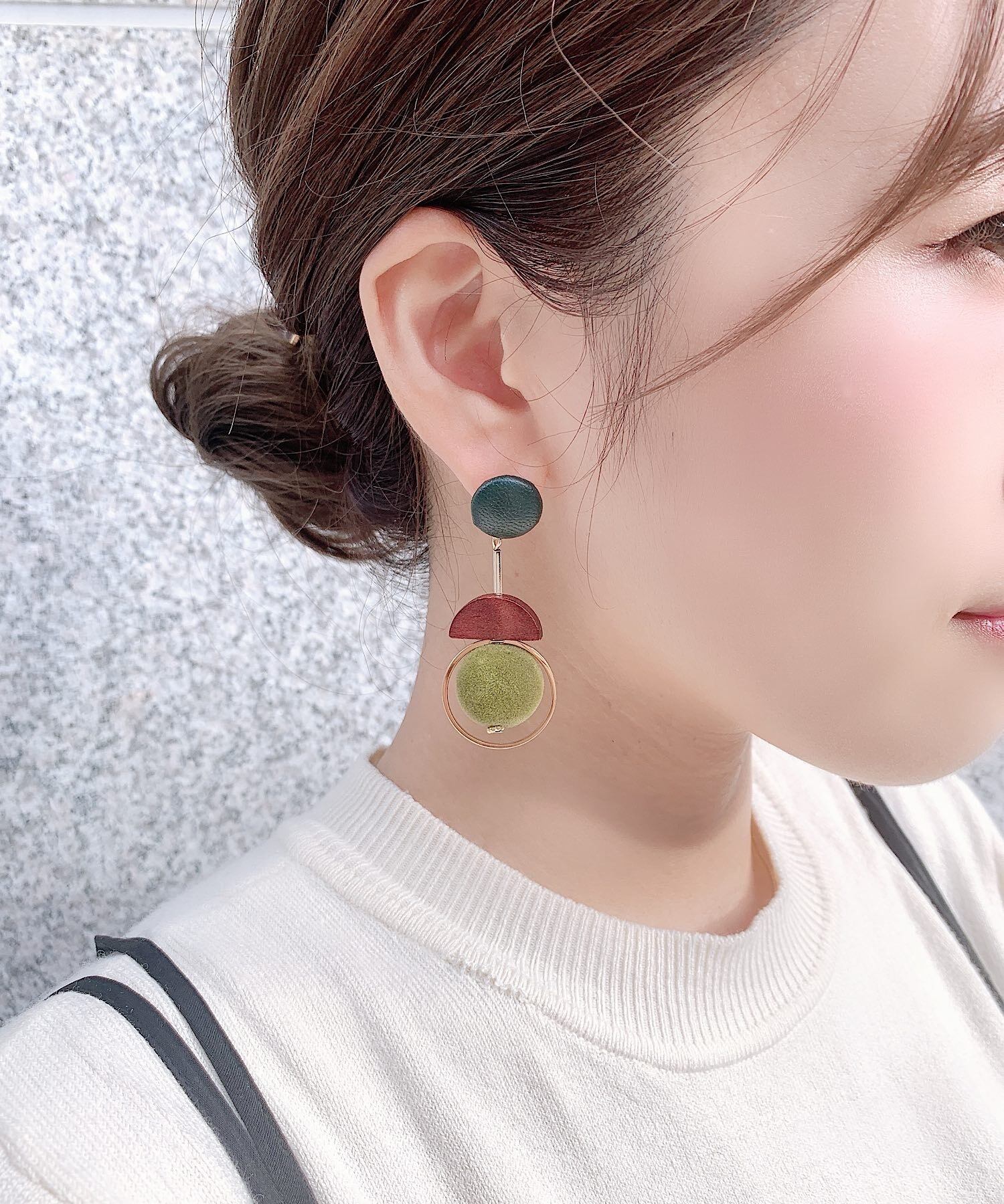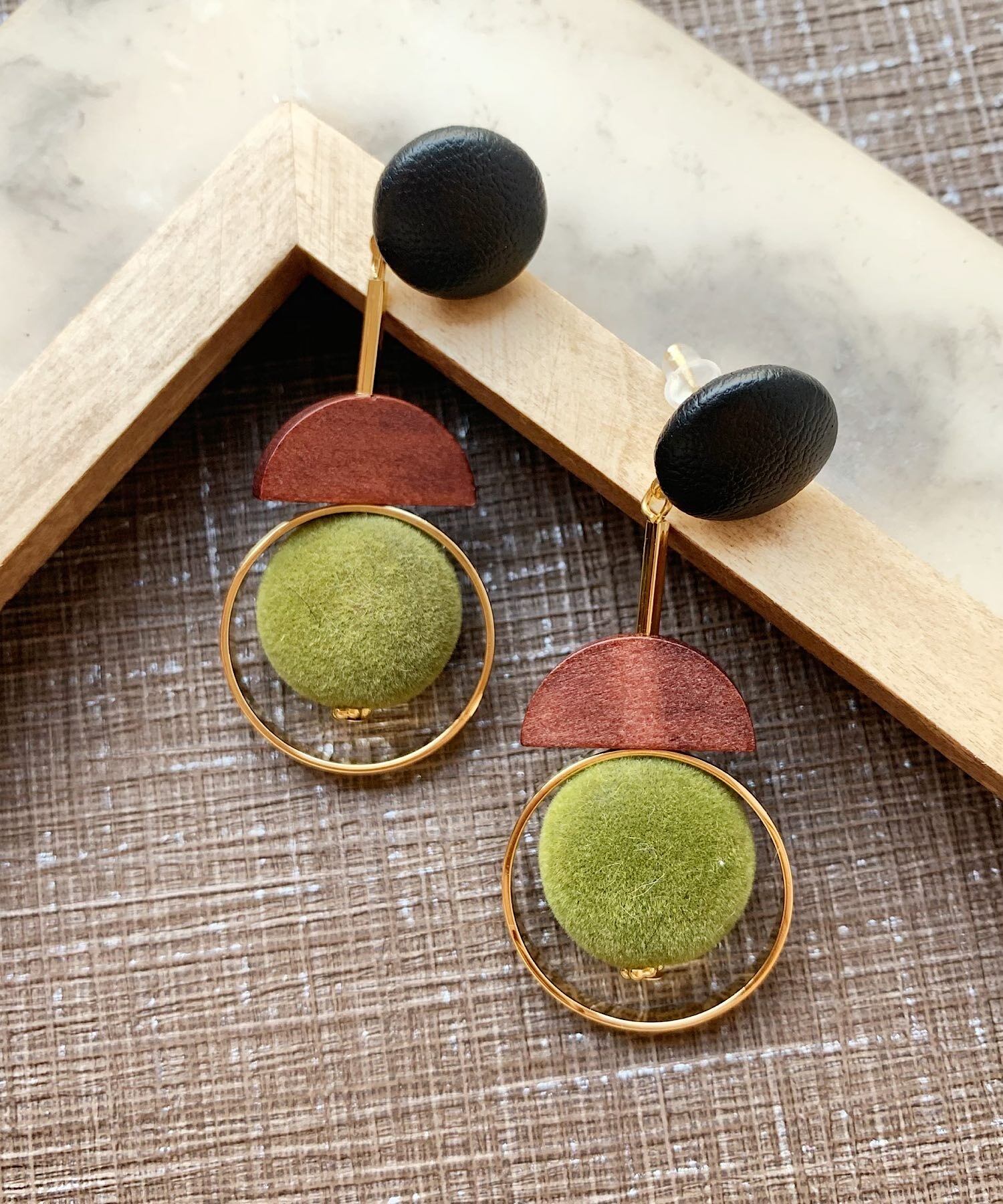 ウッドパーツとベロアパーツを組み合わせたピアス。