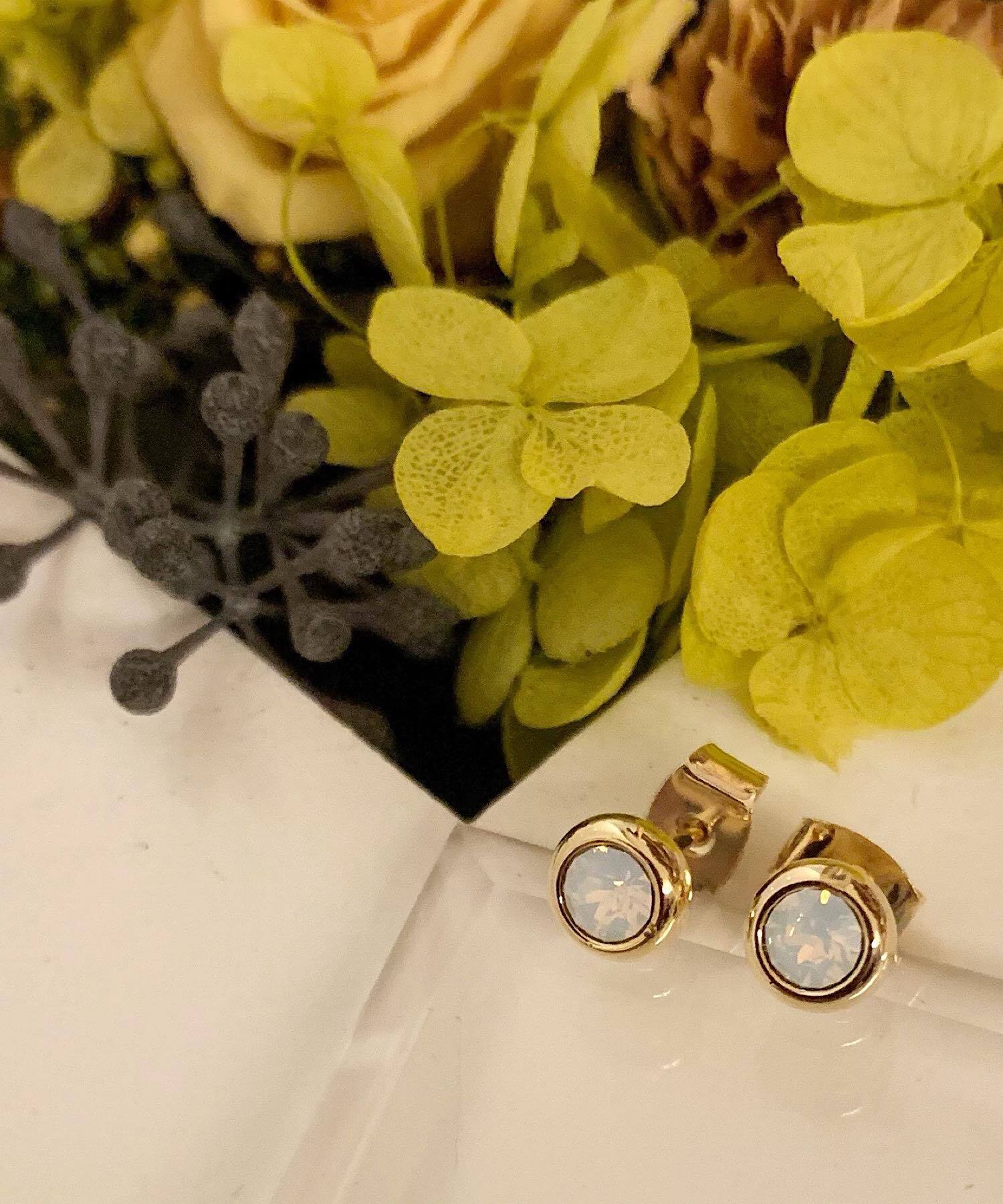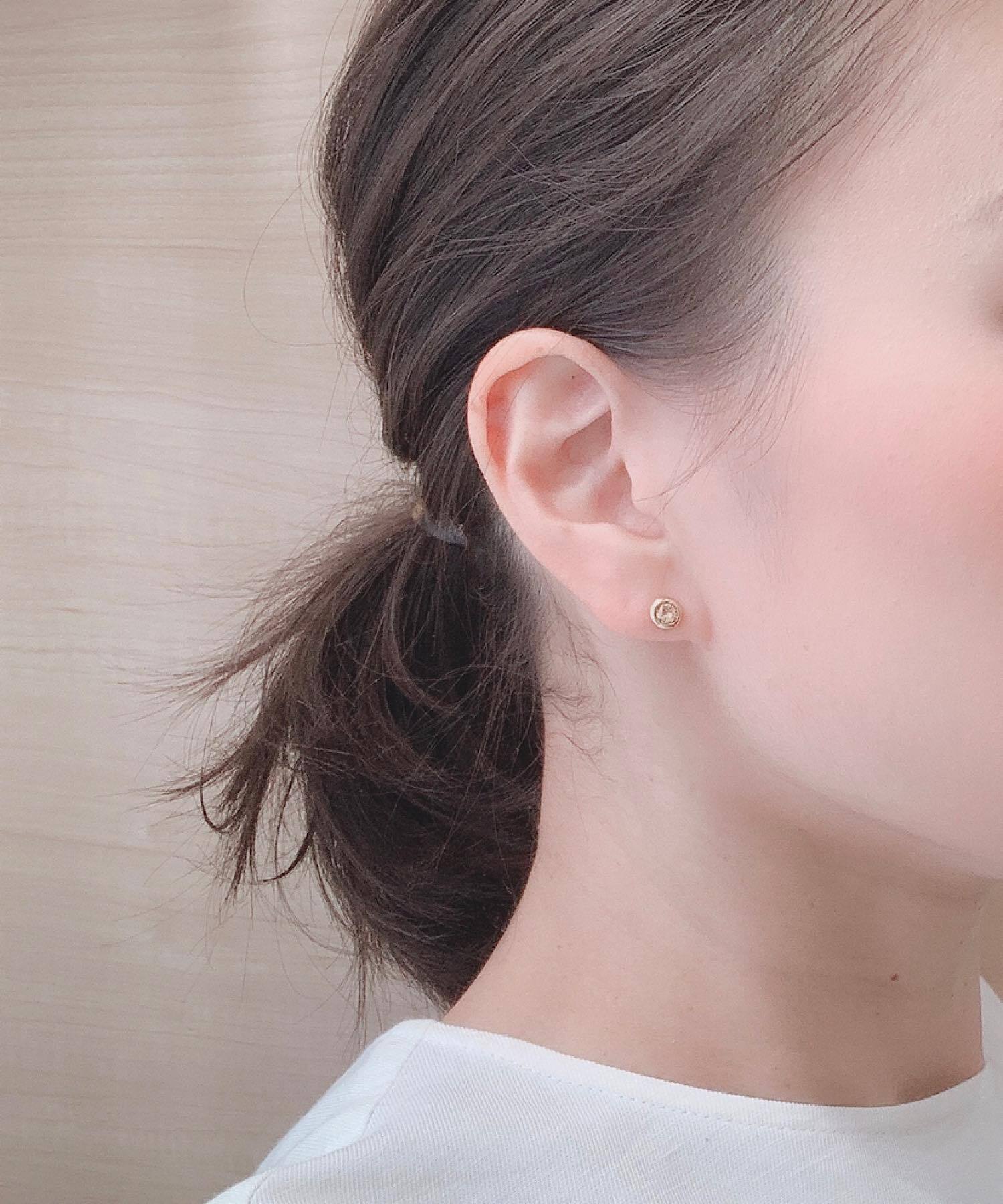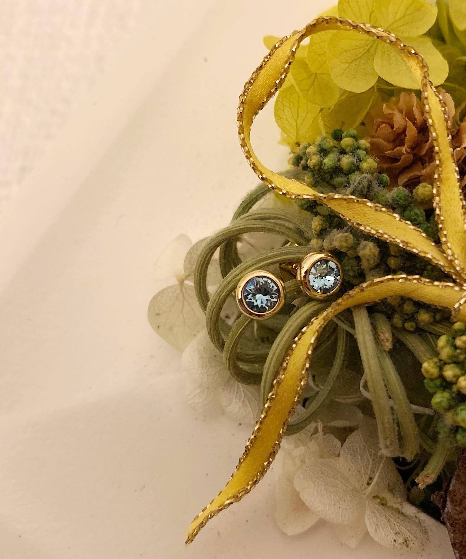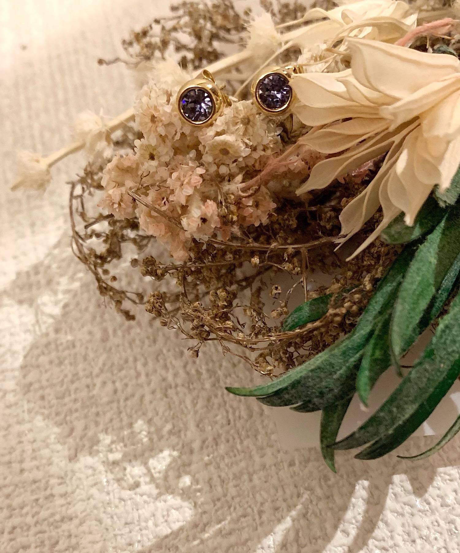 バースデーカラーのストーンを地金で縁取った小ぶりのシンプルなピアス。
