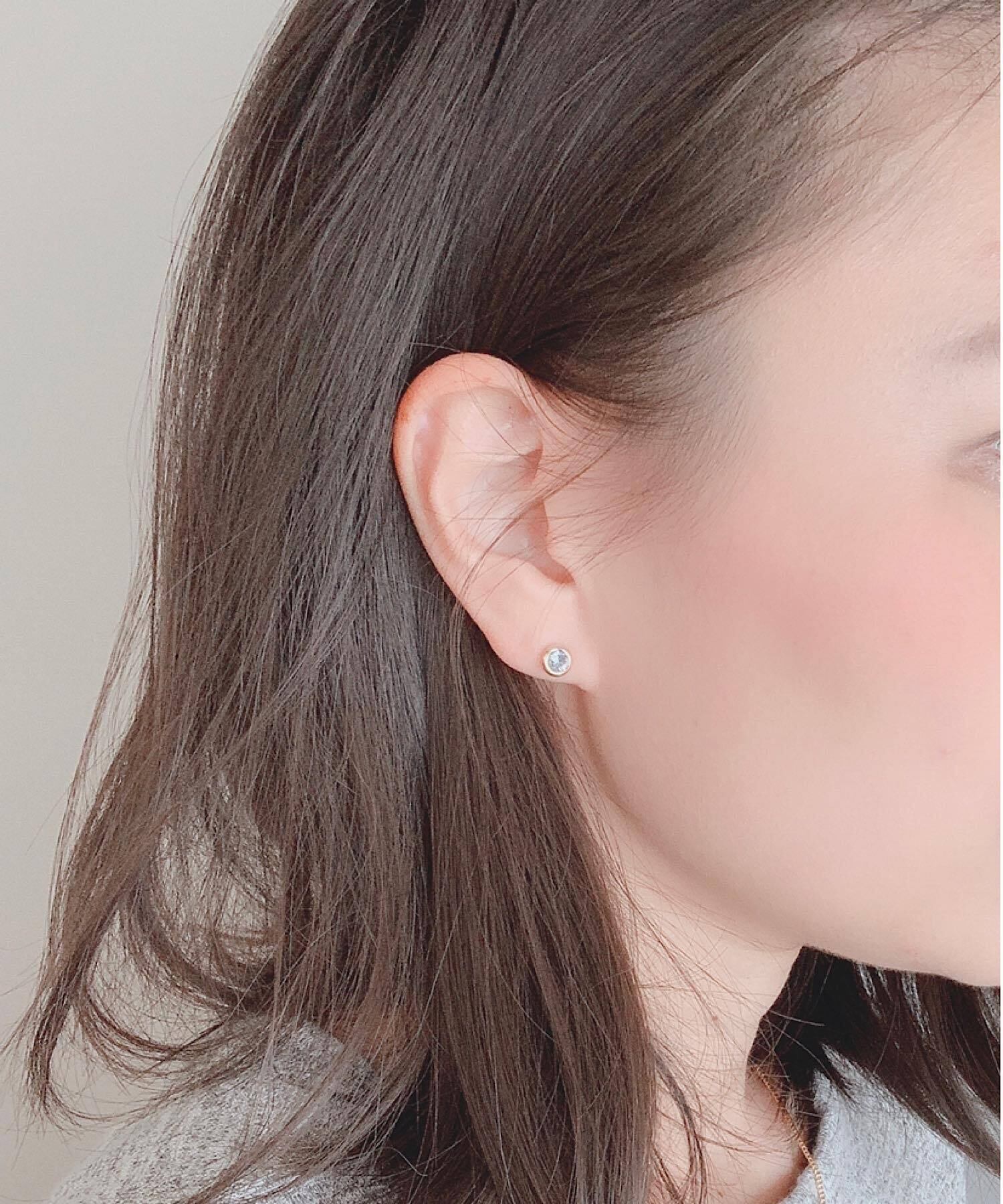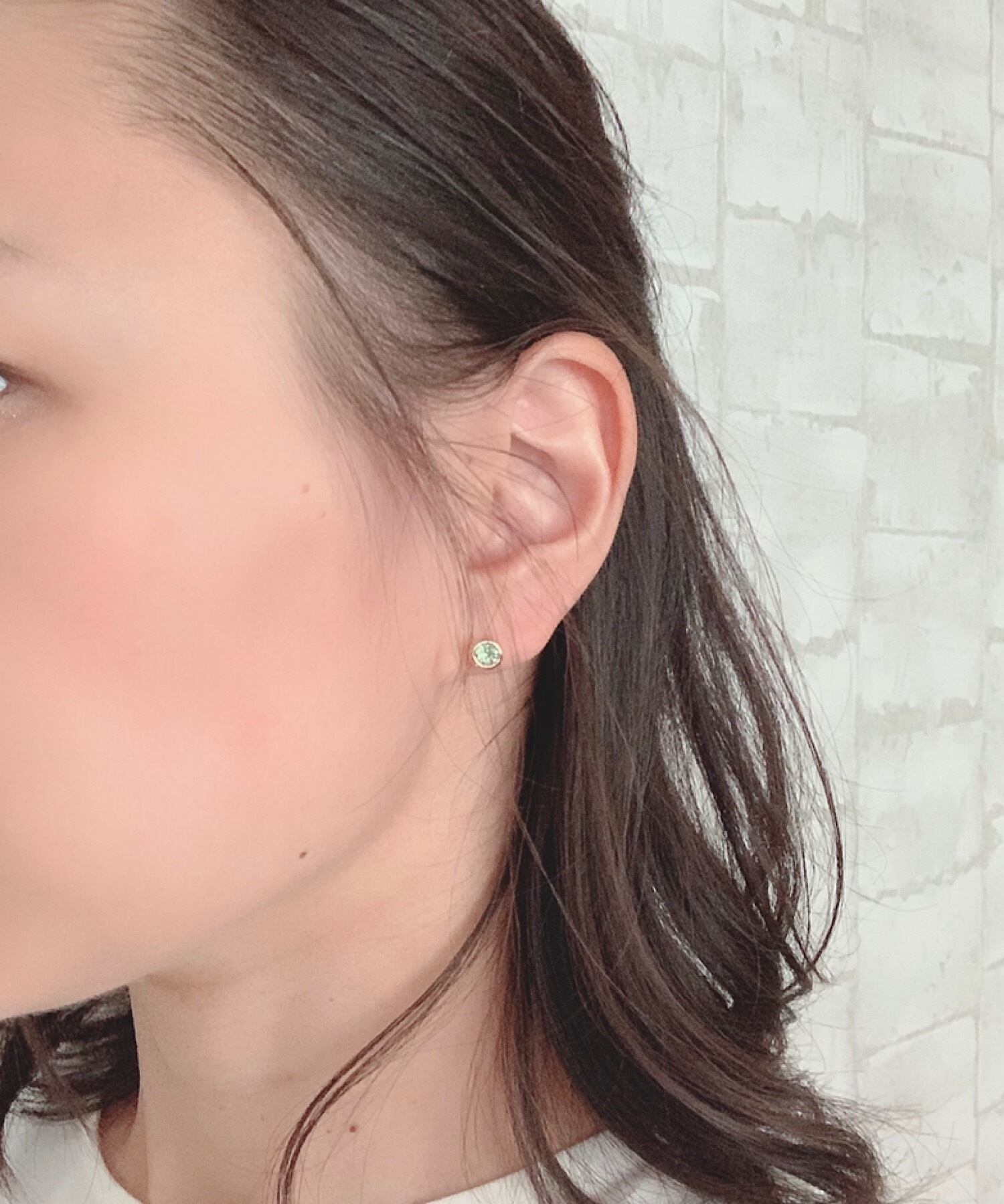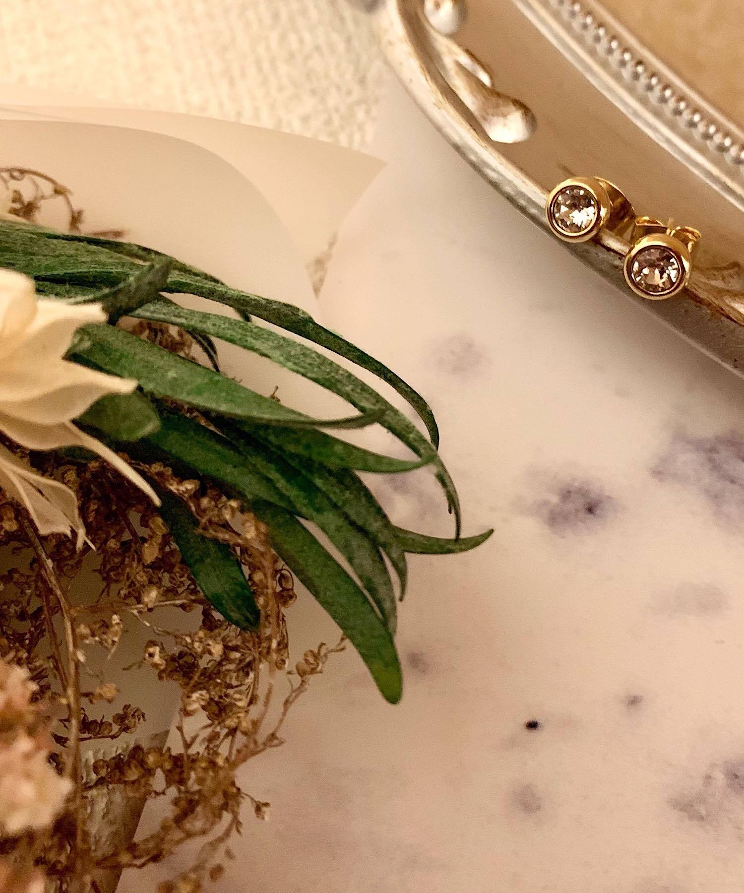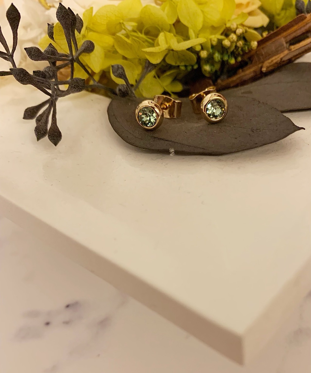 バースデーカラーのストーンを地金で縁取った小ぶりのシンプルなピアス。