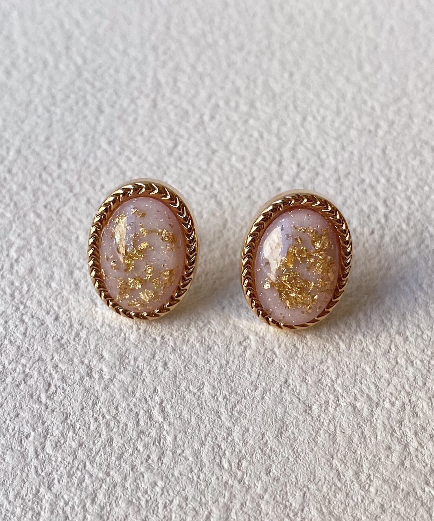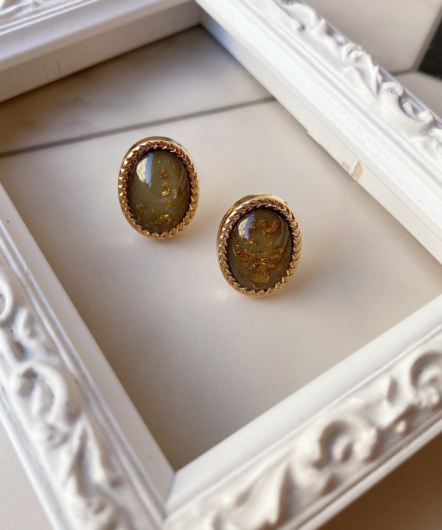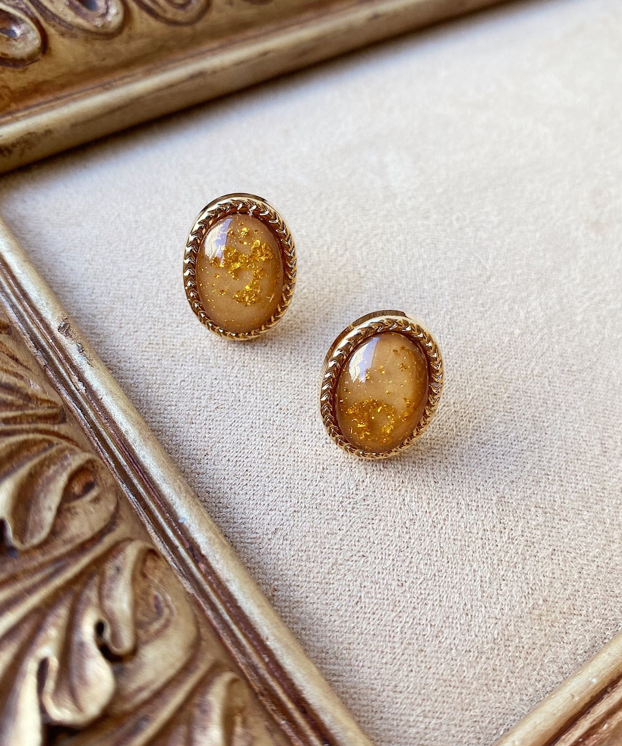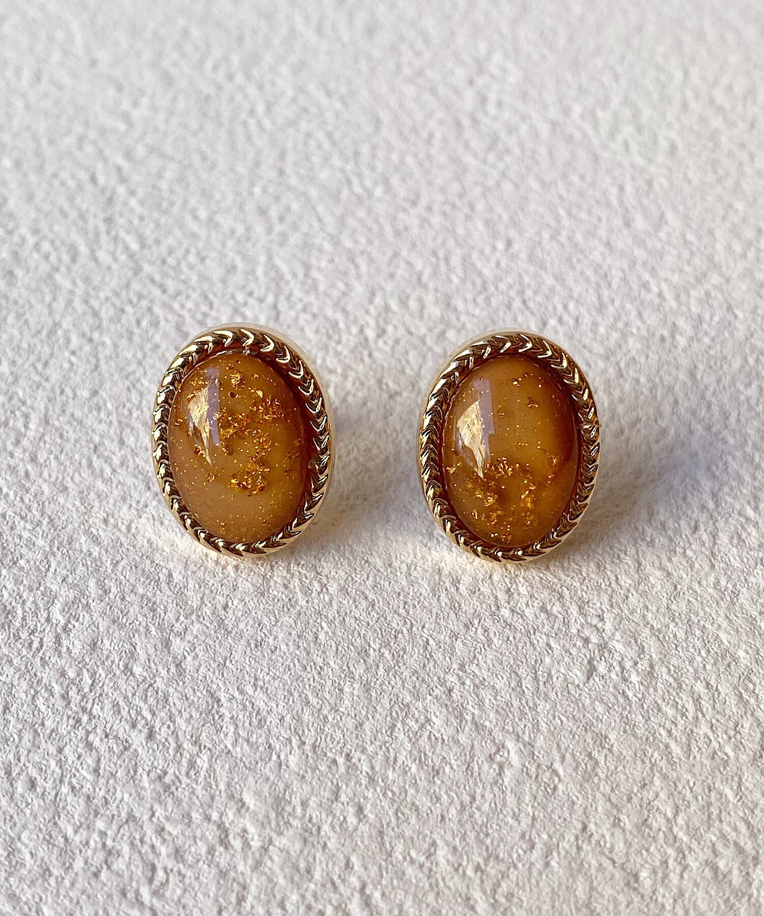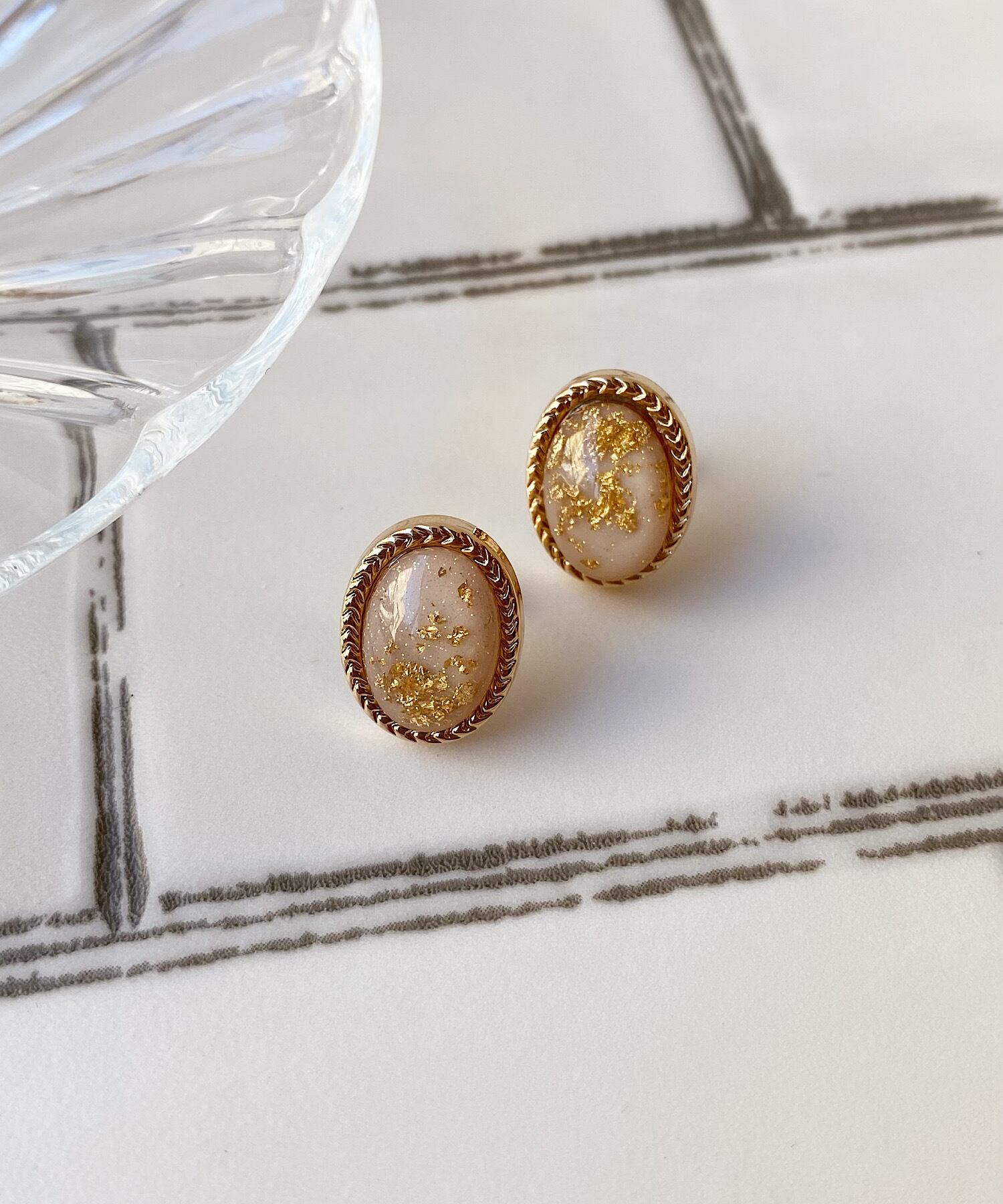 透明感ある丸みなフォルムに、金箔を散りばめたアンティーク調な表情が魅力的なピアス。
