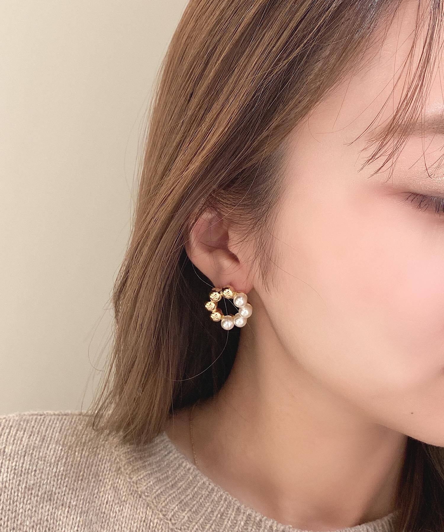 パールとメタルのボールパーツをお花のように並べたピアス。