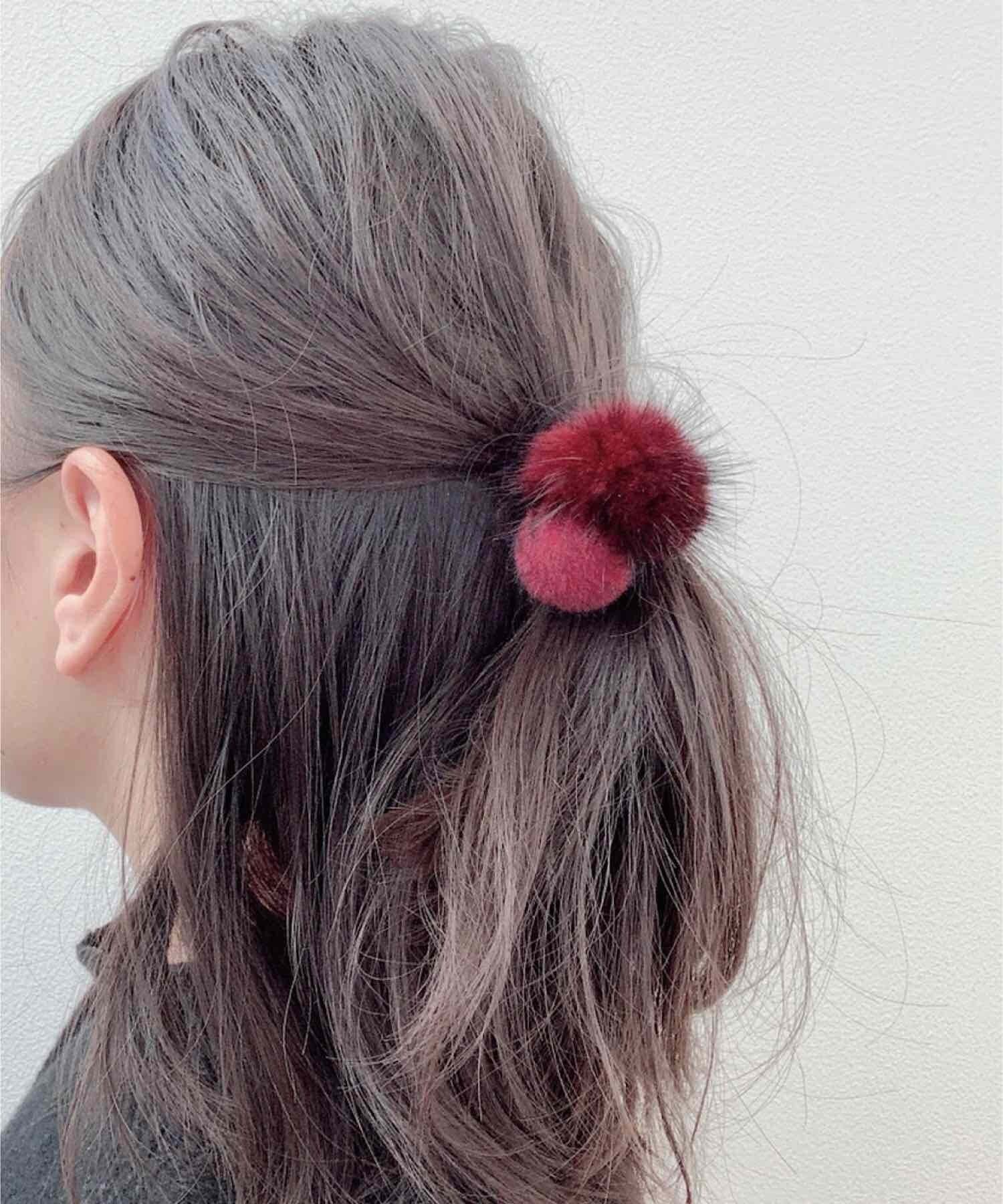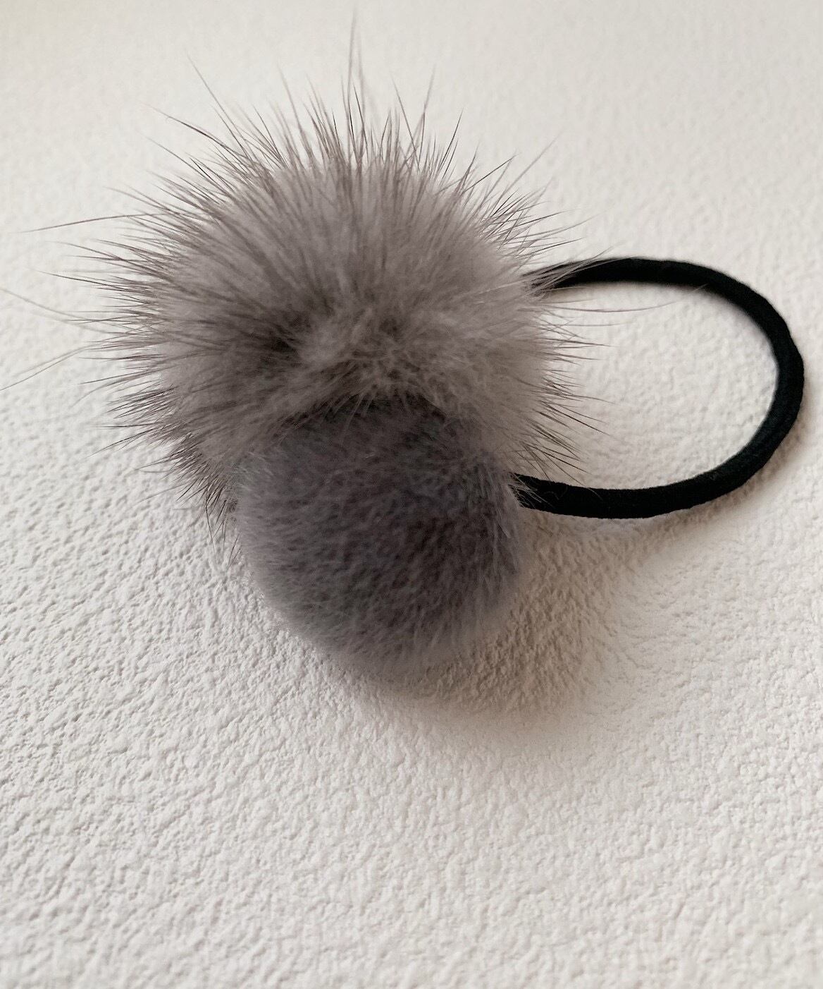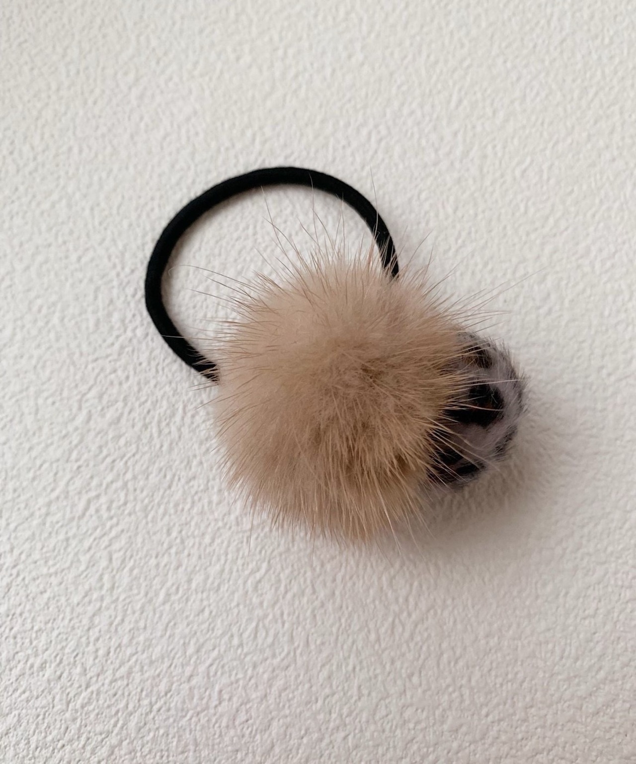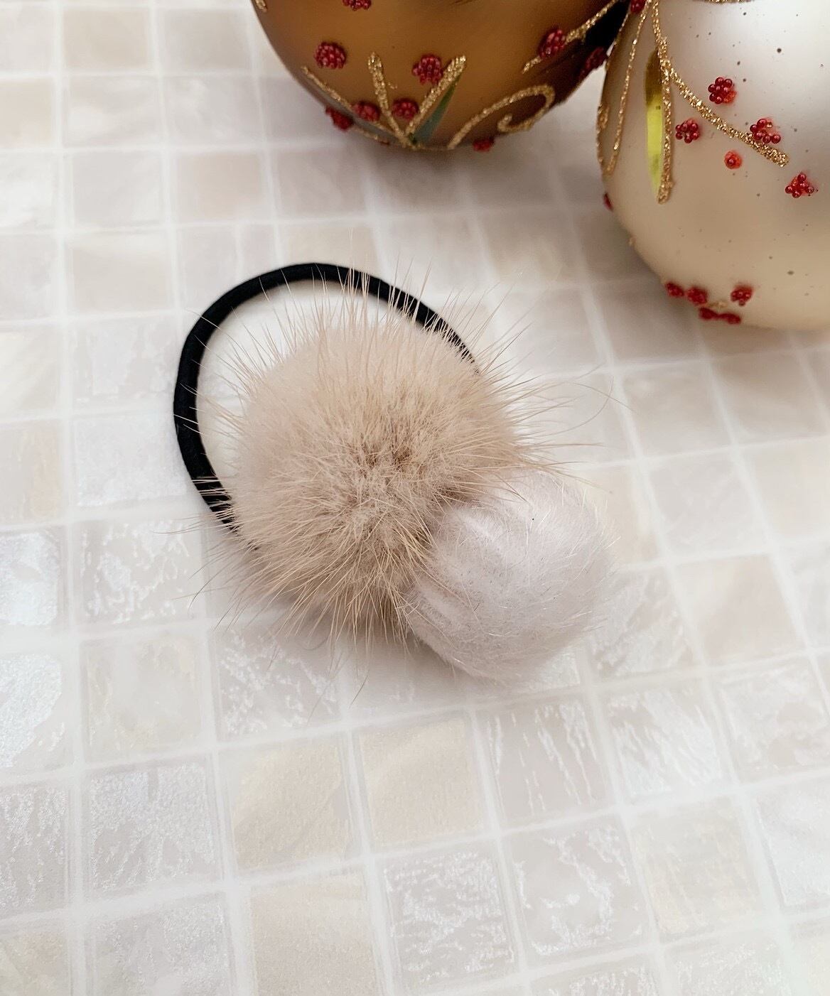大きめでふわふわのボンボンと小さめでモコモコのボンボンを組み合わせたヘアゴム。