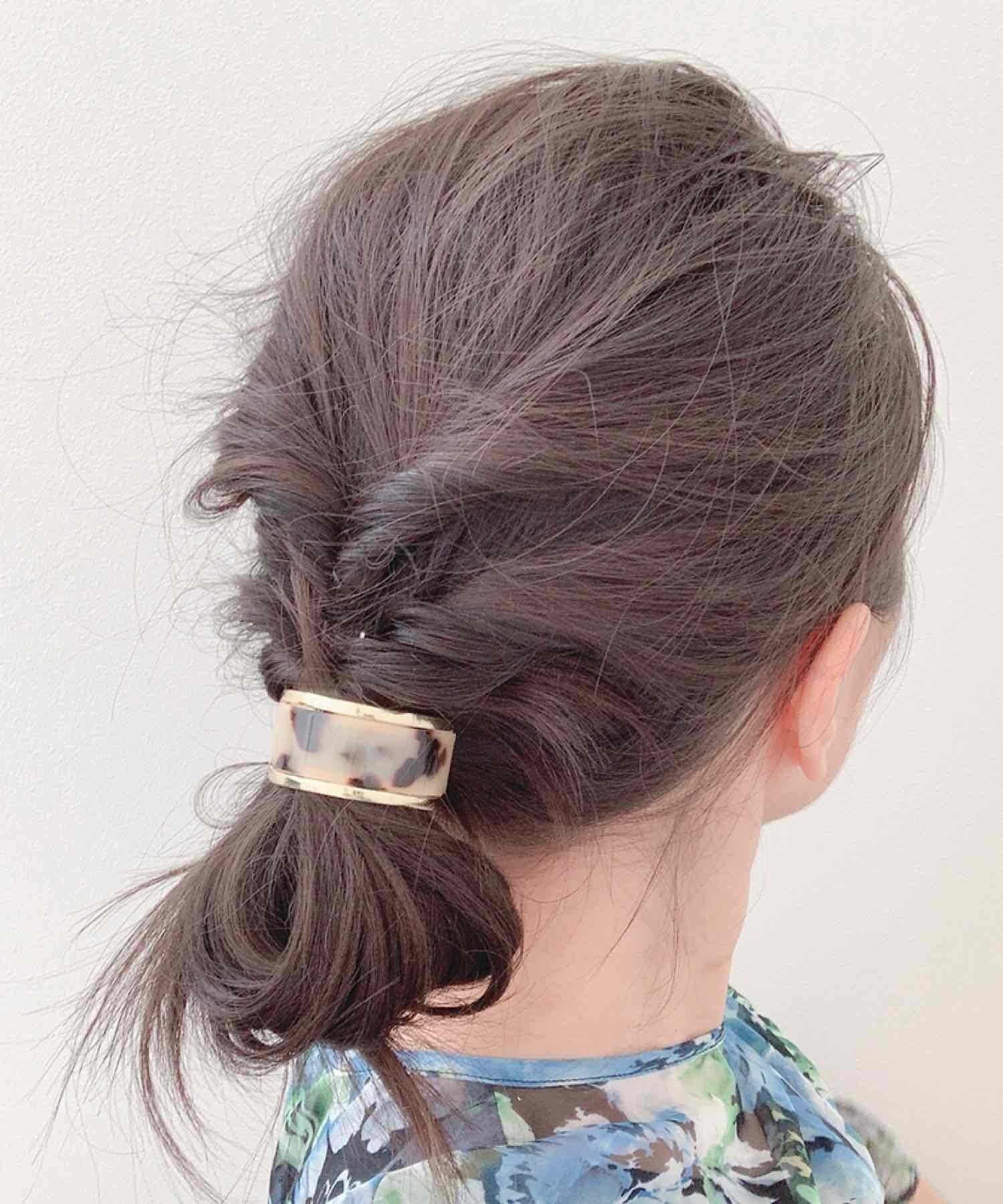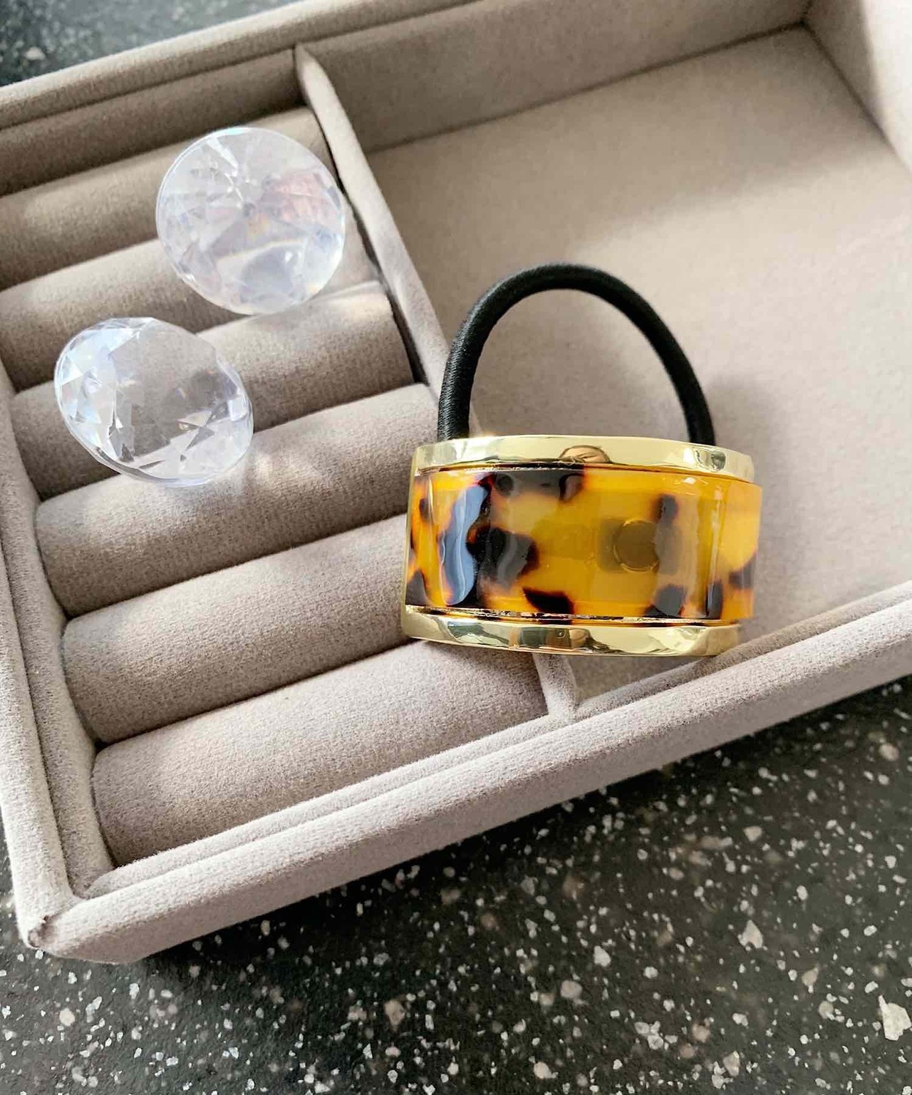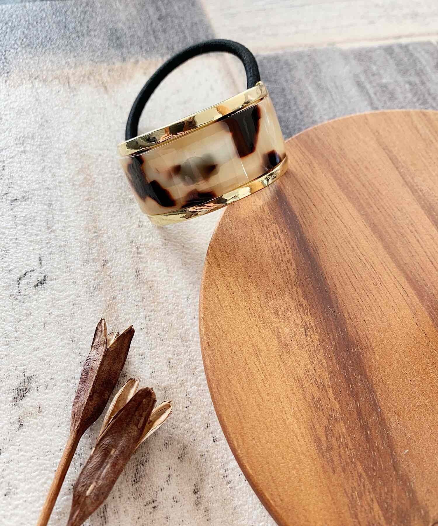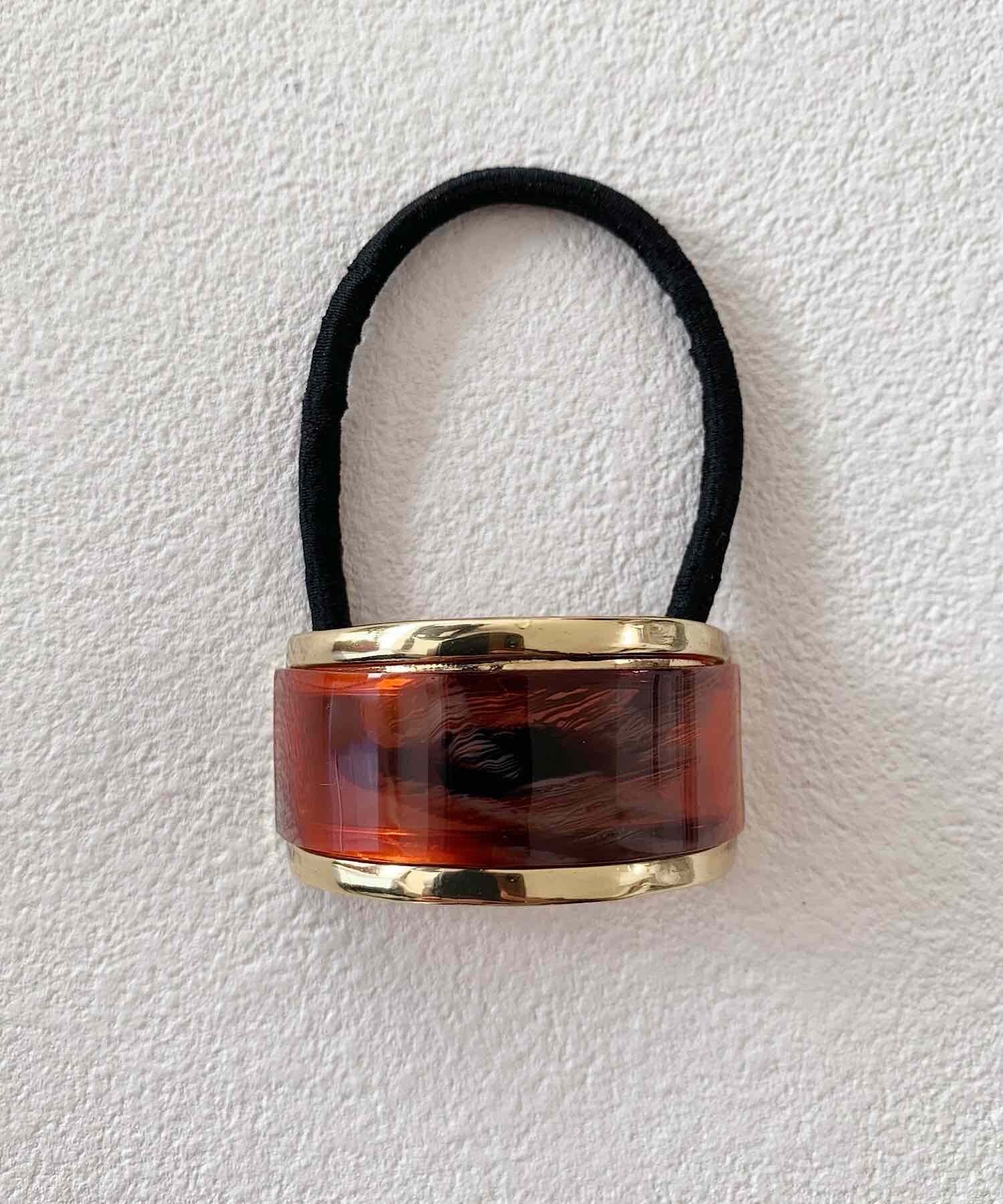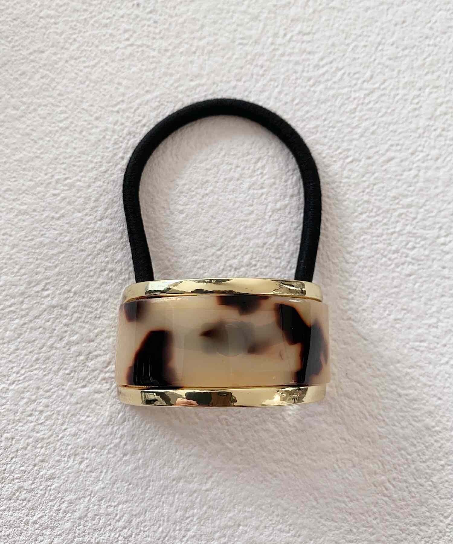 ゴールドのヘアカフスに艶と厚みのあるモチーフを重ねたヘアゴム。