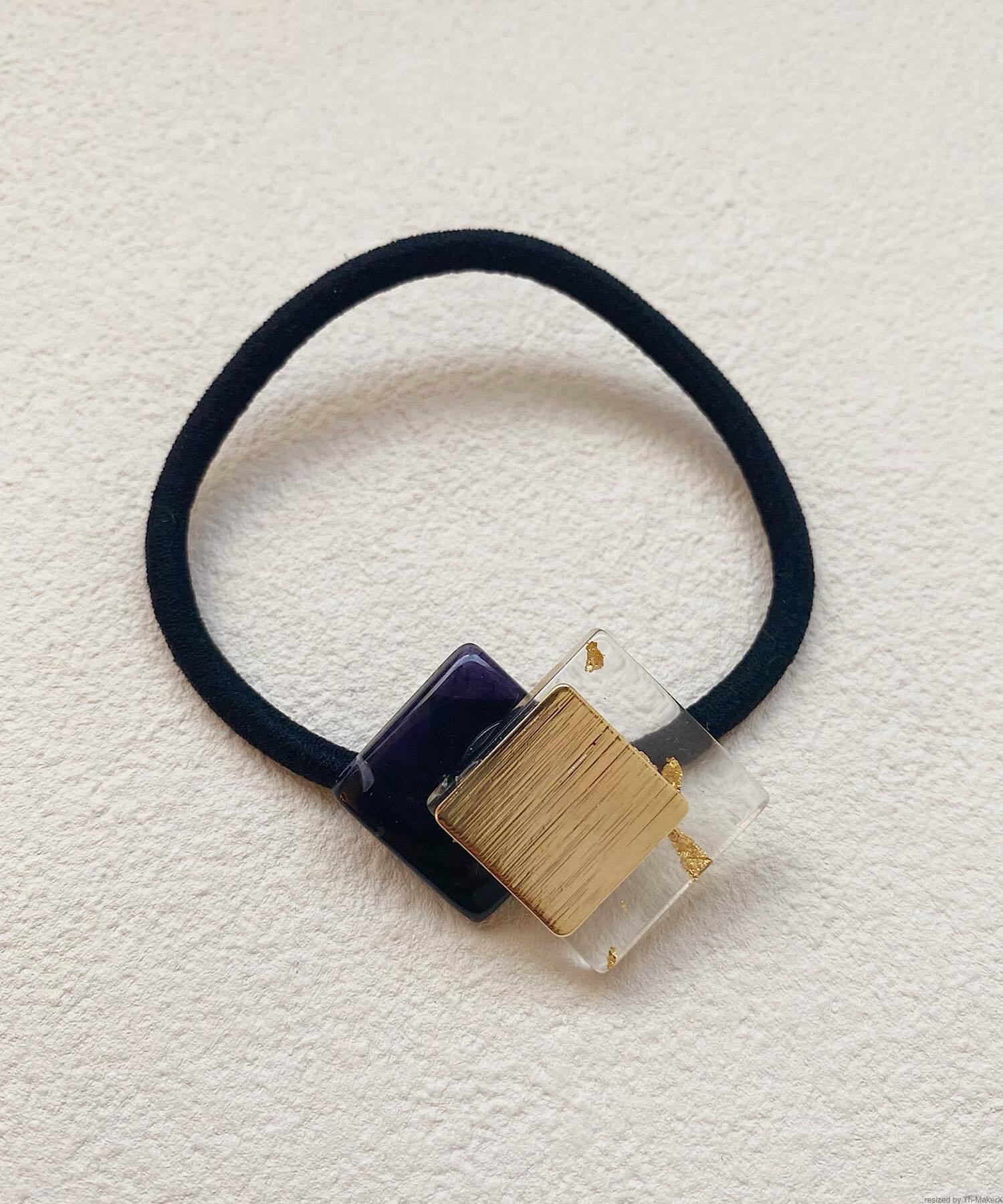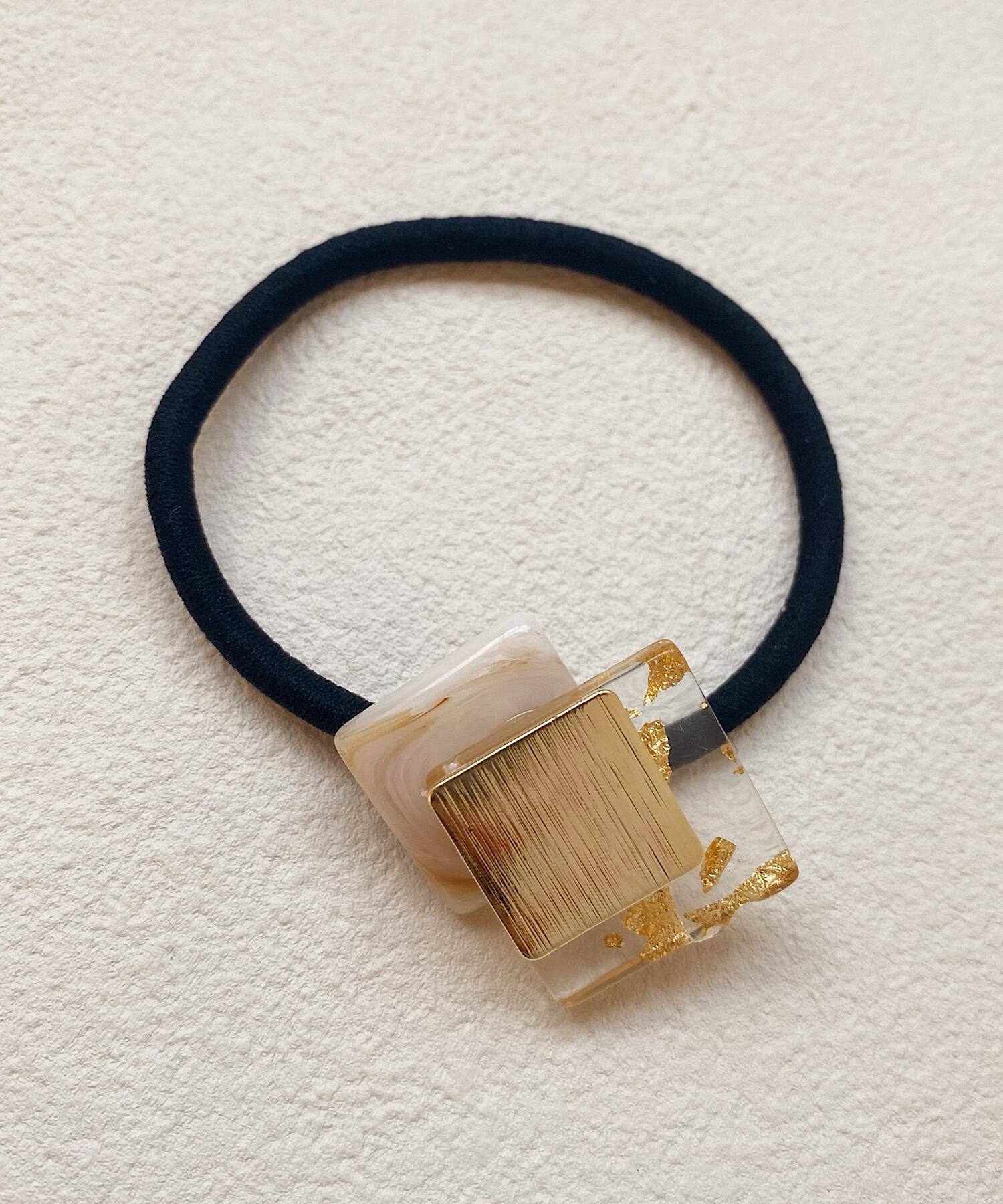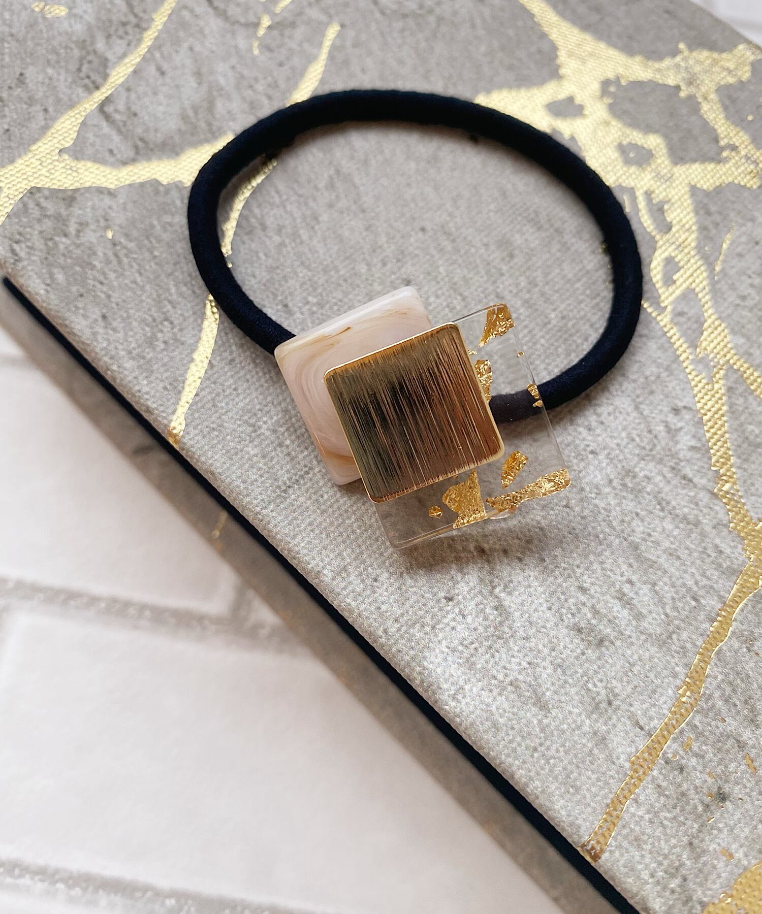 マーブルストーンに金箔が散りばめられたクリアパーツを組み合わせたヘアゴム。
