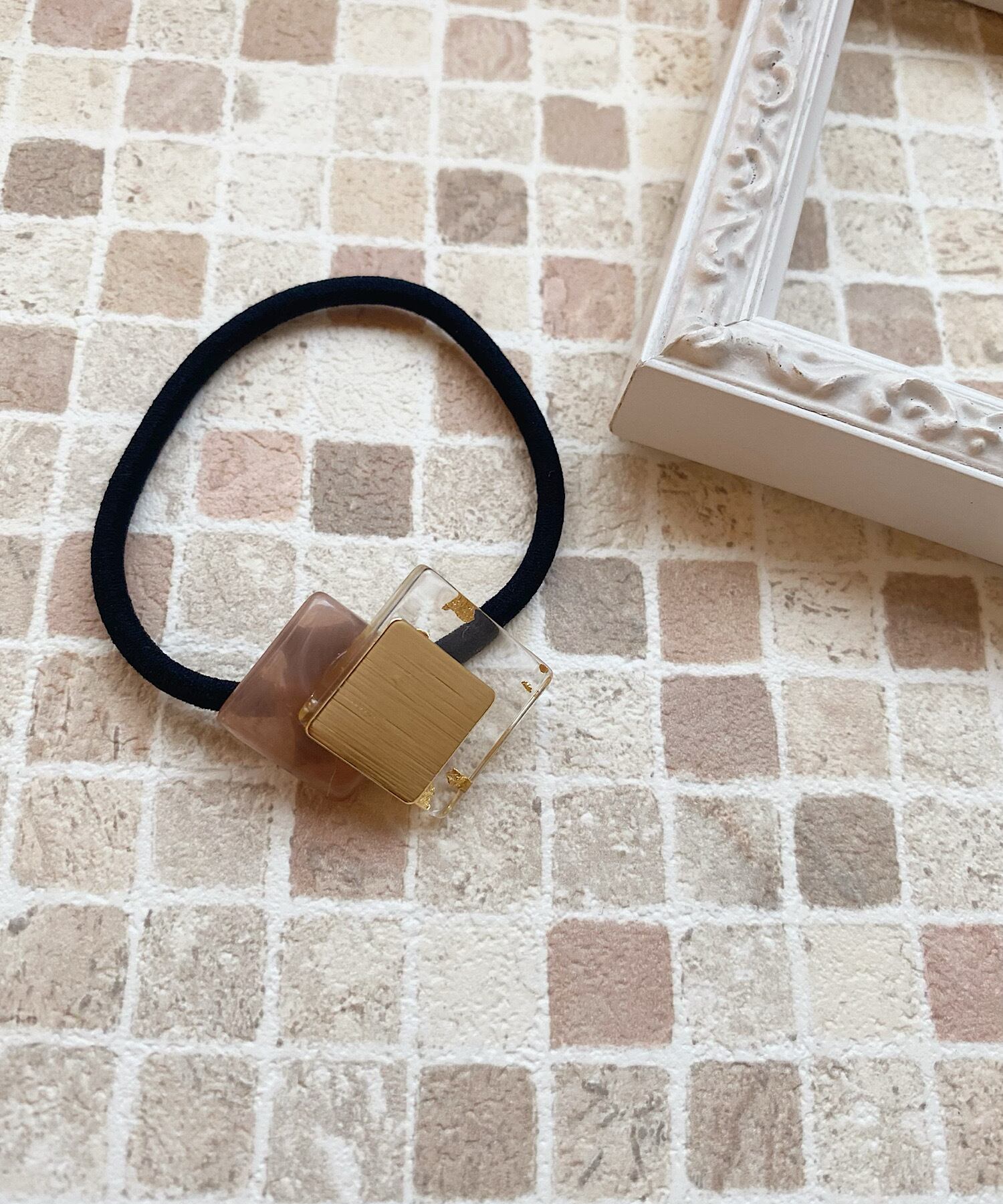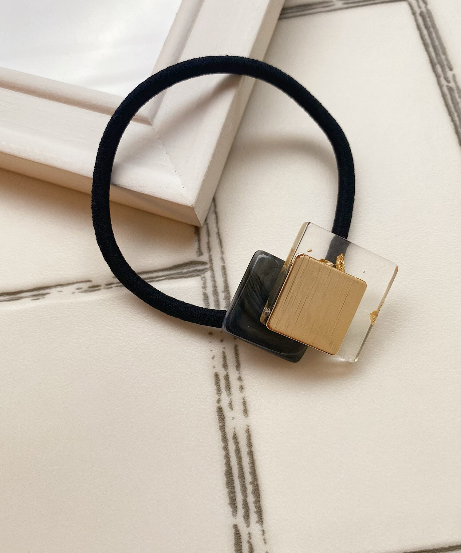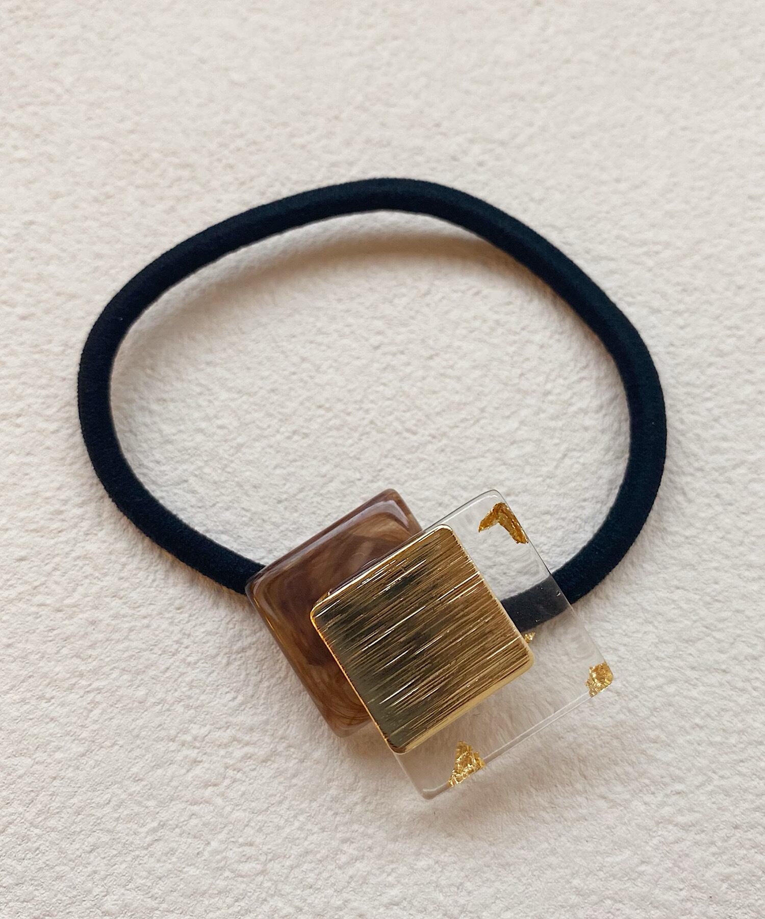 マーブルストーンに金箔が散りばめられたクリアパーツを組み合わせたヘアゴム。