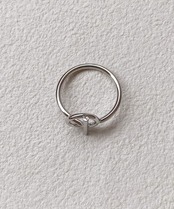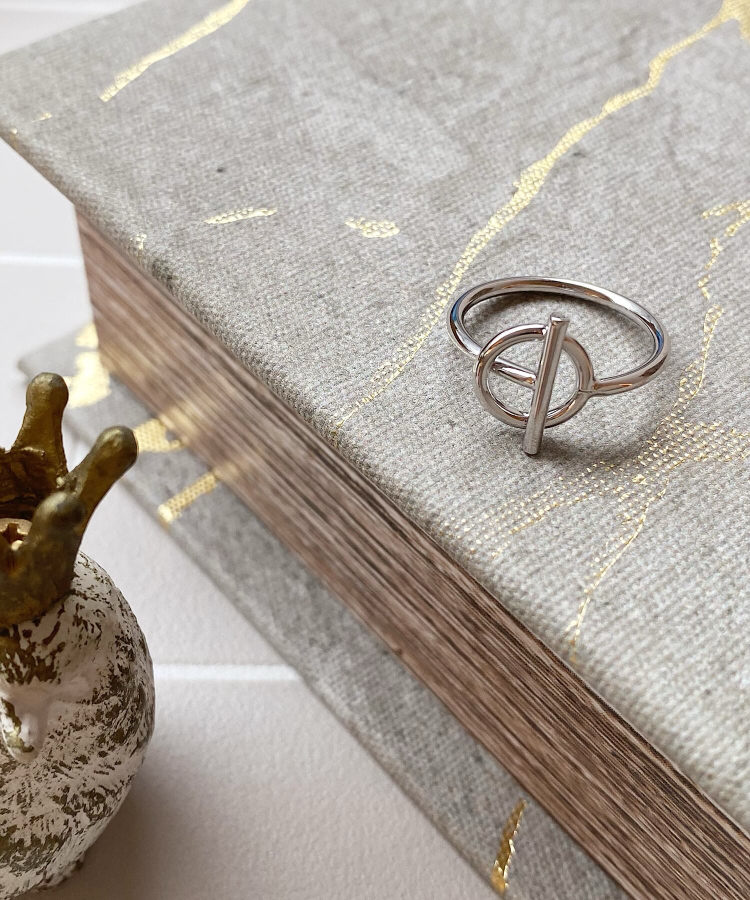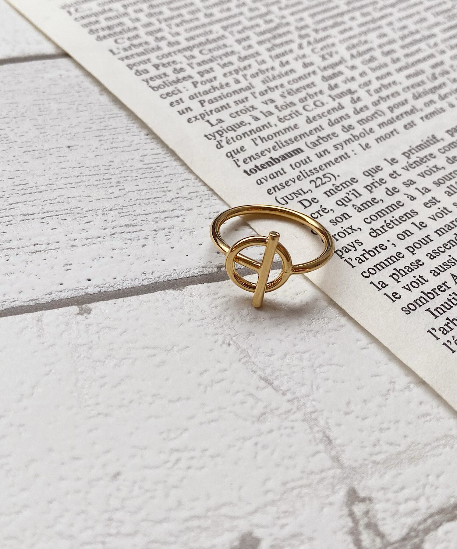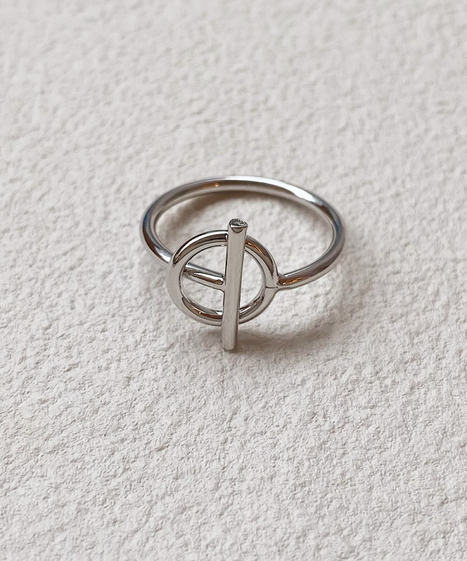 サークルとバーを組み合わせたようなデザインのメタルリング。