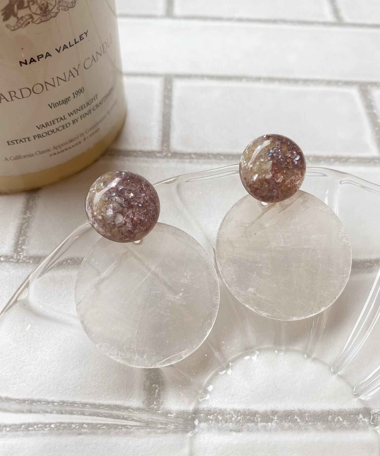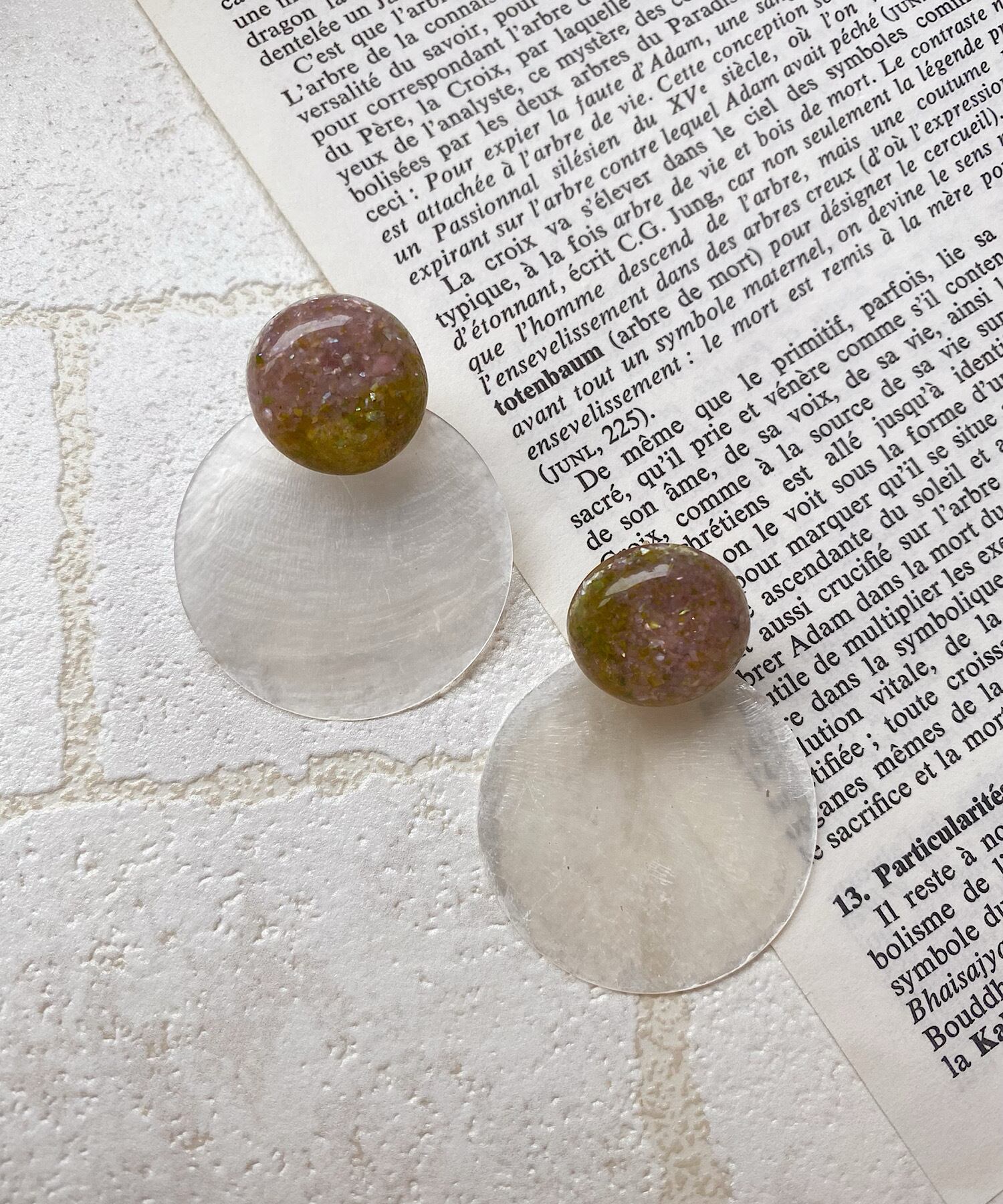 ラウンド型のストーンパーツとシェルパーツを組み合わせたピアス。