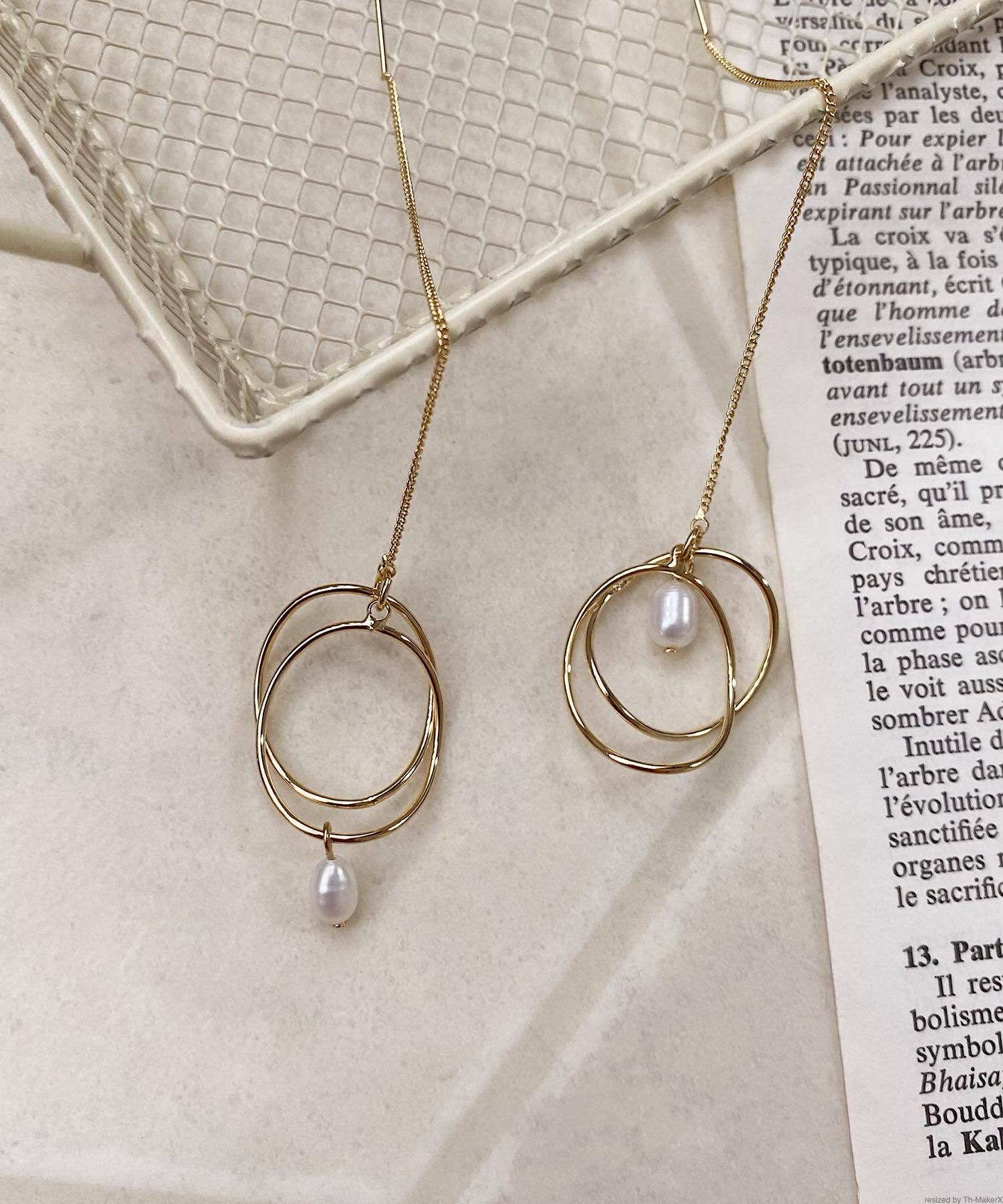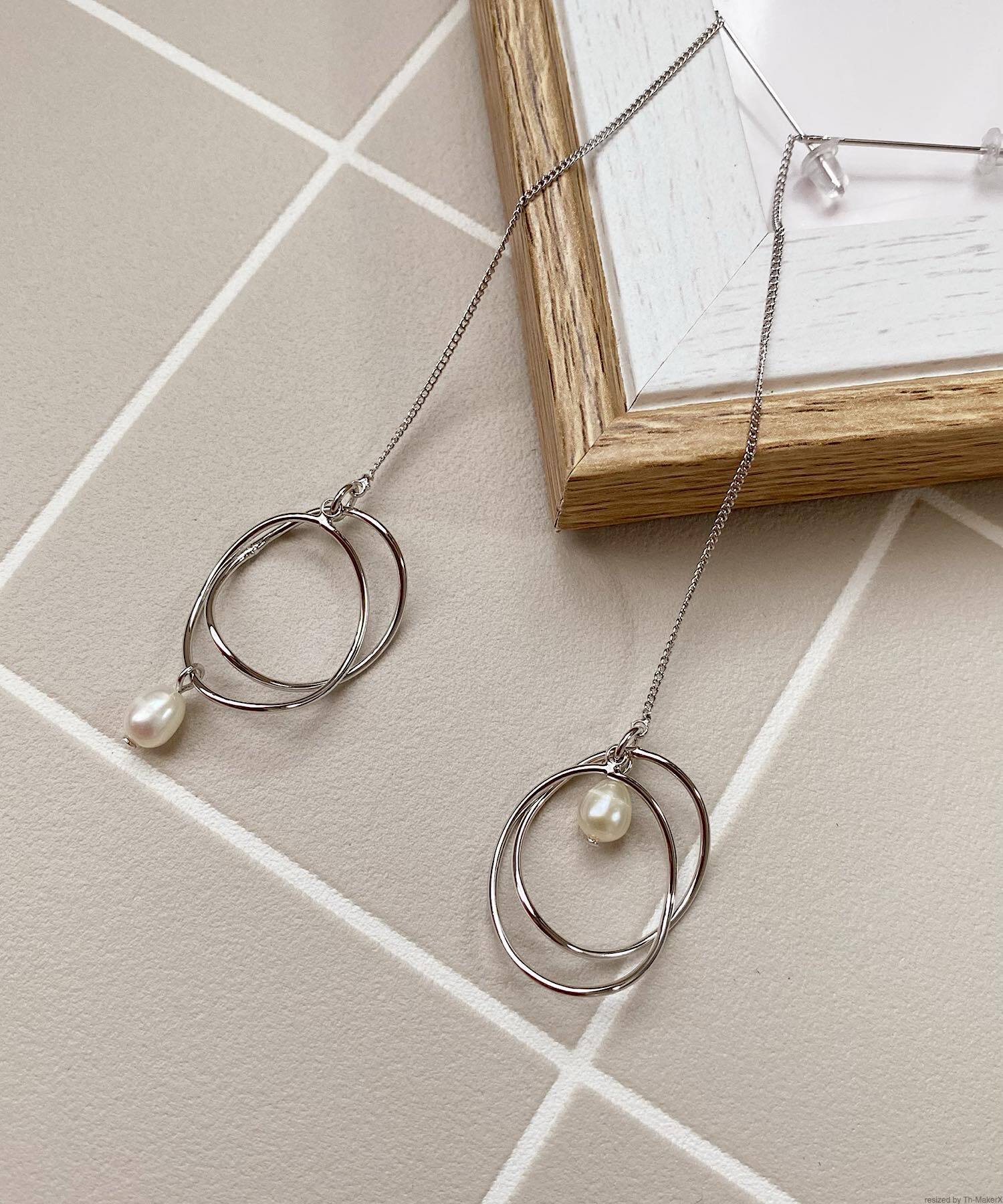 アシンメトリーデザインで、動くたびに重なったサークルパーツとパールが揺れて、お顔まわりを華やかにみせてくれるアイテムです。