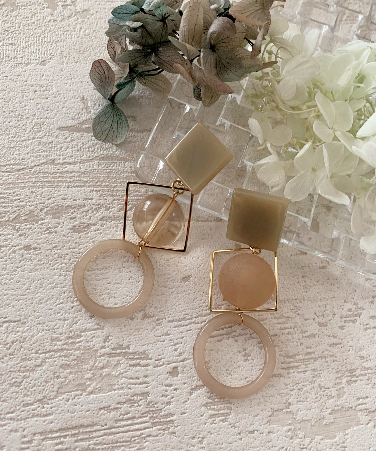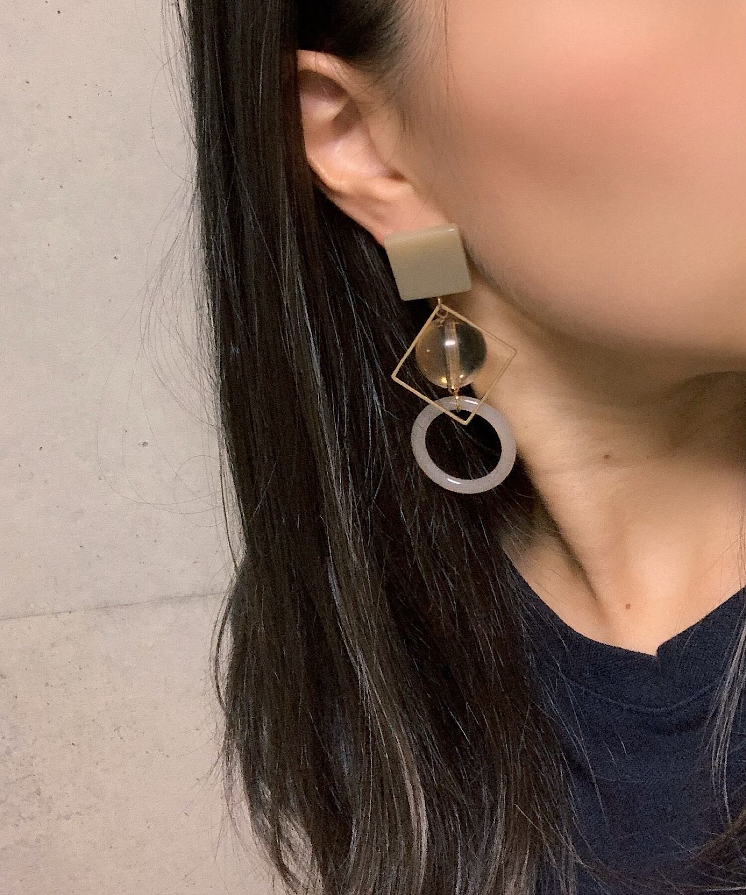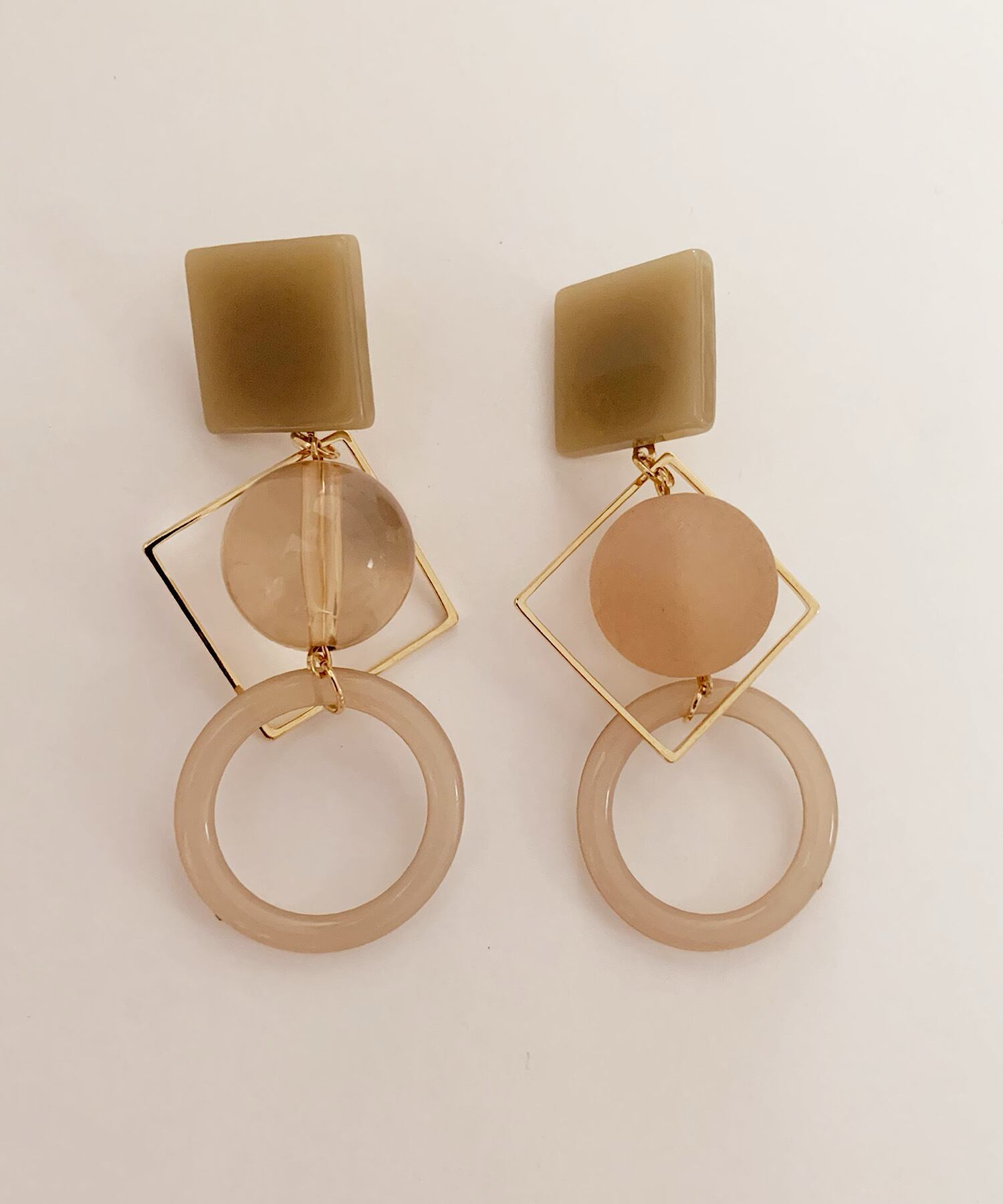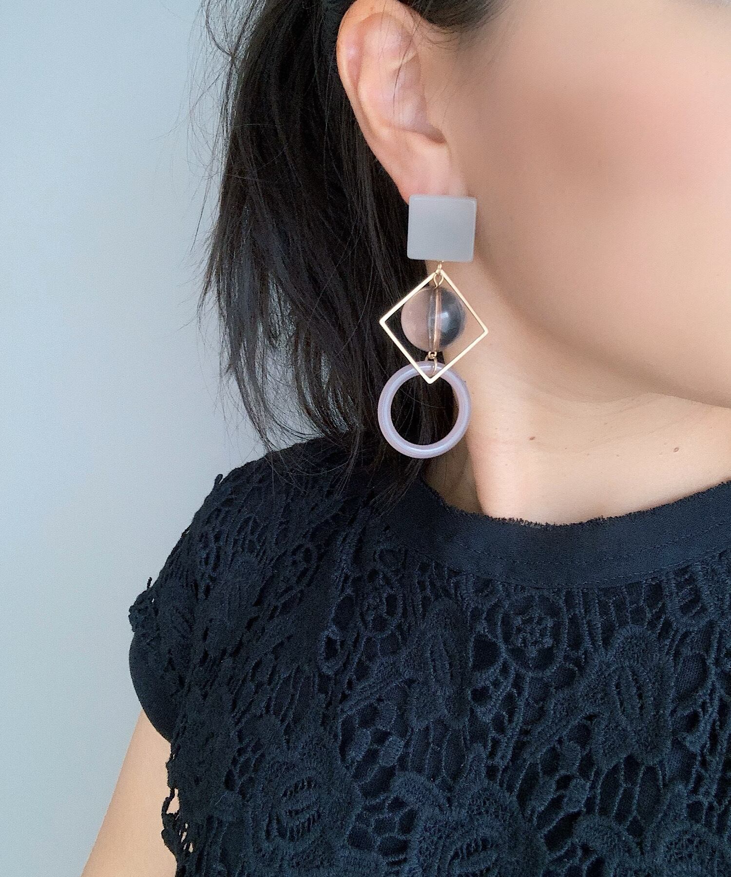 素材、形、テクスチャが異なりながらも、相性のよい組み合わせがお洒落なピアス。