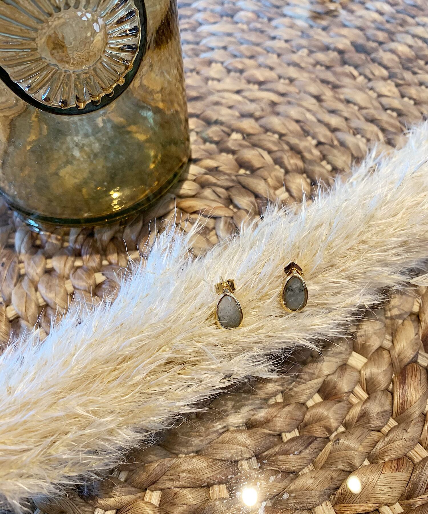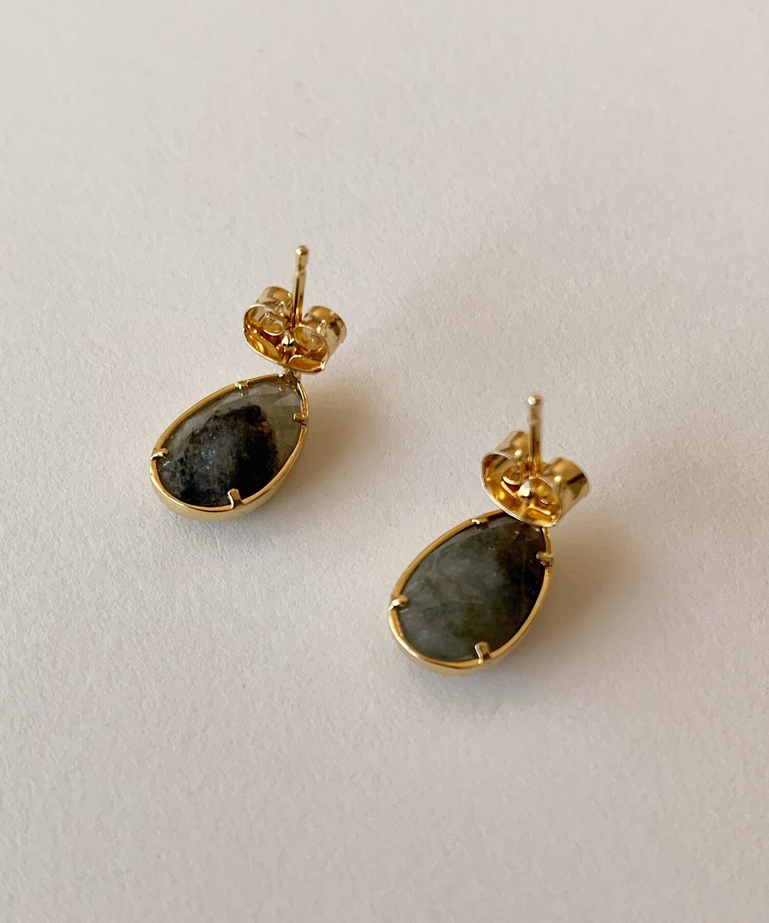 光の加減や見る角度によって見える色味が変化するラブラドライトを使用しています。