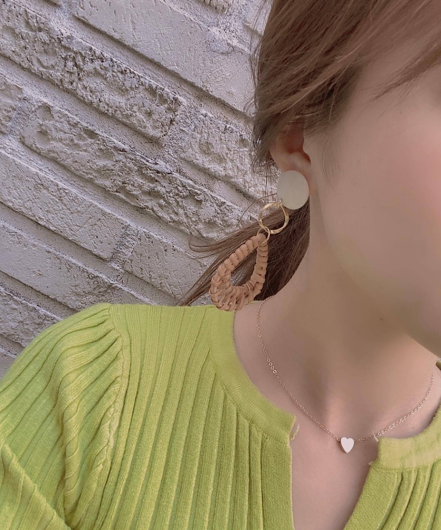 ラタン素材のパーツとカラーストーンを繊細なメタルフープで繋いだピアス。
