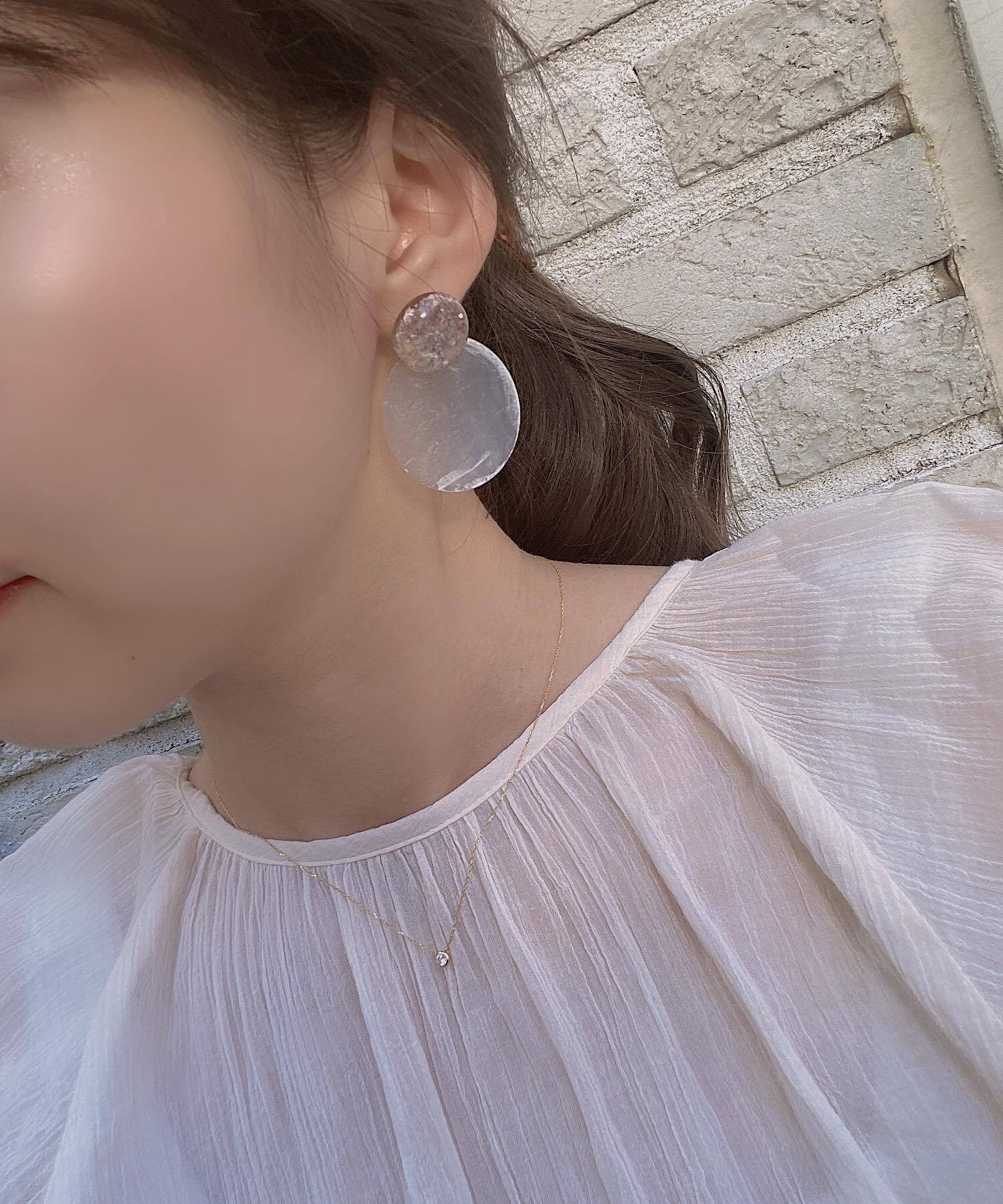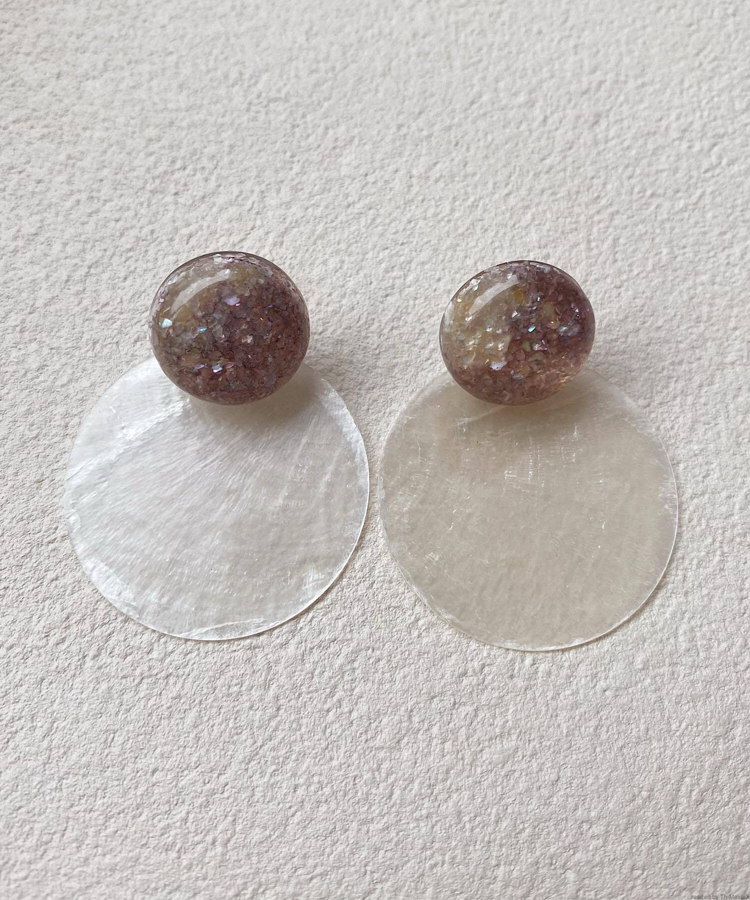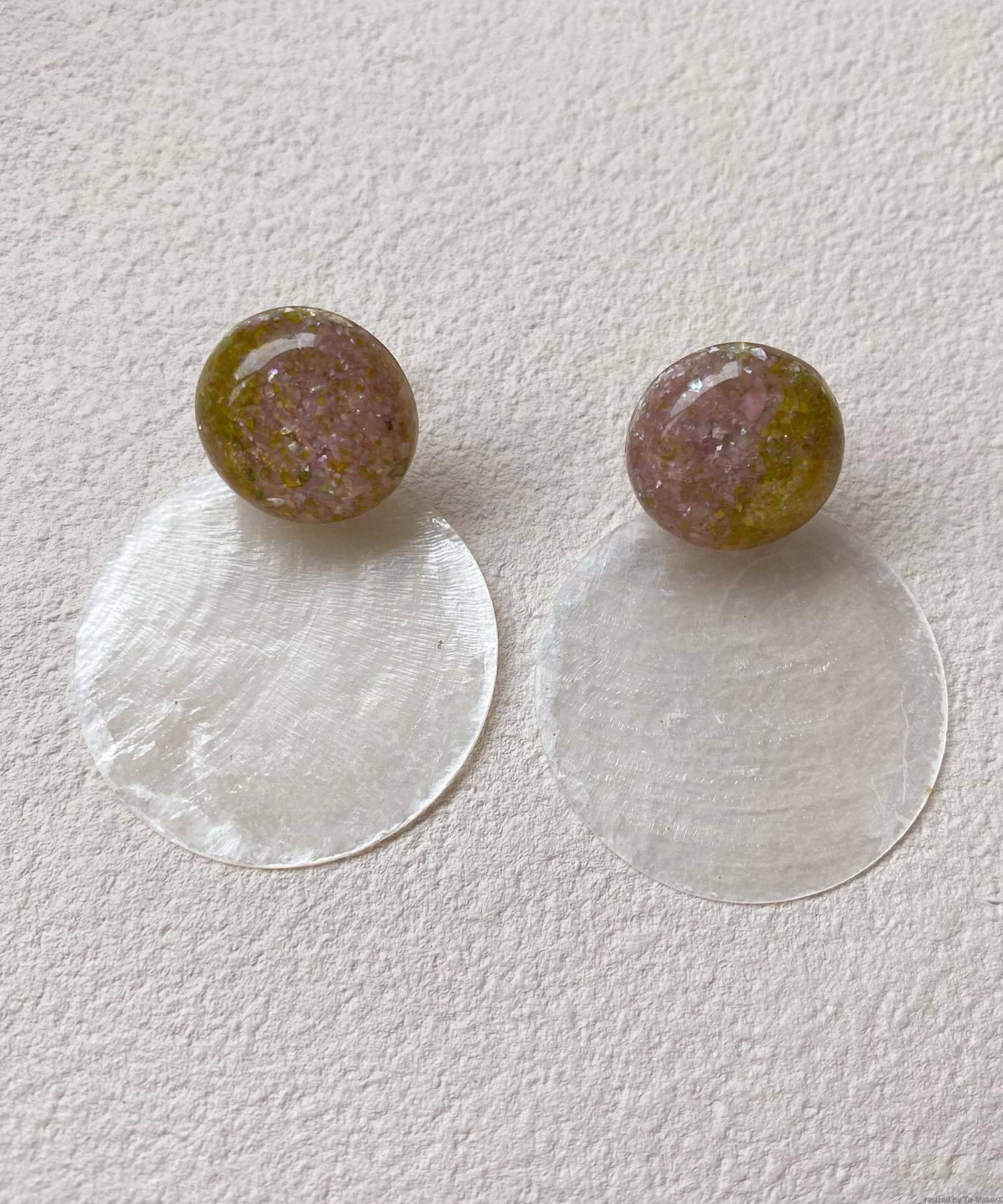 ラウンド型のストーンパーツとシェルパーツを組み合わせたピアス。